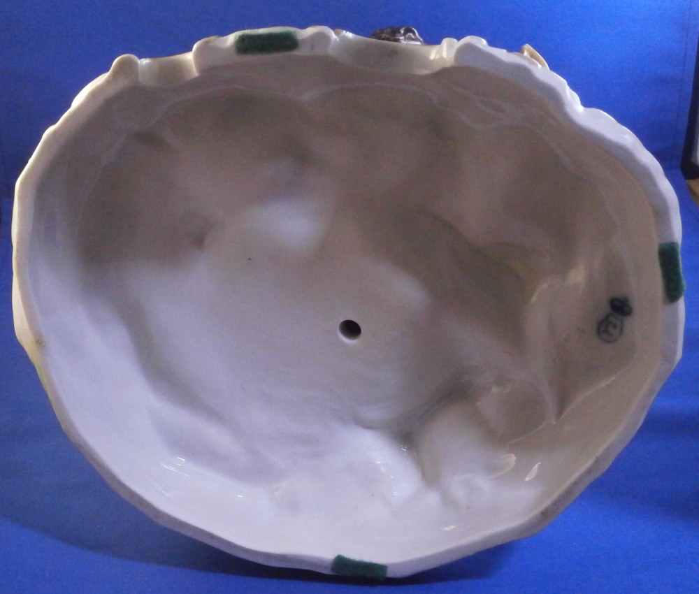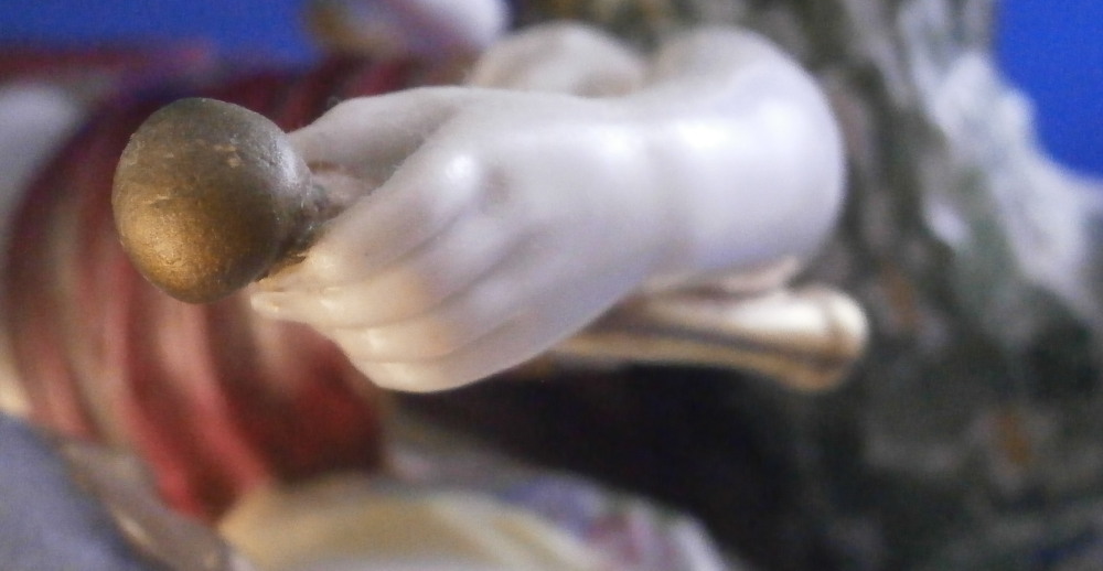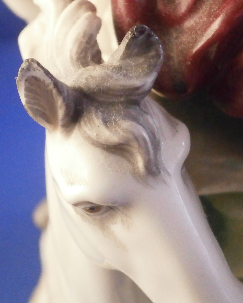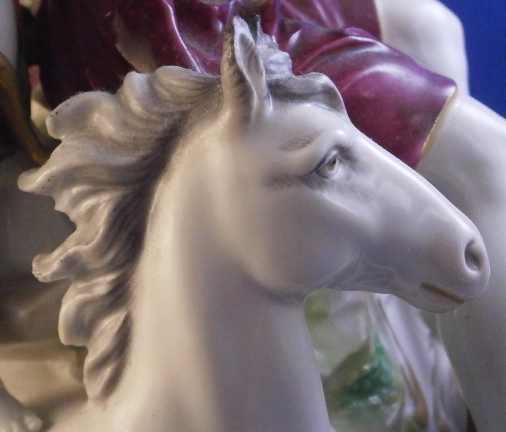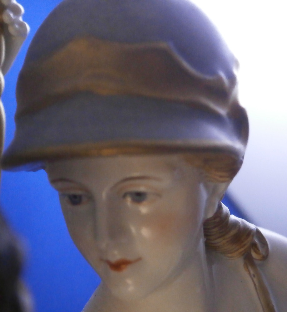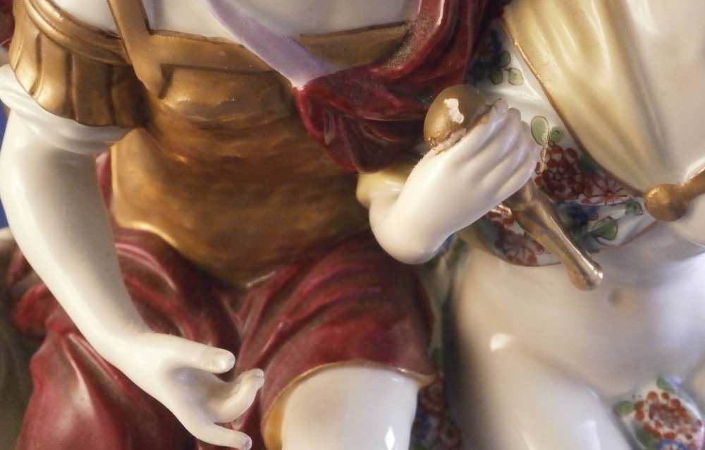 This is a nice and large figurine made by a German maker in the late 19th or early 20th century. Might be Passau or Bock Wallendorf. I could not find this exact mark but I am fairly sure it was made by one of these two makers byt the look of the piece. The figure is of a Roman soldier looking gentleman sitting next to a lady wearing a helmet with another helmet by his feet as well as a globe in front of them. There is a horse to his side and a putto behind him. Large tree in the back all on a nice base with some greenery painted on it and gold scrolls to the front. The style of the figure is older than the piece is. It looks great and is nicely modeled with lots of detail and hand painted quite nicely. The figurine displays nicely but has a few faults - the tip of the putto's bow as well as both tips of the scepters the other two are holding are dmaged and restored with an odd round top. The ears of the horse are chipped though that is not obvious at all. Damage to the leaves of the tree which is a given and possibly a branch tip or two. Hard to tell. All in all in very nice condition given the age and size and it displays very well. It's a nice figurine! Marked underneath with the script L in a shield under a crown in under glaze blue as shown. The piece is about 13.5 inches tall, 8.75 inches wide and 7.25 inches deep. Please email me for more information or photos.