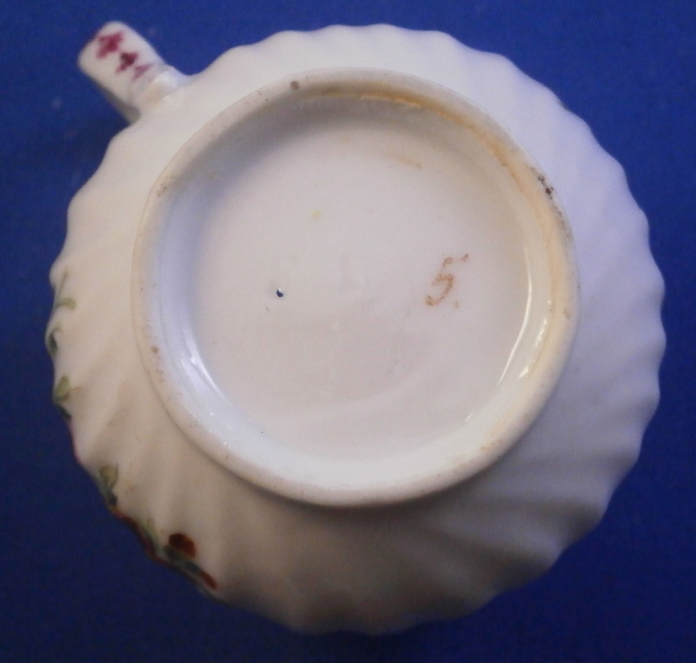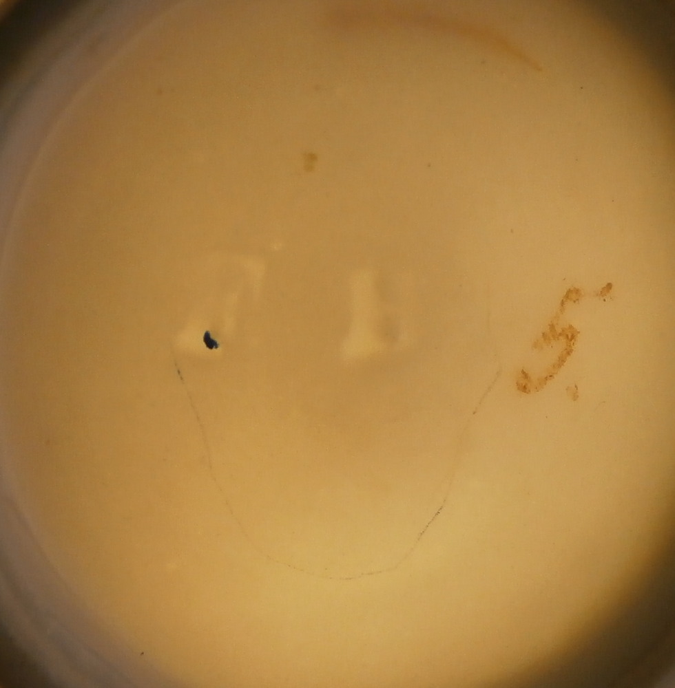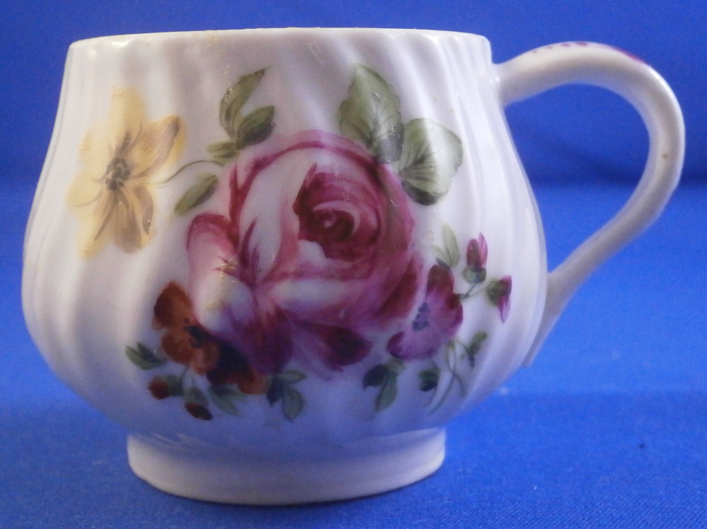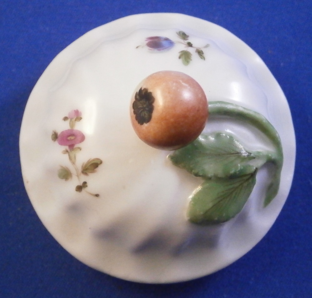 This is a really nice pot de creme or pot au jus made by an unknown maker in either Germany or Austria in the late 18th or possible earlier 19th century. It reminds me very much of the Royal Vienna pieces I own but the mark is not one I can figure out. The little lidded cup would have been used either for hot chocolate or a meat broth . Both the main cup and lid have a nice relief design to the paste and both are hand painted with some nice flowers - a large arrangement as well as a larger flower and three small ones to the cup as well as a two smaller flowers to the lid. Superb fruit finial to the lid including an apple I think with its stem and two leaves. A bit of puce trim to the handle. The set is in superb condition with a little bit of wear to the finial. It displays perfectly! The cup with the lid in place is 2.875 inches tall and 2.125 inches in diameter. The underside of the cup is marked with a number 5 as well as two imrpessed letters - an F and either a B or an H. That combo I could not find anywhere but it is certainly German or Austrian or from the countries under their rule at the time. Please email me for more information or photos.