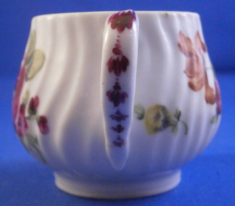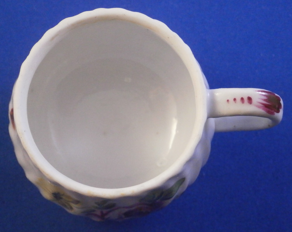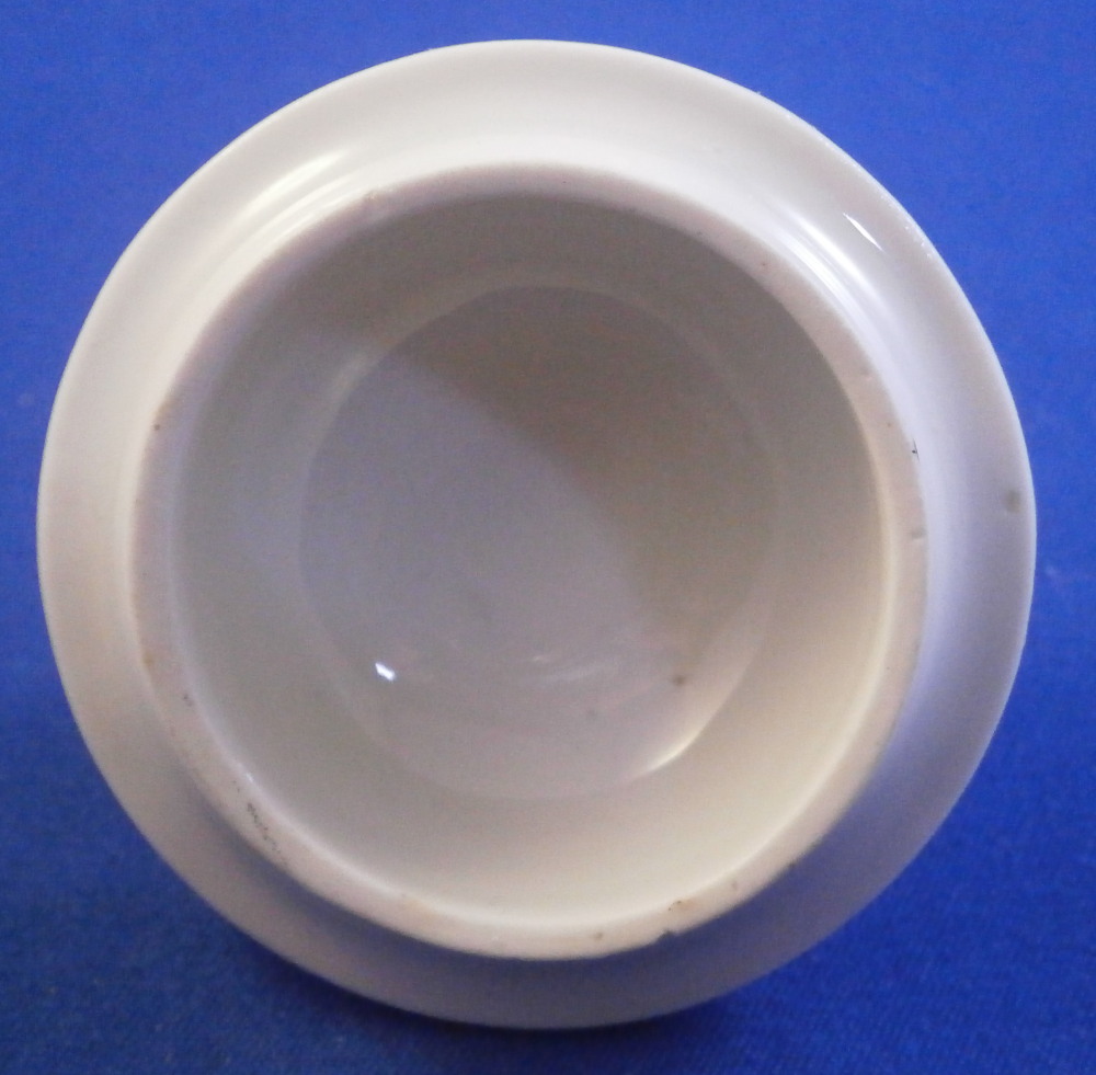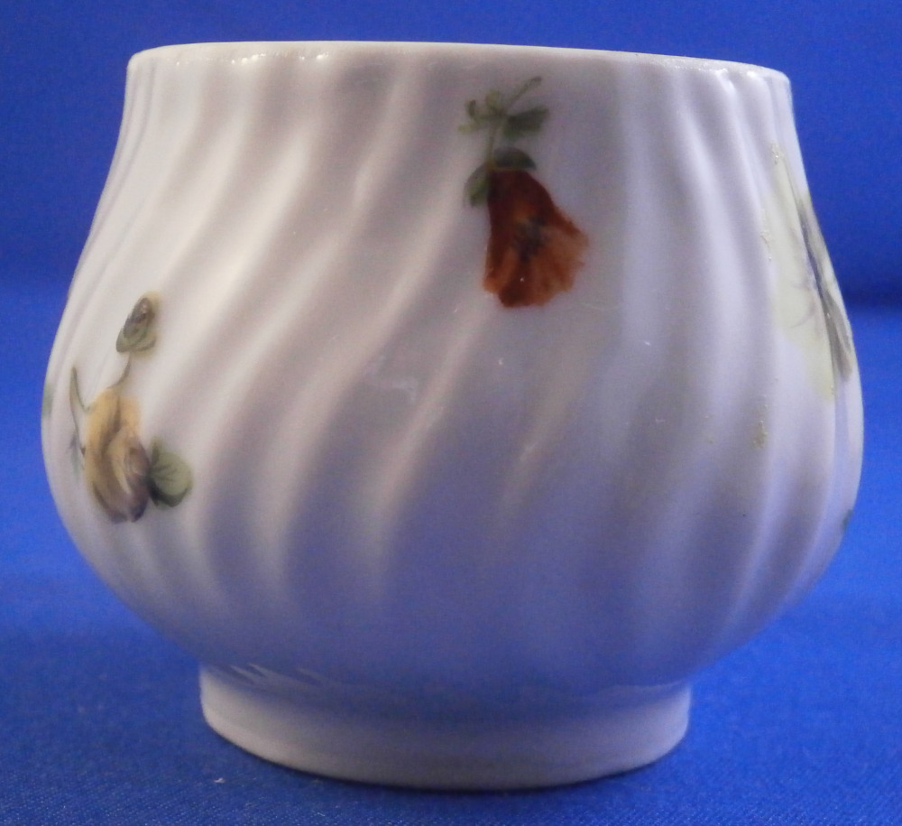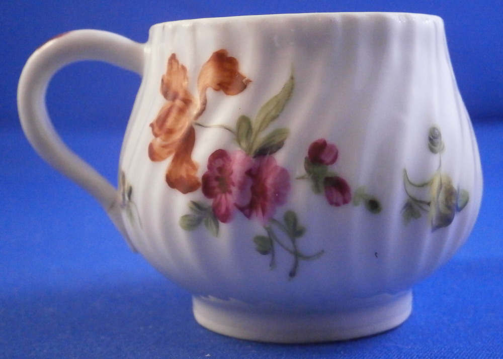 This is a really nice pot de creme or pot au jus made by an unknown maker in either Germany or Austria in the late 18th or possible earlier 19th century. It reminds me very much of the Royal Vienna pieces I own but the mark is not one I can figure out. The little lidded cup would have been used either for hot chocolate or a meat broth . Both the main cup and lid have a nice relief design to the paste and both are hand painted with some nice flowers - a large arrangement as well as a larger flower and three small ones to the cup as well as a two smaller flowers to the lid. Superb fruit finial to the lid including an apple I think with its stem and two leaves. A bit of puce trim to the handle. The set is in superb condition with a little bit of wear to the finial. It displays perfectly! The cup with the lid in place is 2.875 inches tall and 2.125 inches in diameter. The underside of the cup is marked with a number 5 as well as two imrpessed letters - an F and either a B or an H. That combo I could not find anywhere but it is certainly German or Austrian or from the countries under their rule at the time. Please email me for more information or photos.