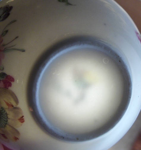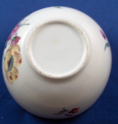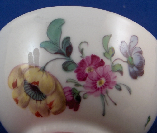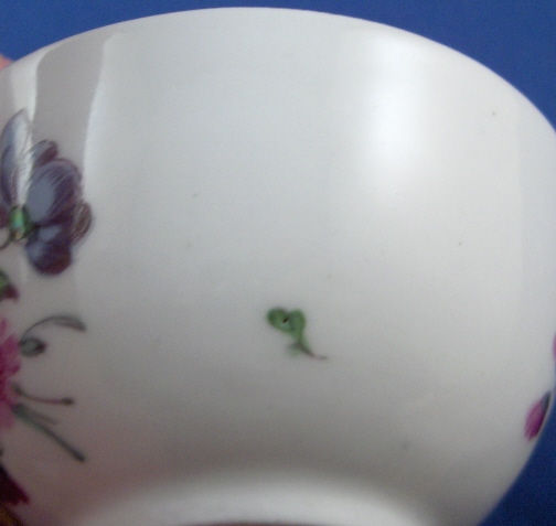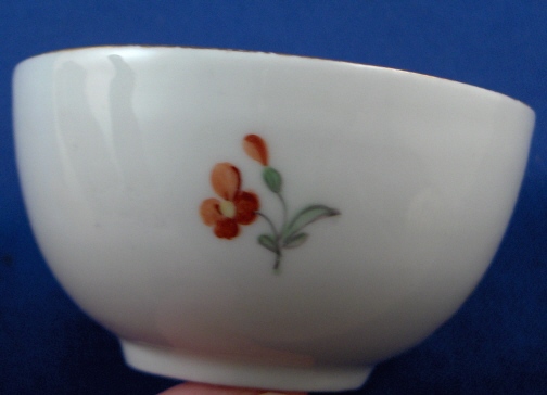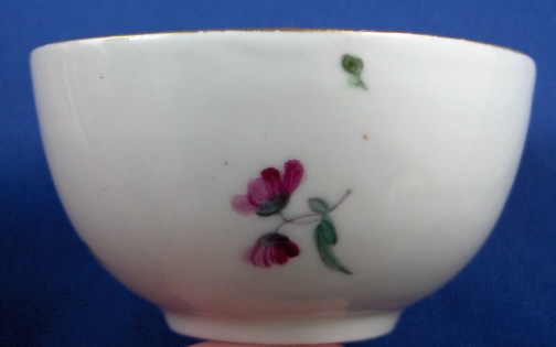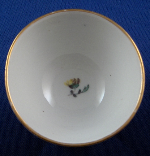 This is a superb cup made by a German maker around 1780. It is very likely by Ludwigsburg with a small maybe by Hoechst. Either way it is nicely handpainted with a floral arrangement on one side, two small flwoers on the other side, one small flwoer on the inside and two leaves to hide firing spots. Nice gold trim to the top rim. The cup is not really marked only with a small circle or o and maybe a number but that is hard to see. I have seen the circle mark on Ludwigsburg and the painting style fits as well so it is probably by them. The cup is 1.5 inches tall and 2.75 inches in diameter. It is in great condition with just a tiny bit of wear to the gold trim. Please email me for more information or photos.