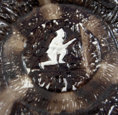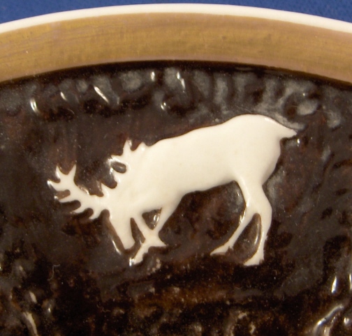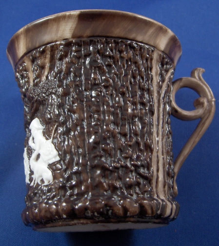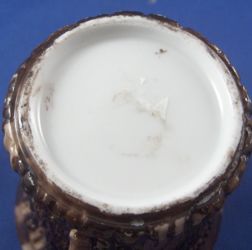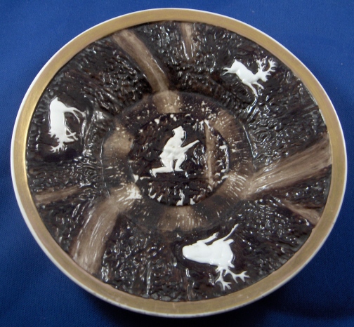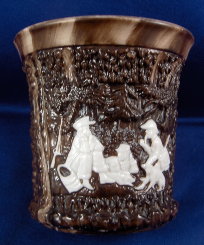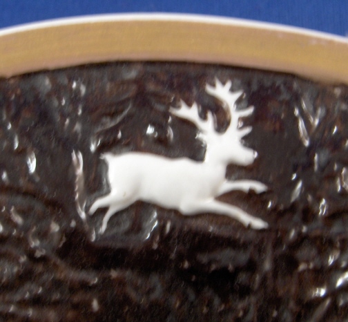 This is a cup and saucer set made in Germany in the mid 19th century. I finally found another set marked with an impressed TK mark for Thun Kloesterle so this mystery is finally solved. The cup and saucer are of superb quality and it certainly stands out from the crowd. The set is decorated with a rough surface painted to look like the antlers of a deer, has a gold trim and a few hunting related relief scenes in white. The cup is 3.25 inches tall and 3.25 inches in diameter. The saucer is 1 inch tall and 6 inches in diameter. The set is in great condition with a little wear to the gold trim and the center well of the saucer. Please email me for more information or photos.