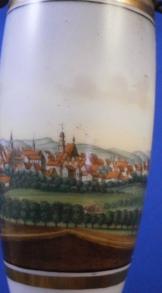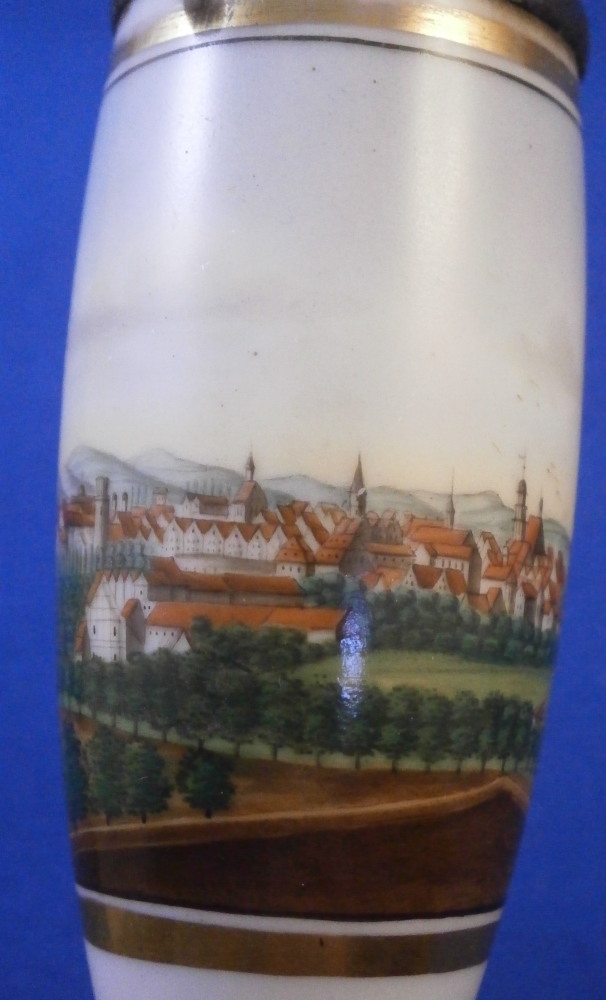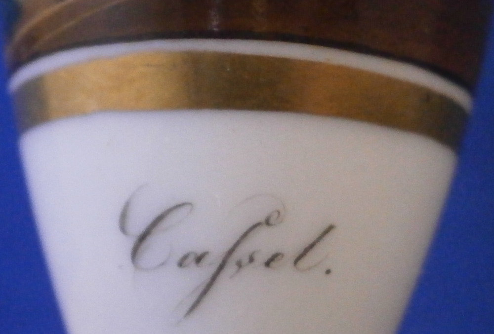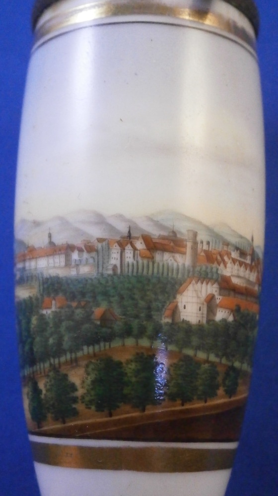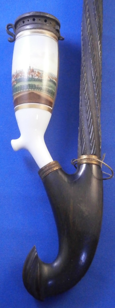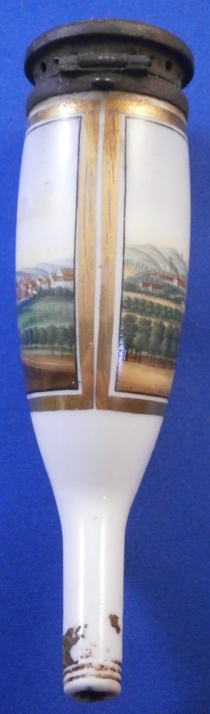 This is a pipe bowl made most likely by Nathusius of Althaldensleben or possibly Ilmenau in the first half of the 19th century. The porcelain pipe bowl is hand painted with a superb scene of the German city of Kassel (spelled Cassel until the early 20th century and written here with the old style s that looks like an f). The scene is very nice and goes almost all around the bowl. It is edged with a thin black line trim and then a thicker gold frame. Name of the scene in black script underneath. It still has its original lid which could use a cleaning. The pipe is marked with the under glaze blue line mark on the bottom of the stem as shown. The pipe is 4.75 inches tall including the lid and has a diameter of 1.25 inches. The piece is in great condition with just a touch of wear to the gilding and it was used so could use a cleaning to the lid and inside. The pipe comes with possibly the nicest stem I have seen. Made of horn with brass rings that are amazingly still all present. The only issue is the flexible part covered by cloth is damaged but that is quite often the case and could be fixed easily. The horn part are in amazing shape. The entire pipe is about 15 inches tall. Please email me for more information or photos.