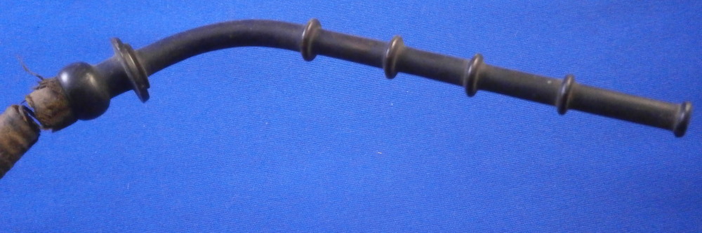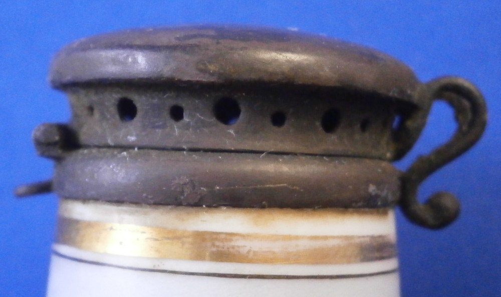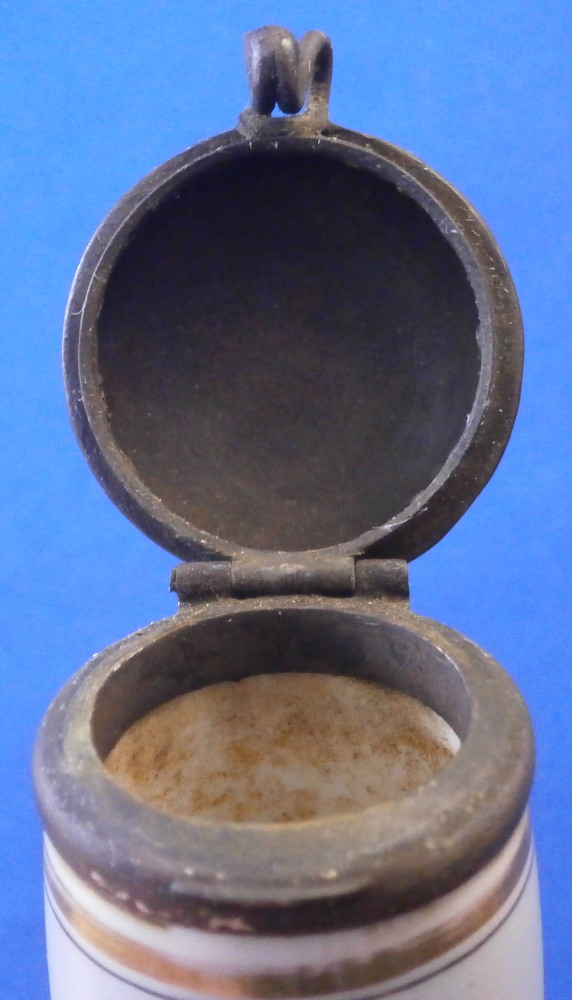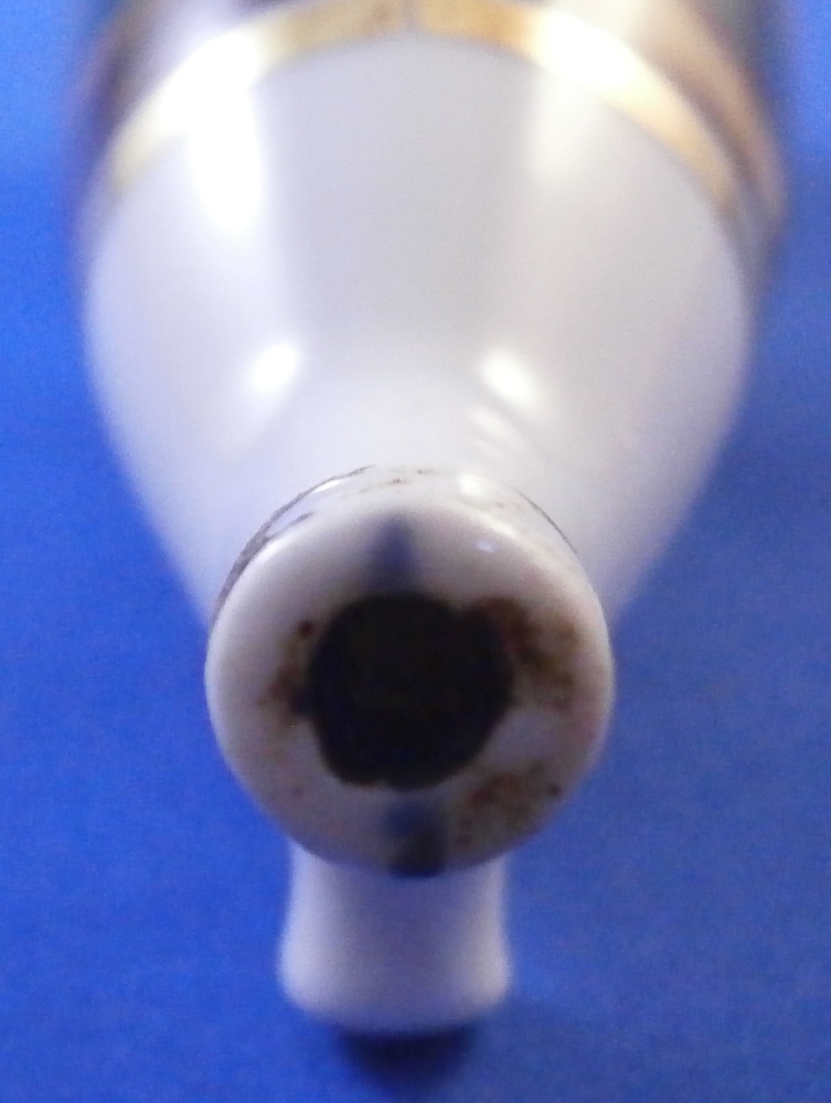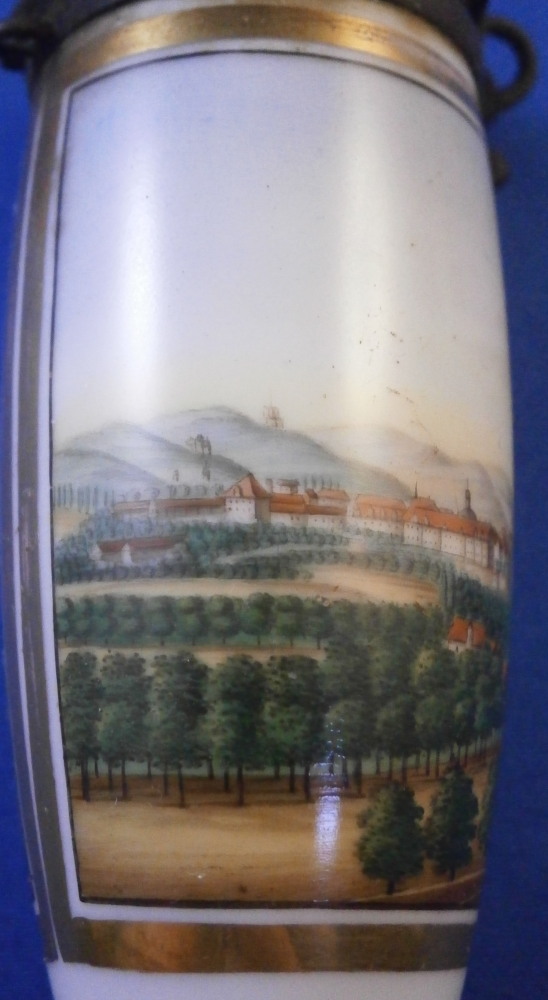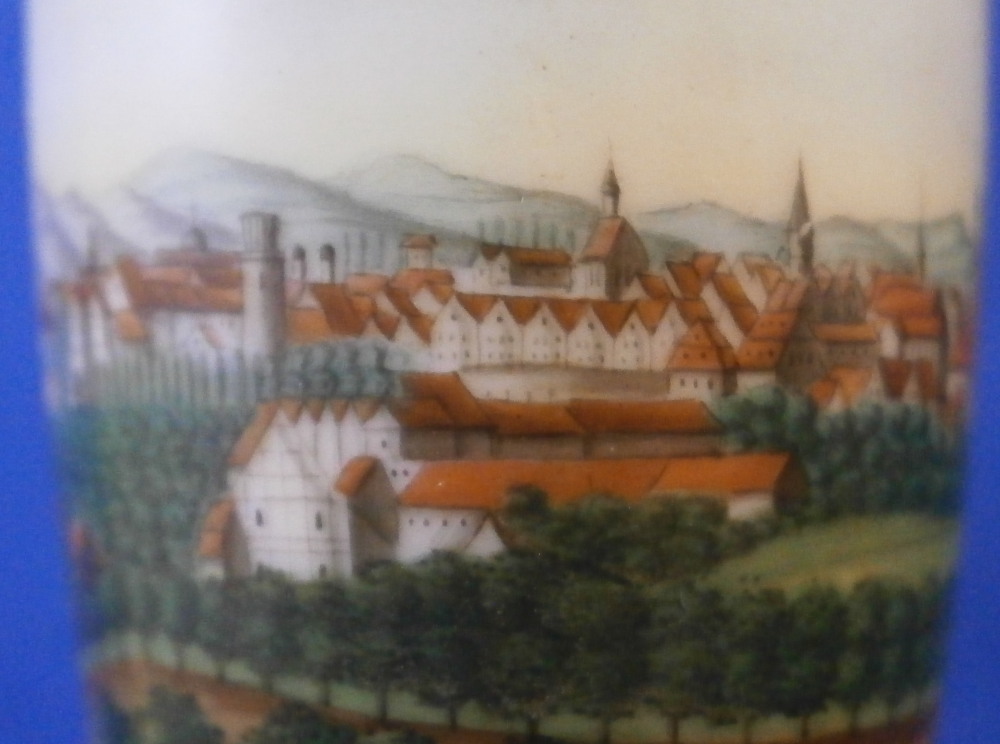This is a pipe bowl made most likely by Nathusius of Althaldensleben or possibly Ilmenau in the first half of the 19th century. The porcelain pipe bowl is hand painted with a superb scene of the German city of Kassel (spelled Cassel until the early 20th century and written here with the old style s that looks like an f). The scene is very nice and goes almost all around the bowl. It is edged with a thin black line trim and then a thicker gold frame. Name of the scene in black script underneath. It still has its original lid which could use a cleaning. The pipe is marked with the under glaze blue line mark on the bottom of the stem as shown. The pipe is 4.75 inches tall including the lid and has a diameter of 1.25 inches. The piece is in great condition with just a touch of wear to the gilding and it was used so could use a cleaning to the lid and inside. The pipe comes with possibly the nicest stem I have seen. Made of horn with brass rings that are amazingly still all present. The only issue is the flexible part covered by cloth is damaged but that is quite often the case and could be fixed easily. The horn part are in amazing shape. The entire pipe is about 15 inches tall. Please email me for more information or photos.