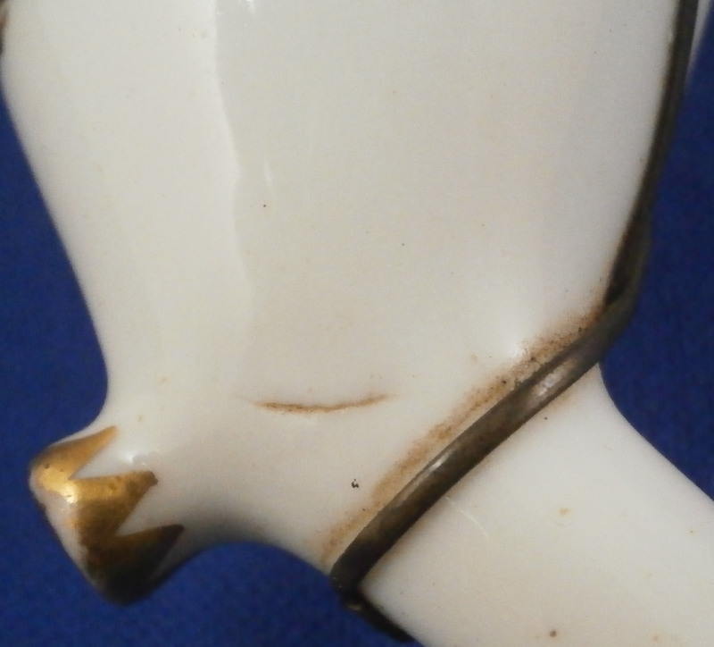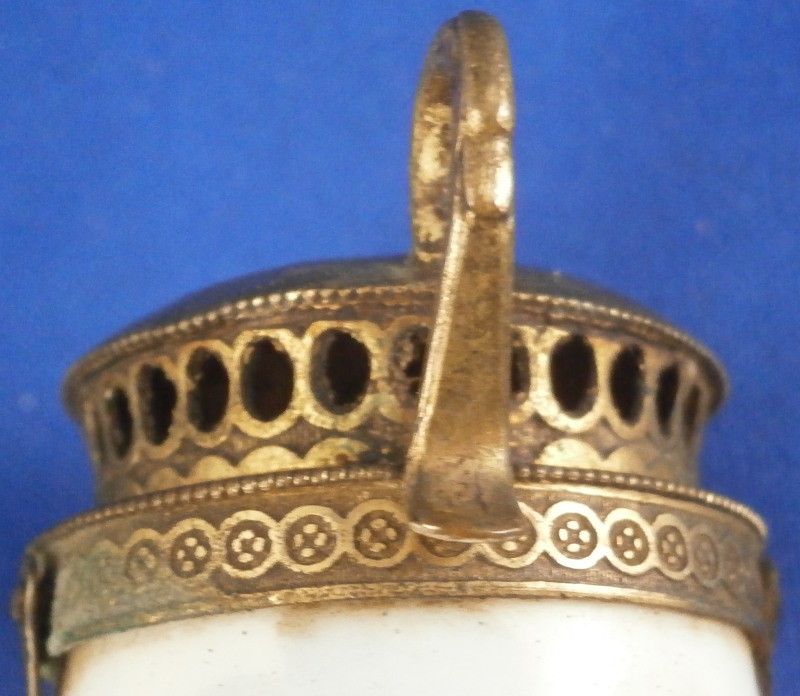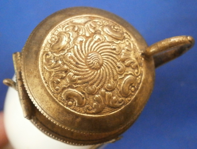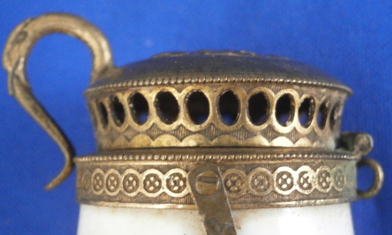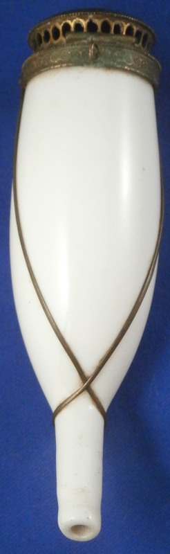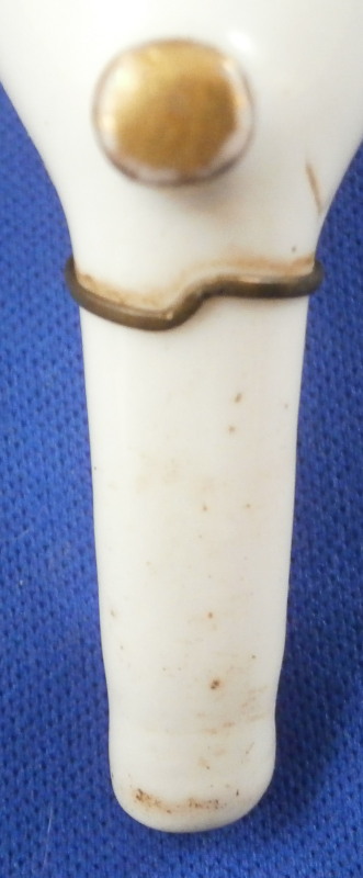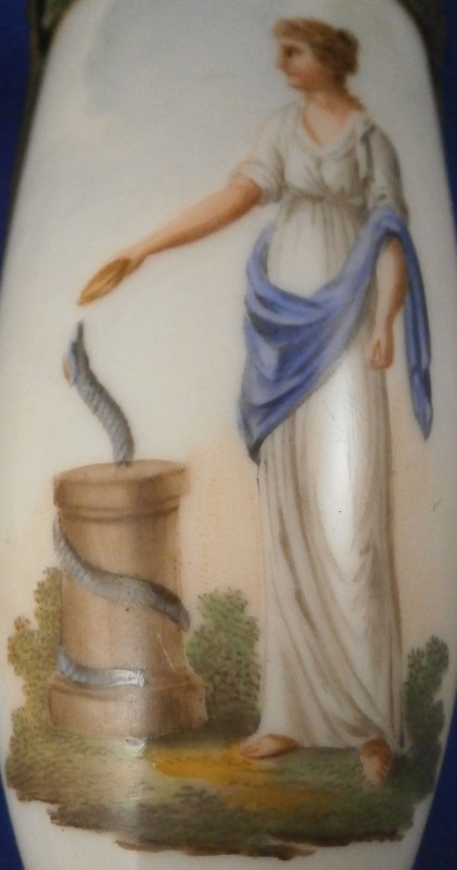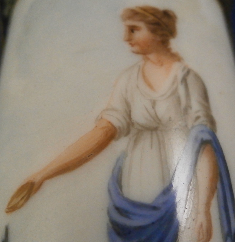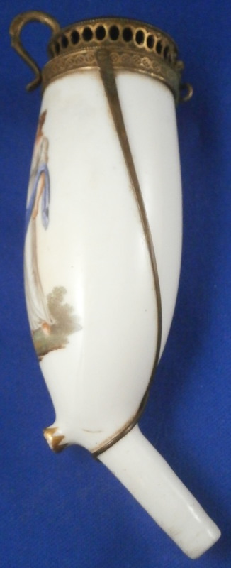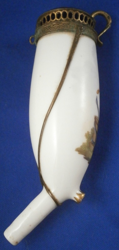 This is a fun porcelain pipe bowl definitely made in Germany and quite likely in the Thuringia area by one of the top makers in the early 19th century. It is hand painted with nicely detailed scene of a lady holding out a bowl towards a snake that is coming up a small column with a bit of a landscape around the bottom part and light clouds in the background. The porcelain is in superb condition with a tiny bit of wear to the gilding of the little knob that sticks out the front and a firing issue near that were the glaze didn't take - looks kind of like a shallow firing crack. The lid has a tiny bit of oxidation but nothing bad at all and could easily be cleaned up back to it's original shiny self. The pipe has been heavily smoked but I cleaned the worst of it out on the inside. The lid which is very detailed as I tried to show in the pictures and it is held in place in a very neat way which shows us that it is a very early example. I have only ever seen that once before on a dated pipe I owned from about 1817 so I would date this to the same time period. The porcelain piece is 4.375 inches tall with the metal lid being about 0.625 inches. The widest diameter is about 1.5 inches and the bottom diameter is about 0.375 inches. It is unmarked which is a bummer but it is very common. Just makes it hard to ID the exact maker. Please email me for more information or photos.
