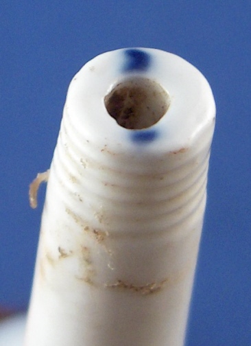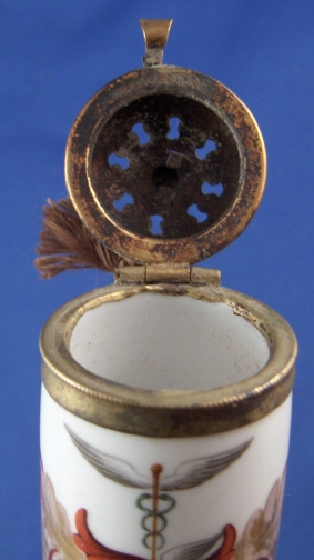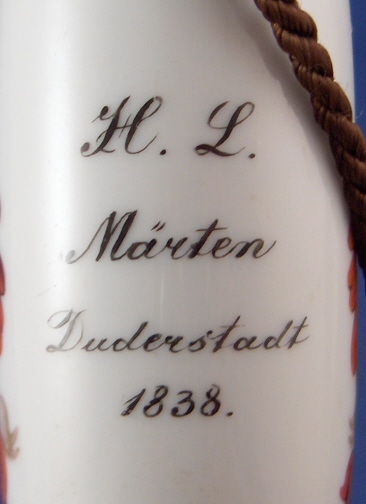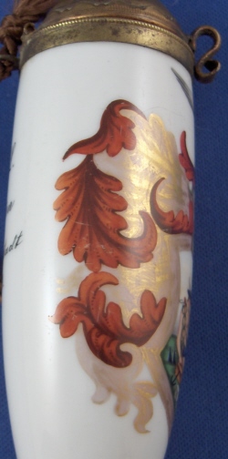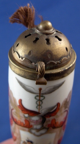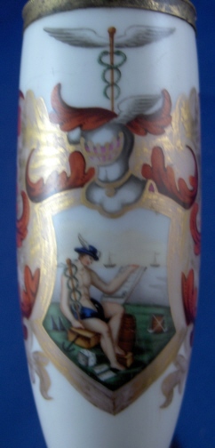 This is a porcelain pipe bowl made in Germany in about 1838. The bowl is handpainted with what seems like an armorial but in the center is the god Mercury with surrounded by things that represent what he stands for like ships, money, a message and a medical staff. I saw another pipe like this recently that was for the guild of salesmen and apparently Mercury was the protector of salesmen as well so it fits. The pipe is in great condition with wear to the gilding and a little oxidation to the lid but minor. The pipe is marked underneath the bottom inlet with a blue line often said to be by KPM but also used by Ilmenau I believe. The other side says H.L. Maerten Duderstadt 1838. It is 5.75 inches tall and 1 inch in diameter. Please e-mail me for more information or photos.