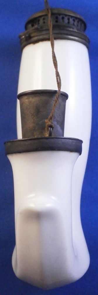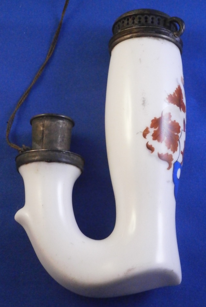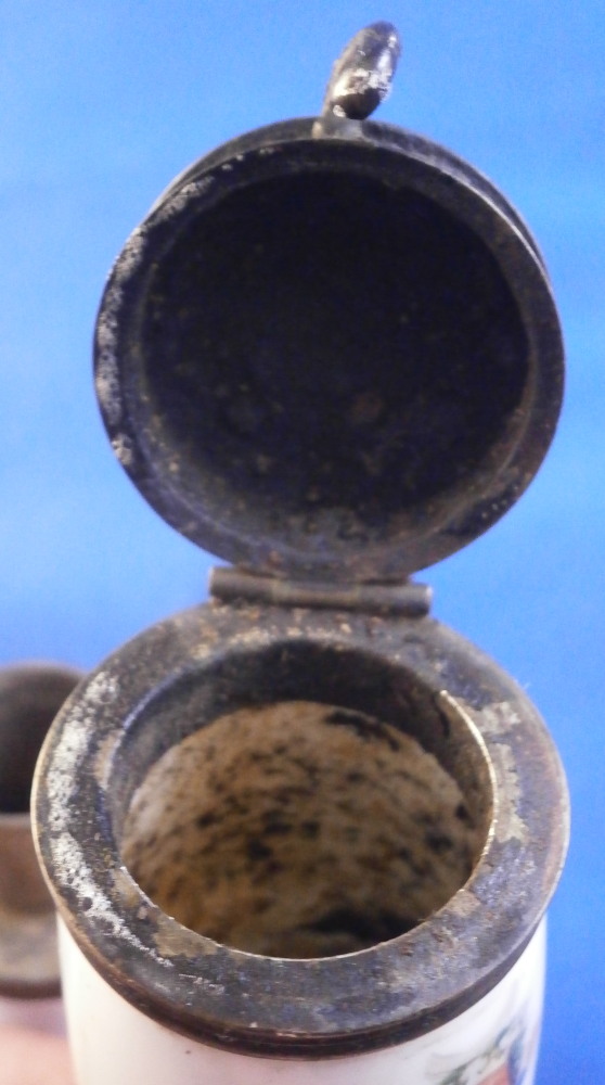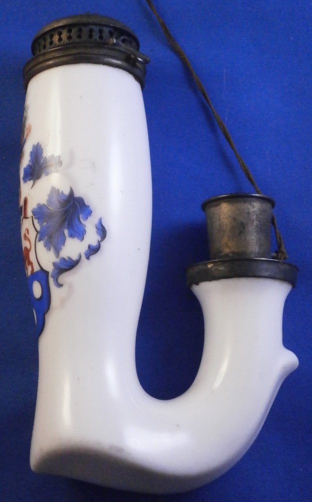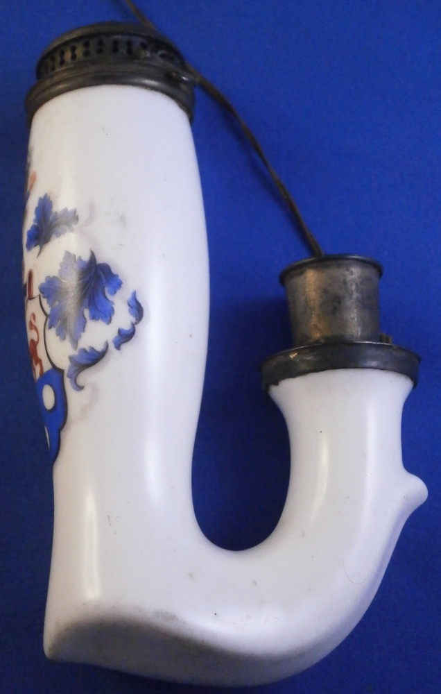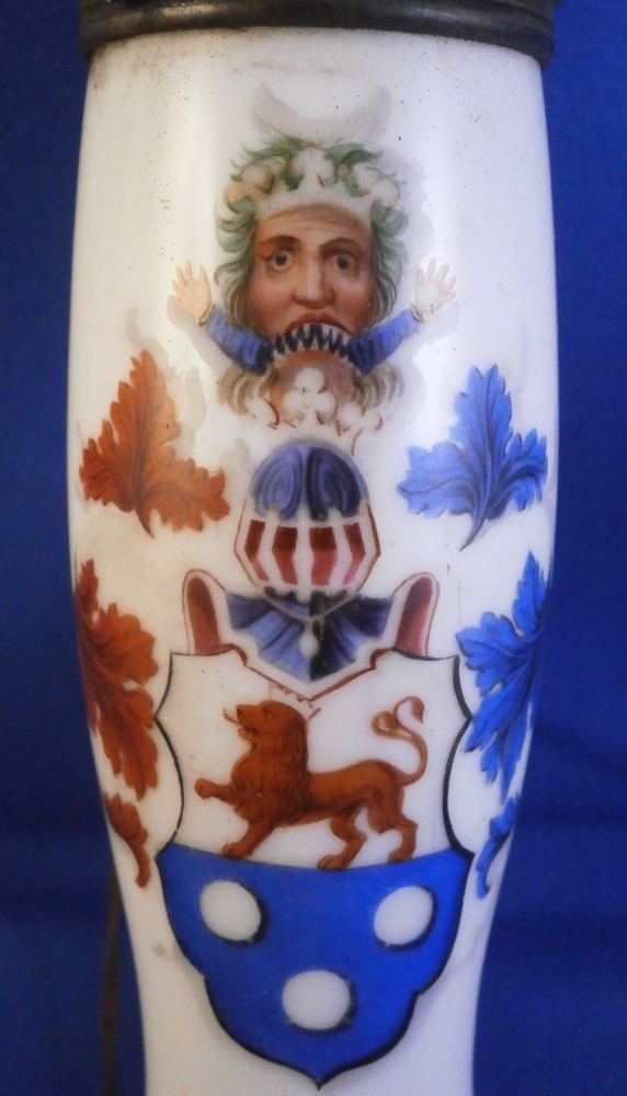 This is a porcelain pipe bowl made in Germany in the early to mid 19th century. The bowl is hand painted with what an armorial to the front including this funny little man to the top part. It has its metal mounts still attached. Not sure if they are silver or silverplate since they are so oxidized but they are in good condition and could be cleaned. The piece holding the lid closed is bent as shown. There is a monogram to the top of the lid of a low nobility crown over the letters MCO I think. The pipe is in great condition with wear to the gilding of the armorialand some fine scratches to the glaze of the white area but it displays well and is a nice early example and an unusual shape. It was heavily smoked and is dirty on the inside. Maybe someone knows this armorial and we could figure out the original owner. That would be neat! The pipe is unmarked as to the maker of the porcelain. It is 5.125 inches tall and 1.5 inches in diameter and 2.875 inches deep. Please e-mail me for more information or photos.