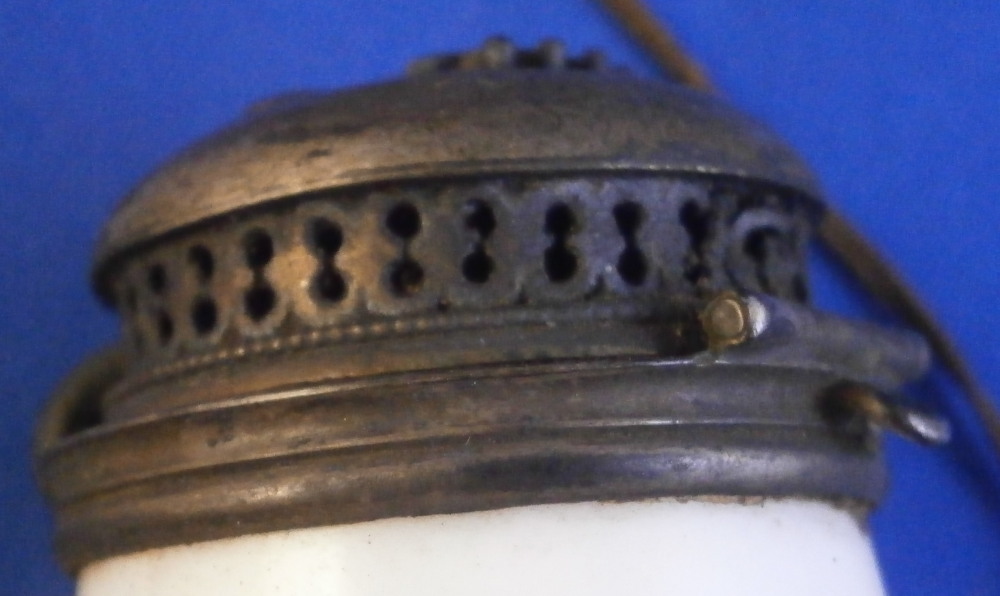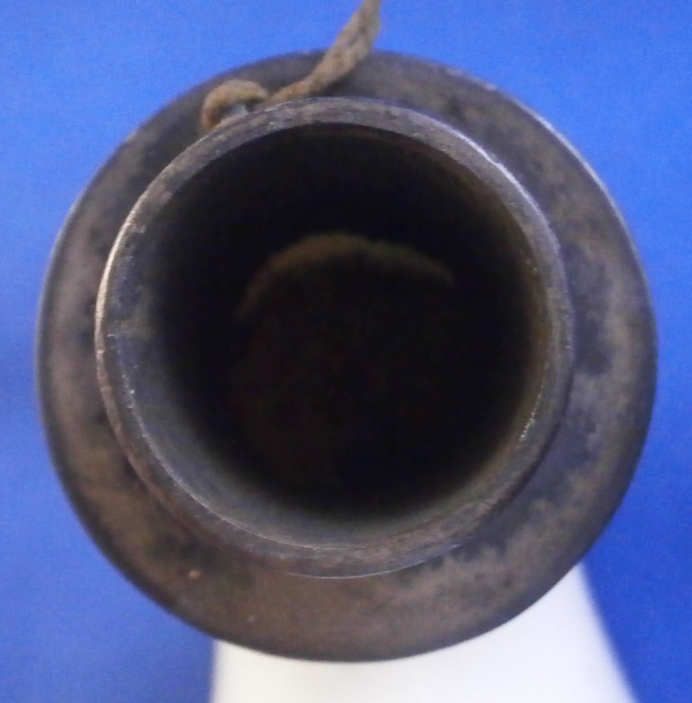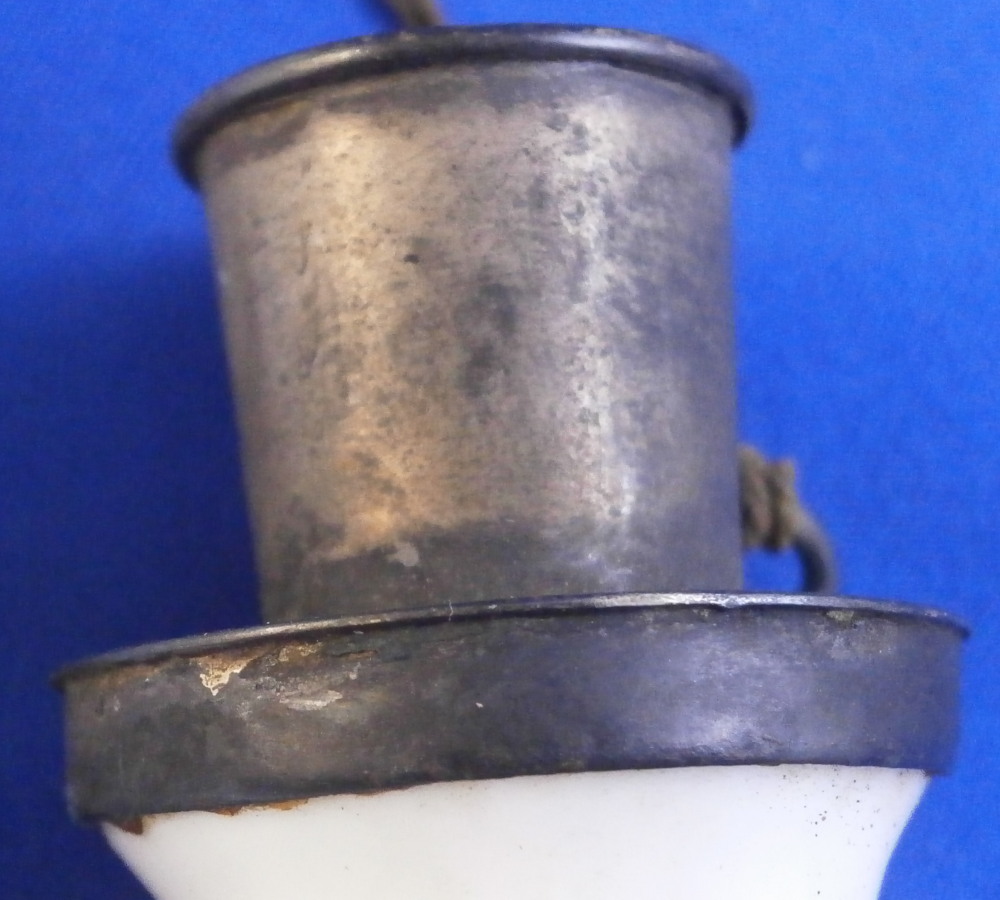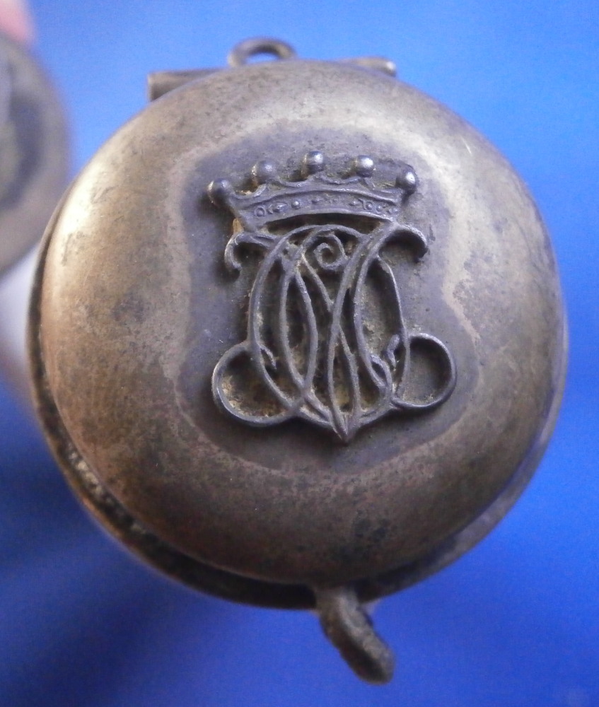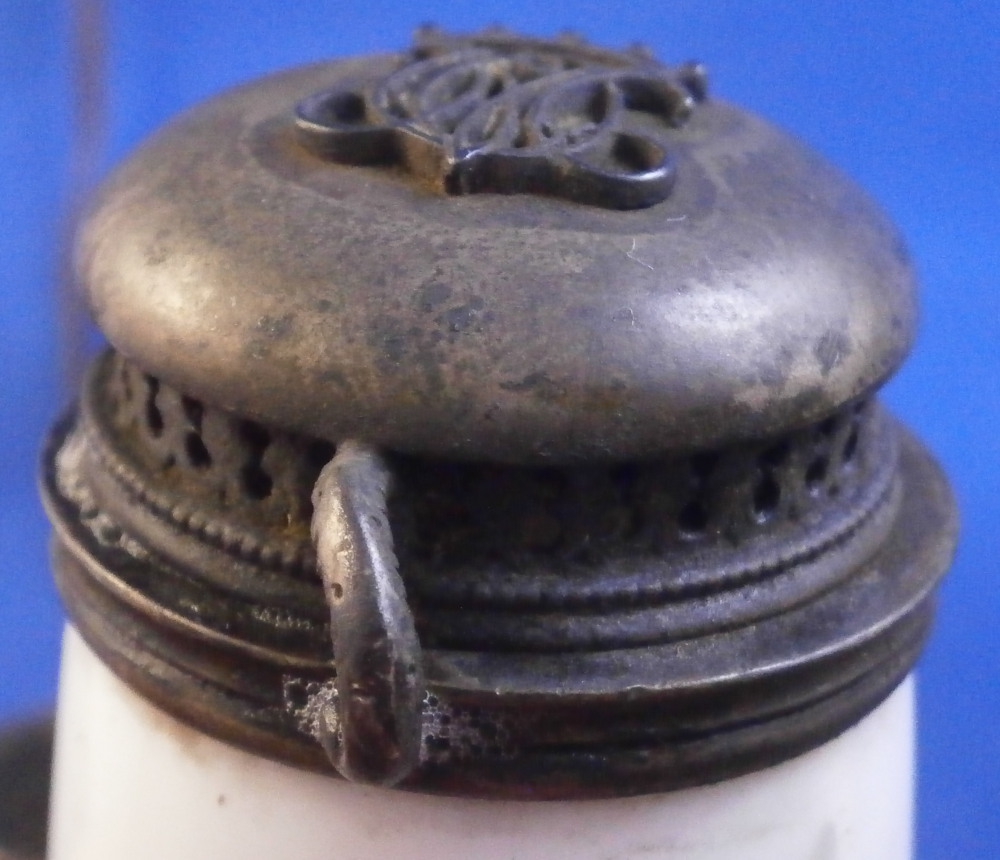 This is a porcelain pipe bowl made in Germany in the early to mid 19th century. The bowl is hand painted with what an armorial to the front including this funny little man to the top part. It has its metal mounts still attached. Not sure if they are silver or silverplate since they are so oxidized but they are in good condition and could be cleaned. The piece holding the lid closed is bent as shown. There is a monogram to the top of the lid of a low nobility crown over the letters MCO I think. The pipe is in great condition with wear to the gilding of the armorialand some fine scratches to the glaze of the white area but it displays well and is a nice early example and an unusual shape. It was heavily smoked and is dirty on the inside. Maybe someone knows this armorial and we could figure out the original owner. That would be neat! The pipe is unmarked as to the maker of the porcelain. It is 5.125 inches tall and 1.5 inches in diameter and 2.875 inches deep. Please e-mail me for more information or photos.