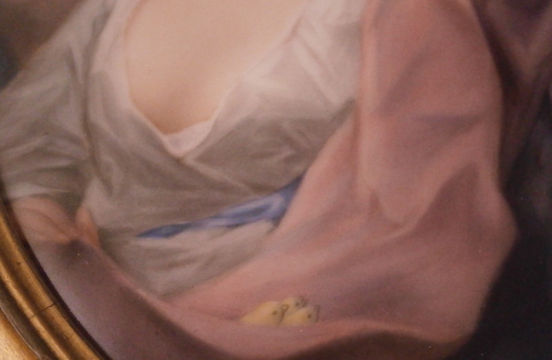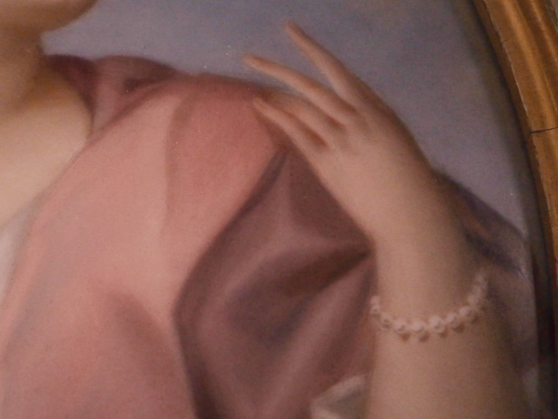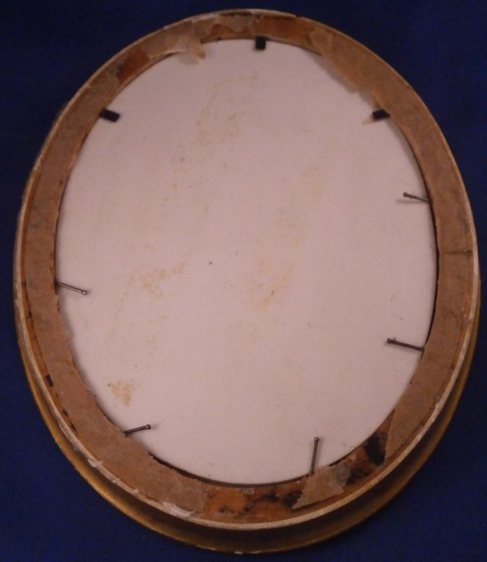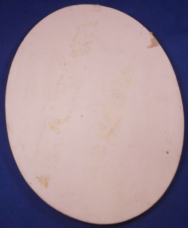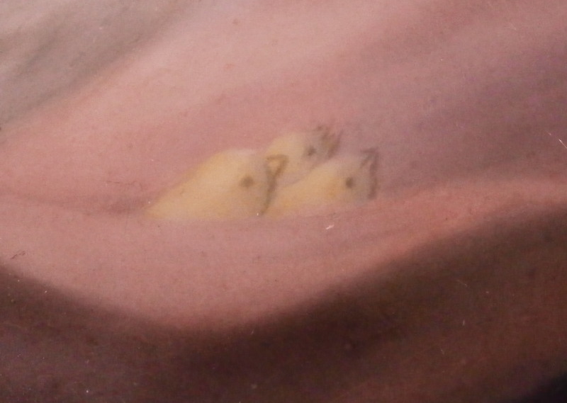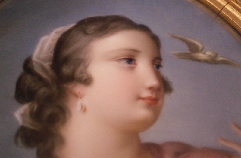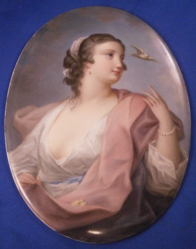 This is a superb quality portrait plaque made in Germany in the late 19th century. The piece is hand painted with a young lady with a nice hair-do wearing a nice earring and a bracelet with a birf flying overhead and three baby birds snuggling up in her pink cloth that is draped over her shoulder. Nice open white blouse with a blue ribbon around the waist, The background is a blue and grey sky with some clouds in it. really a nicely done plaque! The quality of the painting is quite nice better than many one sees and not one of those printed modern things! The nicest part is that this scene is not one I have seen before - there are so many that one sees often so it is refreshing when something different comes along. The plaque is about 7.75 inches tall and 5.625 inches wide so a nice size and larger than many. It comes in a wood and gesso frame that is not in great shape as shown but it still works and looks nice on the wall. The plaque itself is in perfect condition. It is not signed sadly except for some impressed marks on the back as shown. A superb piece of a nice size in perfect condition - doesn't come much better than this! Please email me for more information or photos.