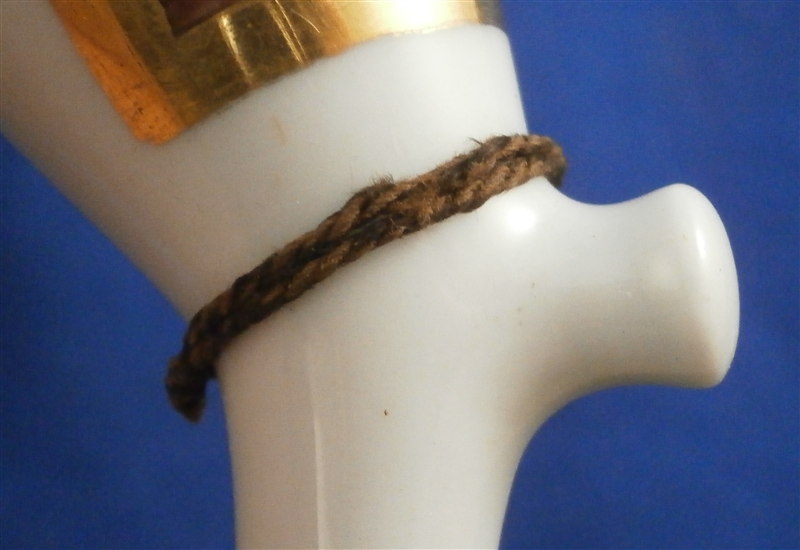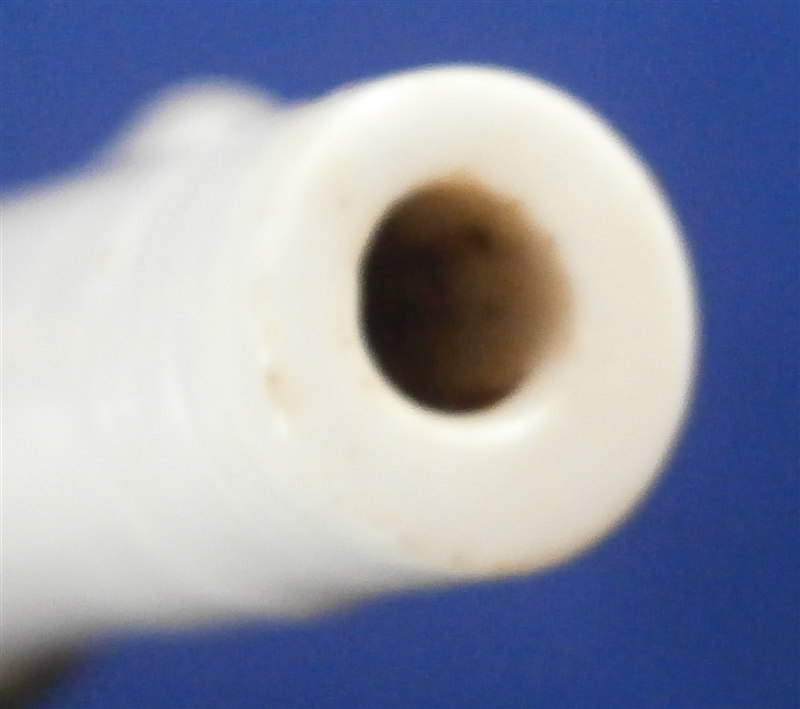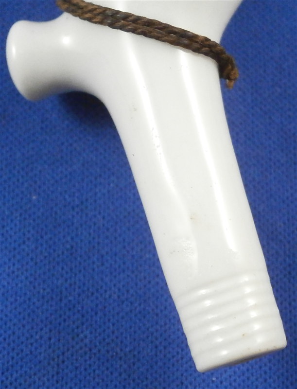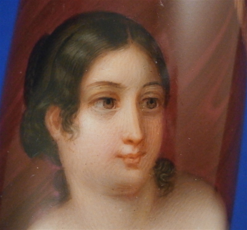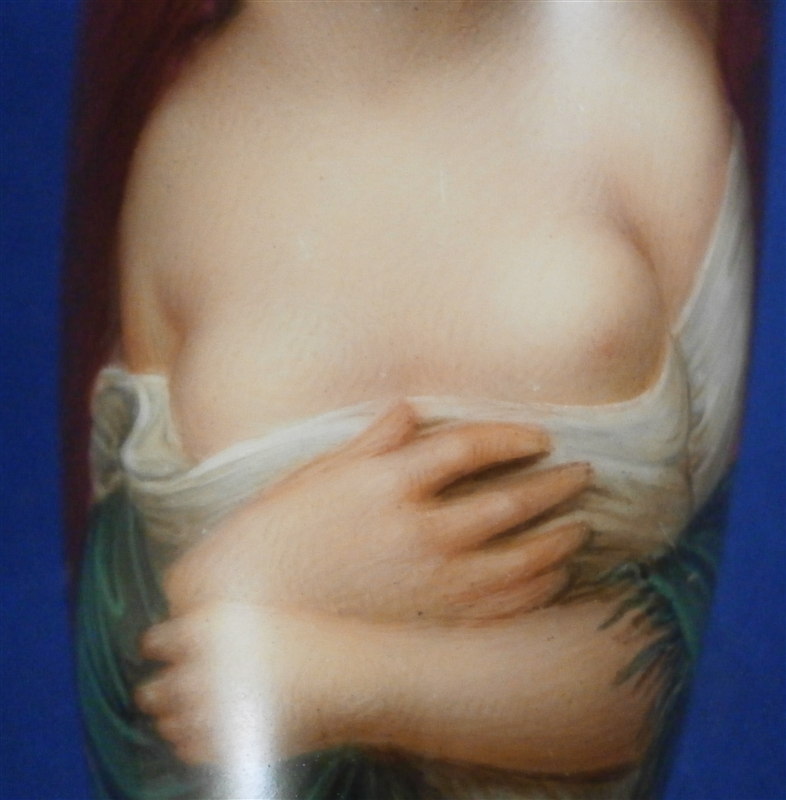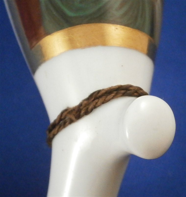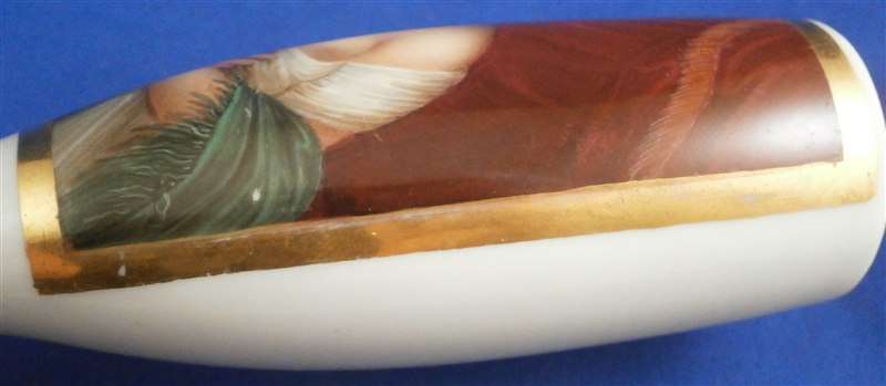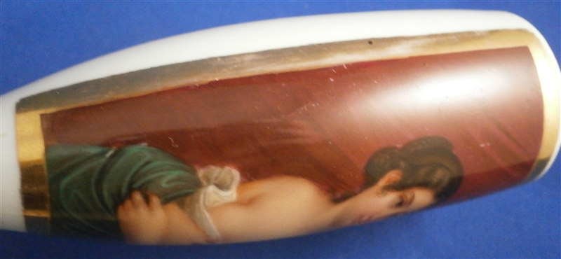 This is a porcelain pipe bowl most likely made by Schney in the first half of the 19th century. It is hand painted with a superb portrait scene of a semi nude / topless lady. This pipe matches another one I own and it looks like it is the same lady modeling for both portraits. Different positions but same style and colors. The quality is is top notch and the scene is surrounded by a gold trim. The dark haired lady is wearing a white shirt and green cloth in front of a maroon background. Her shirt is not covering her top and both breasts are exposed. The pipe is not marked but it matches the other pipe I ahve perfectly and that seems to be marked with the Schney mark of this period. The pipe bowl is a nice size being 5.25 inches long and has a top outer diameter of about 1.375 inches. The piece is in great condition with a little bit of minor wear to the gold trim on the top edge. There is a small rope attached to it which I left but can easily be cut off if one wanted and it doesn't hide issues. Please email me for more information or photos.