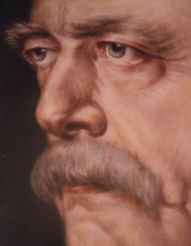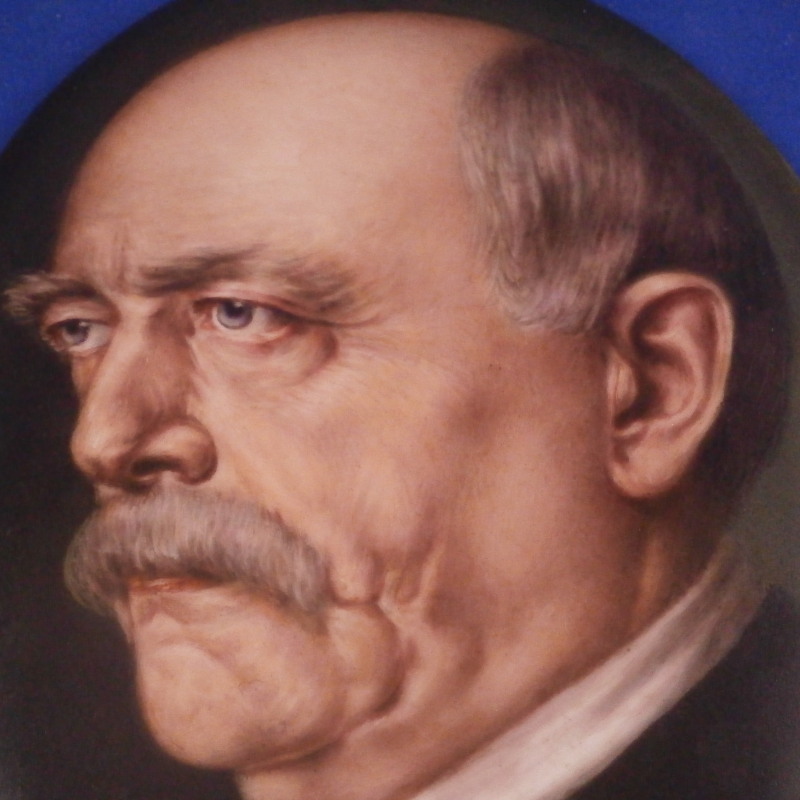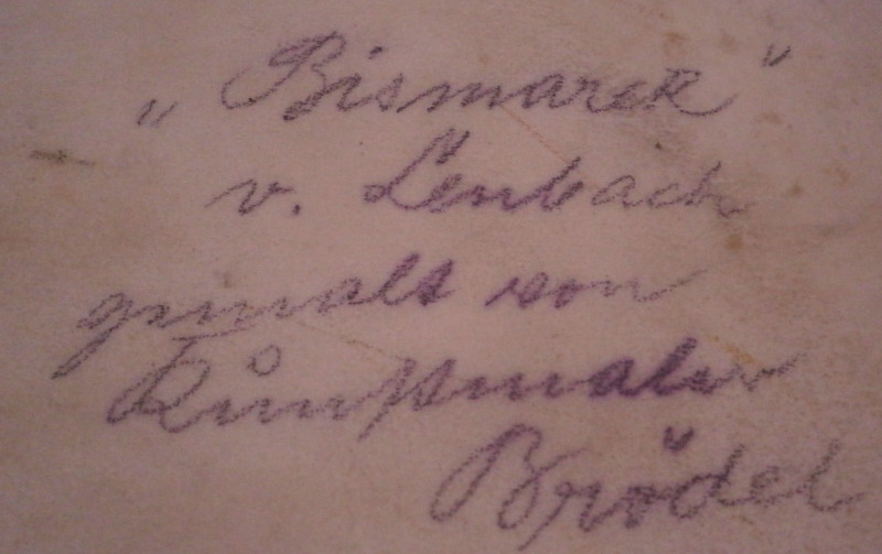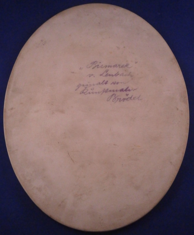 This is a superb porcelain plaque made in Germany in the late 19th century. It is a portrait of Otto von Bismarck after the original oil painting from 1884 by Franz von Lenbach. The piece was painted by Ernst BrödelI who was a designer and artist that worked for KPM Berlin for a long time but also did work on his own and for other studios. Top quality piece. There are larger KPM pieces with more of the body out there but I could not find any other pieces with mainly the head. The plque is entirely hand painted with lots of detail. The plaque is of a large size being 9 inches tall, 6.625 inches wide and about 0.125 inches thick. The porcelain is not marked at all in the back but it has "Bismarck" v. Lenbach gemalt von Kunstmaler Broedel on the back as shown. Bismarck was the first Chancellor of the Germany from 1871 to 1890. Please email me for more information or photos.