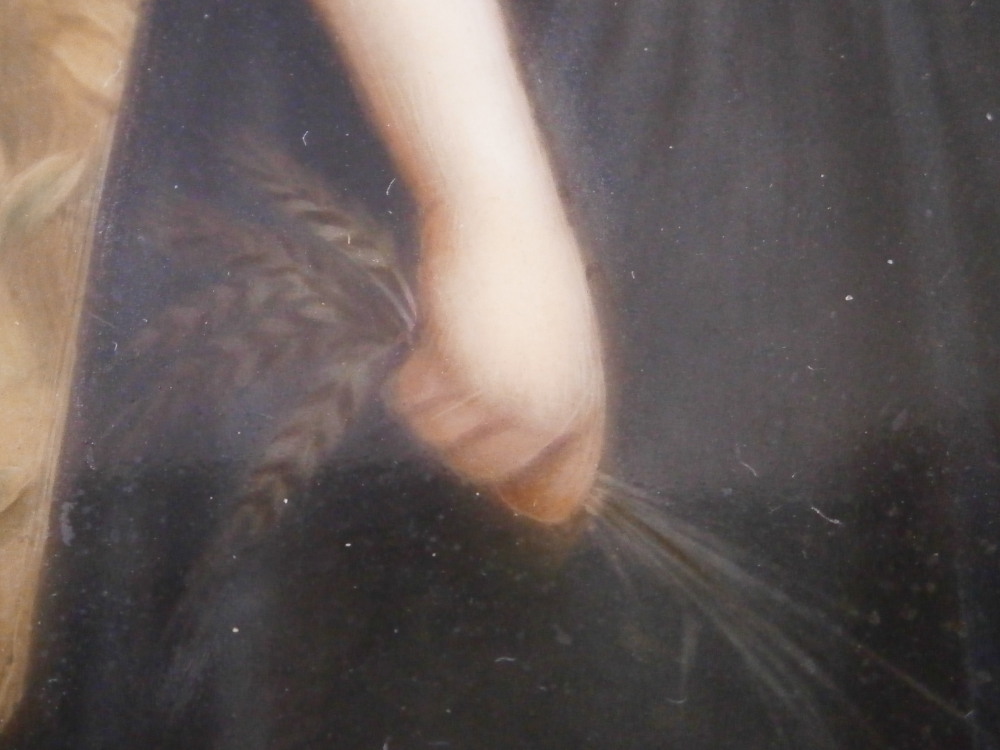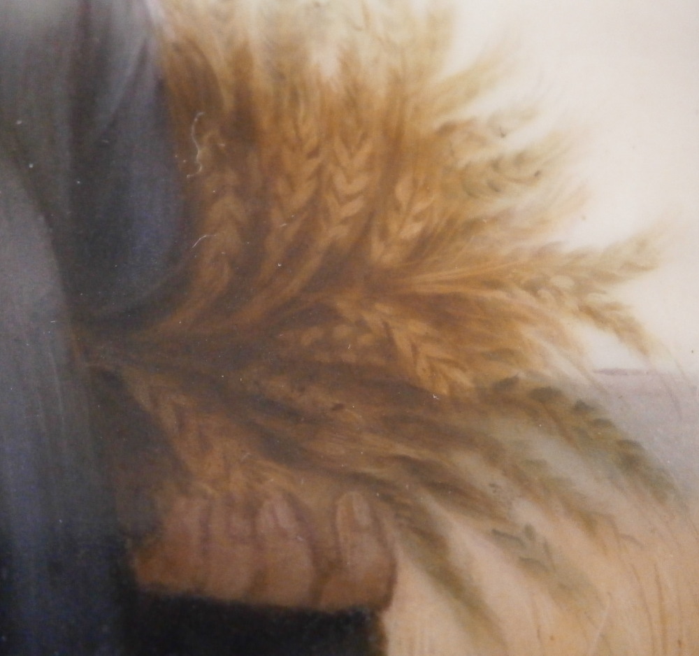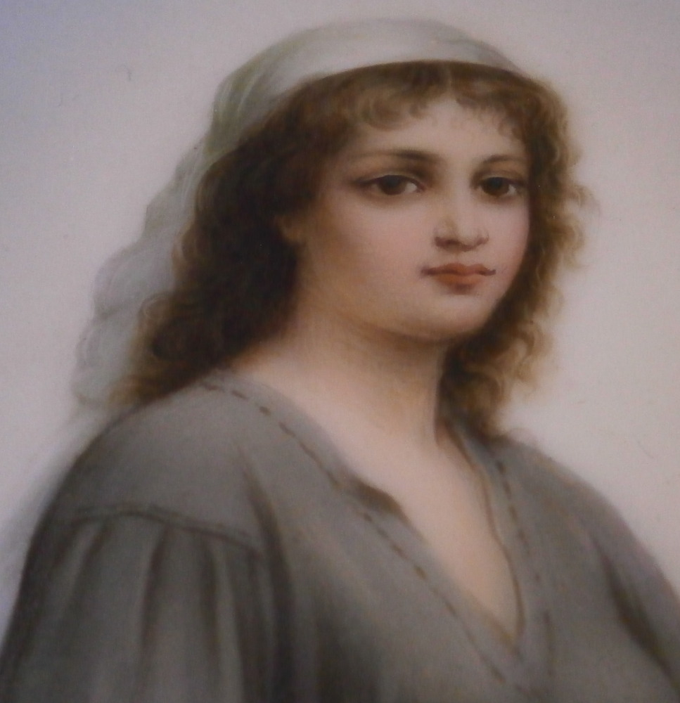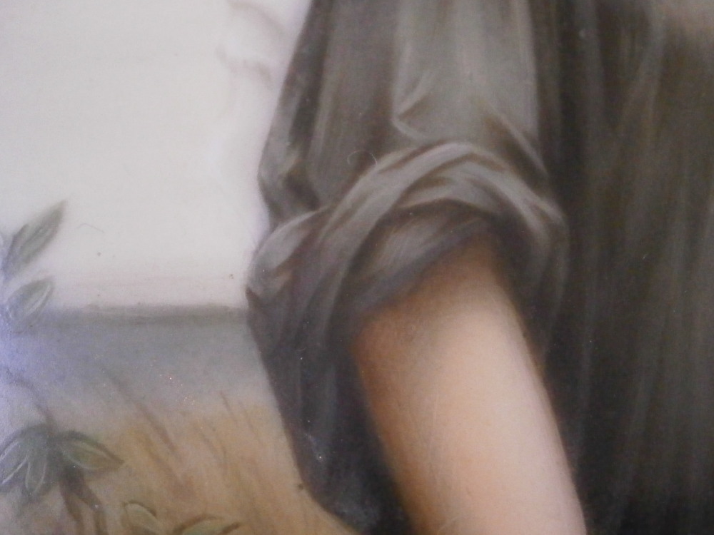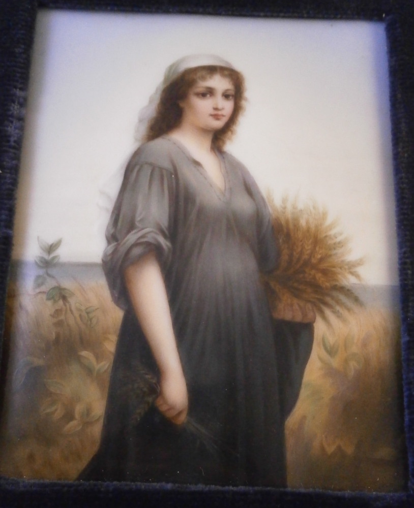This is a nice porcelain plaque made in Germany in the 19th century. It is hand painted with a version after the painting of Ruth by Charles Landelle. The lady appears to be standing in a field at sunset holding a wheat sheaf in her left hand and a few pieces of wheat in her right hand. A nicely painted piece that is all hand painted no transfer parts! The plaque comes with a cloth mat and a frame though either has seen better days. They work though and it still displays nicely. The plaque is in perfect condition. It is only marked with some numbers in the back as shown. The entire piece is about 0.625 inches thick, 6.5 inches wide and 7.875 inches tall. The plaque is about 3.5 inches wide and 4.5 inches tall. Please email me for more information or photos.