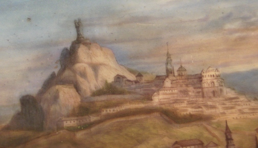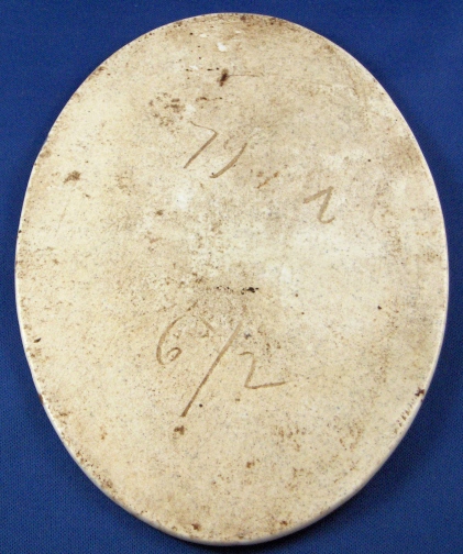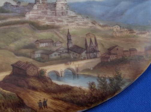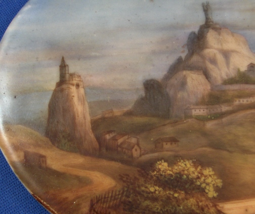 This is a porcelain plaque made most likely in the Thuringia area of Germany in the early to mid 19th century. It is handpainted with a nice scene of a castle on a steep mountain with another castle closeby that looks like a statue more than a castle. A town is right by the second castle and closer to the front is a river with a bridge and two people taking a walk. There is lots going on in this picture and everytime I look I see something else like the carriage going across the bridge. The plaque is in good condition but come in one of those metal holder frames which damaged some of the paint on the top rim area. Two more scratches on the right side of the bridge but they are not super obvious. No chips, etc. The piece is marked on the back with incised marks but no real makers mark. The plaque is 5 inches tall and 7 inches wide. Please email me for more information or photos.