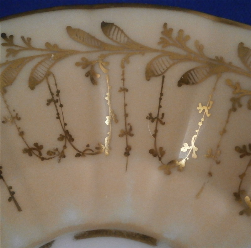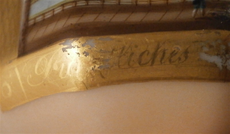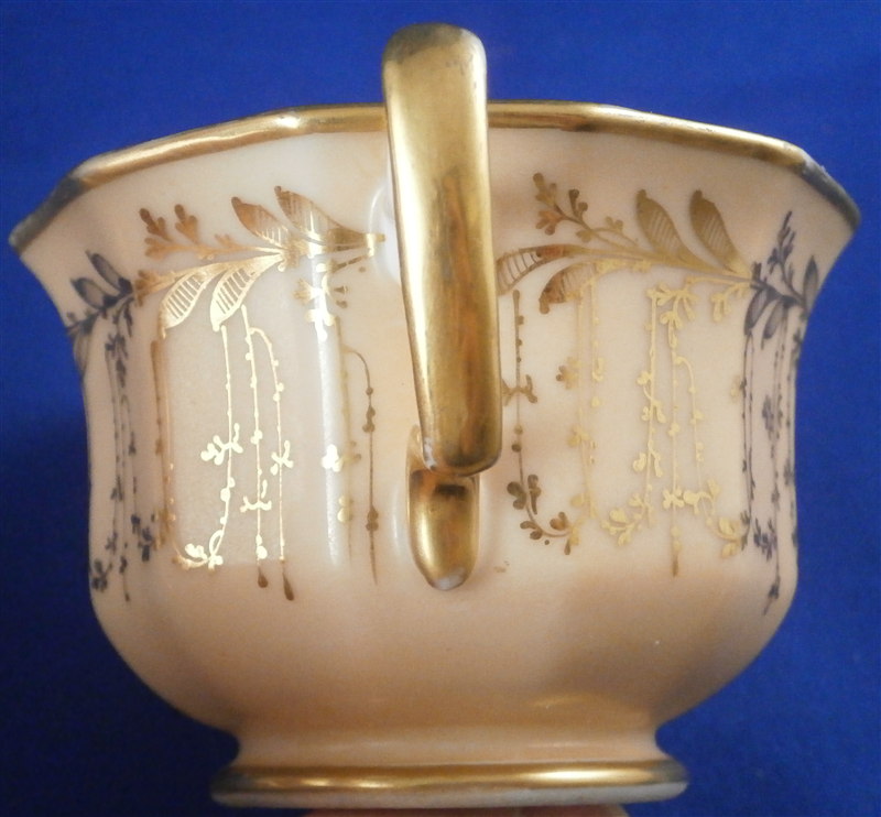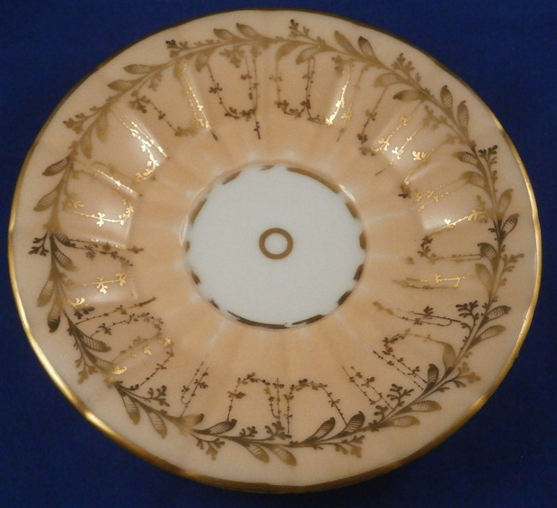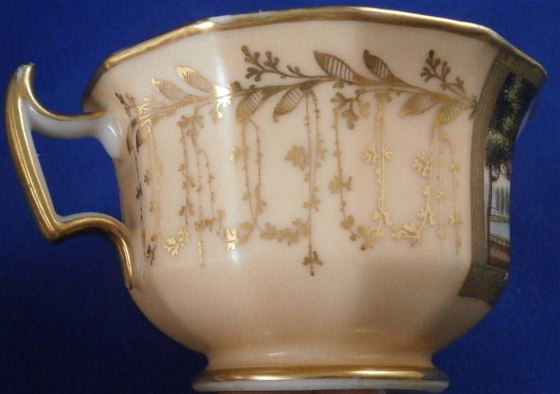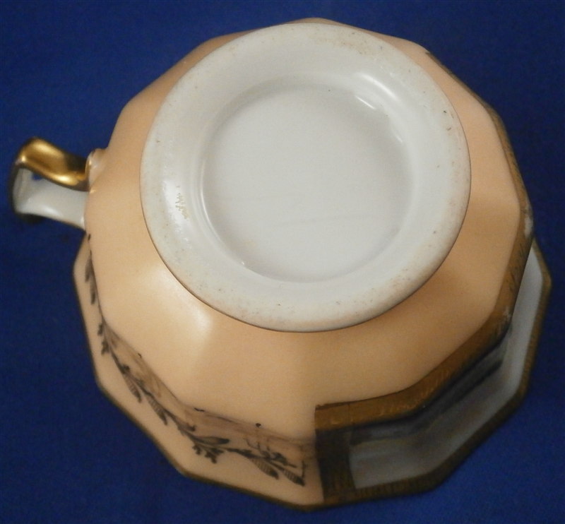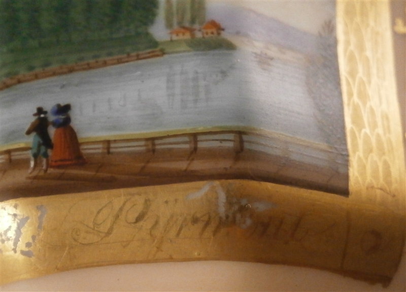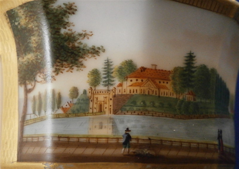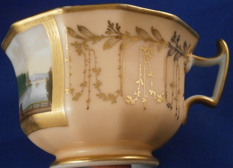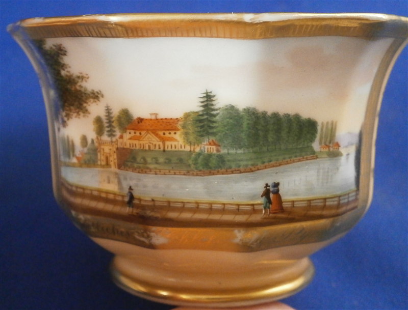 This is a great scenic cup and saucer made in Germany in the early to mid 19th century. Most likely in the Thuringia area of Germany. The cup is hand painted with a scene of the Castle of Bad Pyrmont - not all that far from whre I grew up. I remember the city from when Iw as a kid. The scene is well painted with the rest of the cup having a light salmon colored ground with some nice gilding to it. Same decoration on the saucer. The cup is marked only with an incised script N - same on the saucer. The cup is 2.375 inches tall and 3.75 inches in diameter. The saucer is 0.875 inches tall and has a diameter of 5.875 inches. Both are in good condition with some minor wear to the center of the saucer, the writing under the scene has some wear and the gilding on the inside of the cup is worn. The writing under the scene states Fuerstliches Schloss Bad Pyrmont as far as I can make it out. Please email me for more information or photos.