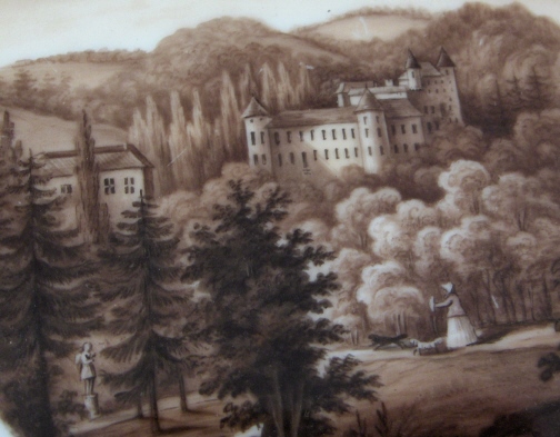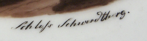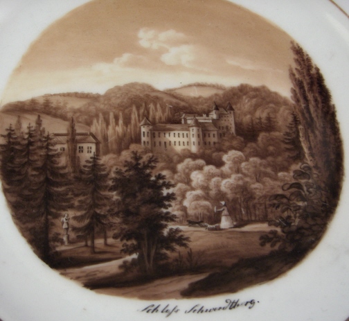 This is a plate probably made by one of the Thuringia makers like Gotha or a maker like Althaldensleben around the early 19th century. It is handpainted with a very detailed scene of Schloss Schwerdtberg which is located in Oberoestereich ( somewhere towards northern Austria) in mostly brown tones. The castle is in the center of a landscape scene with lots of trees, another building, a statue and a lady walking her two dogs. It is a great quality piece and has a nice gold rim. The plate is in super condition with a tiny bit of wear. It is marked underneath the scene with the title Schloss Schwerdtberg in an old writing style and spelling no longer used. I own Gotha plates that are not marked from this time period but it might be another maker similar to them as well. The plate is 1 inch tall and 7.625 inches in diameter. Please email me for more information or photos.