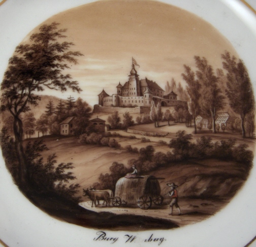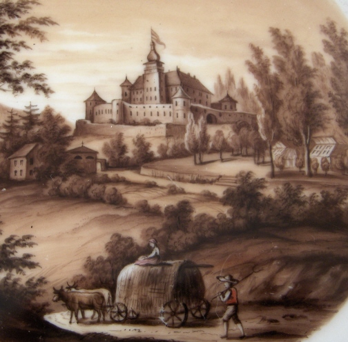 This is a plate probably made by one of the Thuringia makers like Gotha or a maker like Althaldensleben around the early 19th century. It is handpainted with a very detailed scene of Burg Weinberg which is located in Oberoestereich ( somewhere towards northern Austria) in mostly brown tones. The castle is in the center of a landscape scene with lots of trees, two other buildings and a lady sitting on top of a hay wagon pulled by two oxen with the farmer walking behind it on a road. I love these old plates with scenes on them as it gives you a glimpse into the way things used to be! The plate is of great quality and has a nice gold rim. It is in super condition with a tiny bit of wear. It is marked underneath the scene with the title Burg Weinberg (with the ei wworn away). I own Gotha plates that are not marked from this time period but it might be another maker similar to them as well. The plate is 1 inch tall and 7.625 inches in diameter. Please email me for more information or photos.