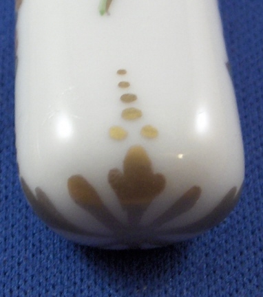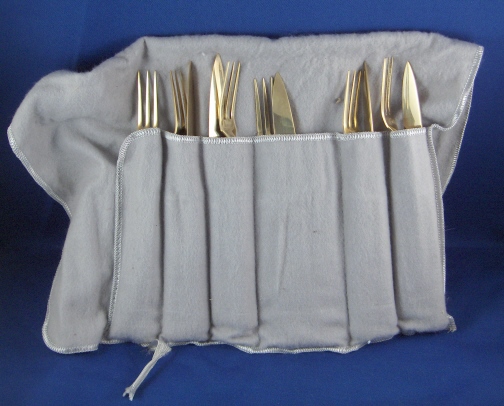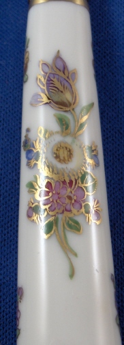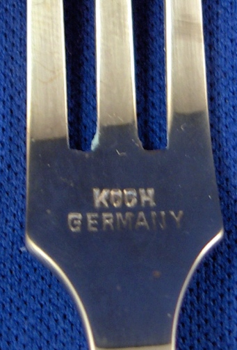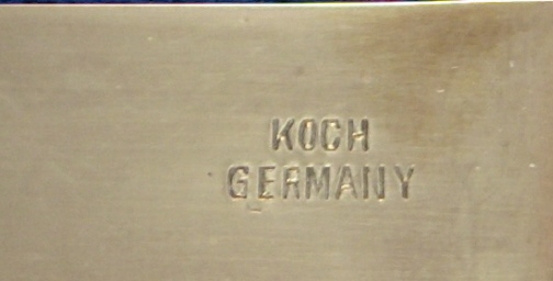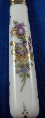 This is a set of knives and forks with porcelain handles made in Germany in the 20th century. The blades are made of some kind of gold metal like bronze I am assuming and the handles are made of porcelain that was handpainted with different flowers and highlighted with nice gilding. The set comes in a cloth jewelers pouch which is nice. There are six forks and five knives (sadly one is missing). They are about 6.75 inches long of which 3 inches is porcelain. The handles are 0.625 inches wide at the end. Each piece is marked Koch Germany on the metal. They are in perfect condition. Please e-mail me for more information or photos.