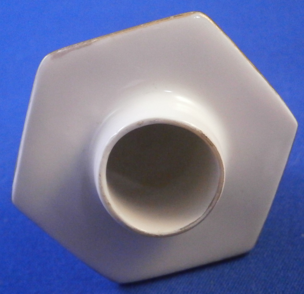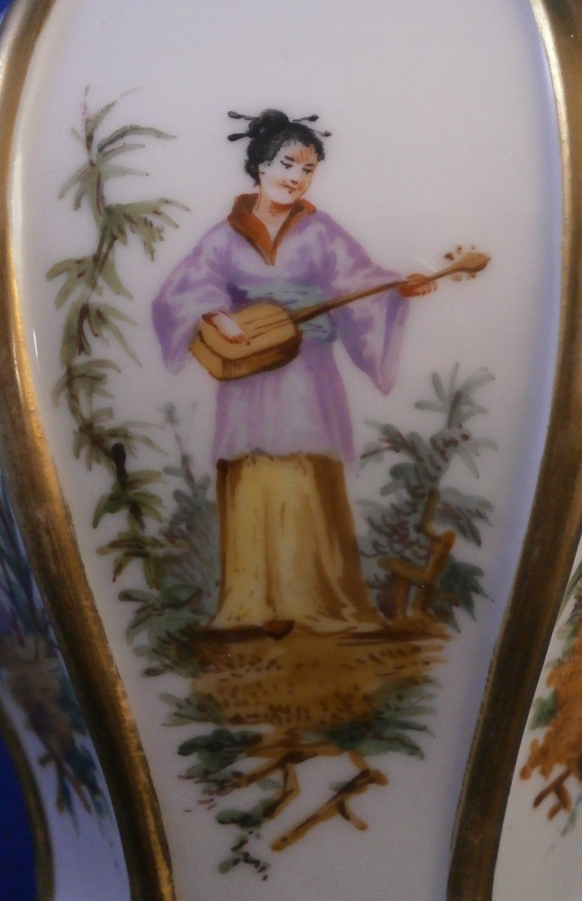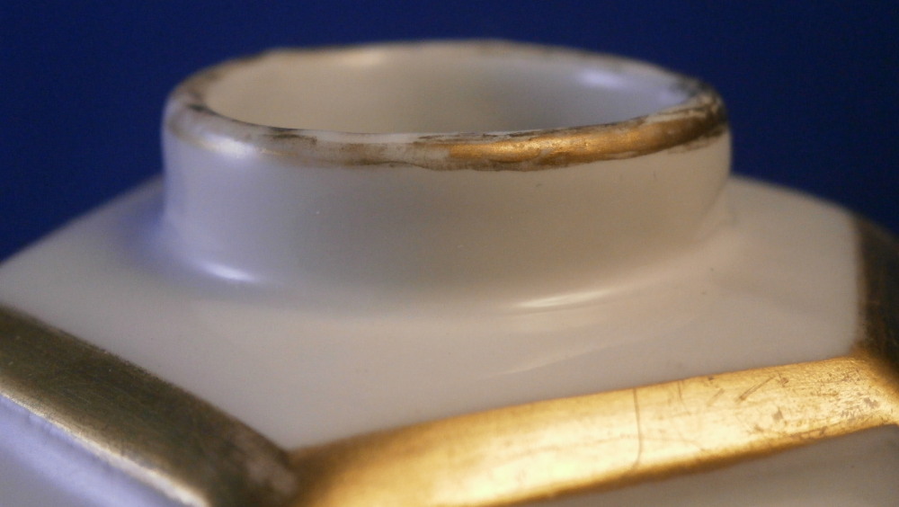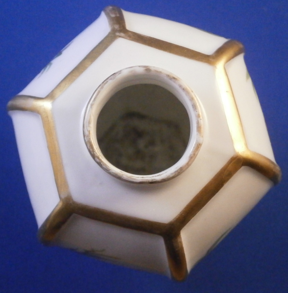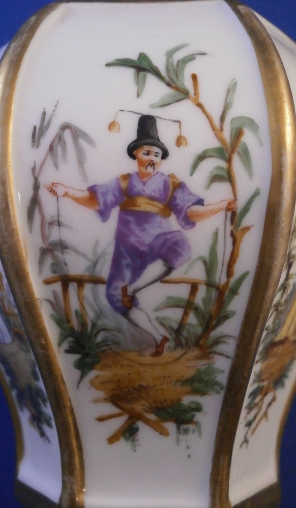 This is an interesting tea caddy / jar that I could never quite figure out. It was likely made in Germany in the later 19th century. The piece has a superb hexagonal shape to the main body with each side being hand painted with a different Chinoiserie scene - three ladies and three gentleman doing different things in a landscape surrounding. The edges around the scenes are highlighted with a thick gold band. The lid matches the piece in terms of shape and looks superb. It's a stunning looking piece! The main body and lid are 5.25 inches tall with a max diameter of about 3.25 inches. The main body is in great condition with one spot on top rim having been restored perfectly. The lid has had the finial restored back on and some damage to the edge as well. Perfect job as well and they display superbly together. The piece is marked with an under glaze blue cross type mark as shown. Please email me for more information or photos.