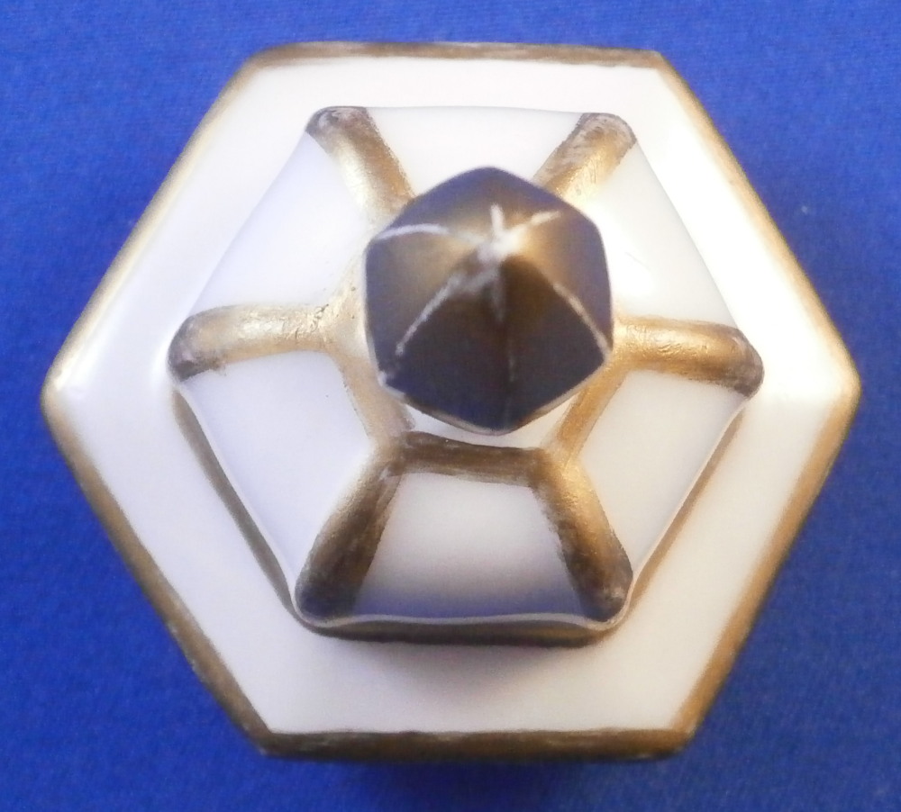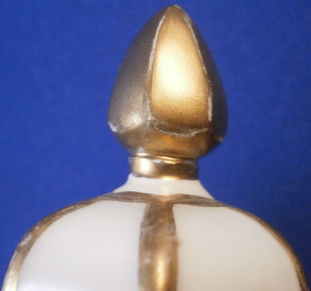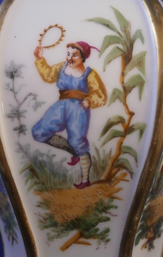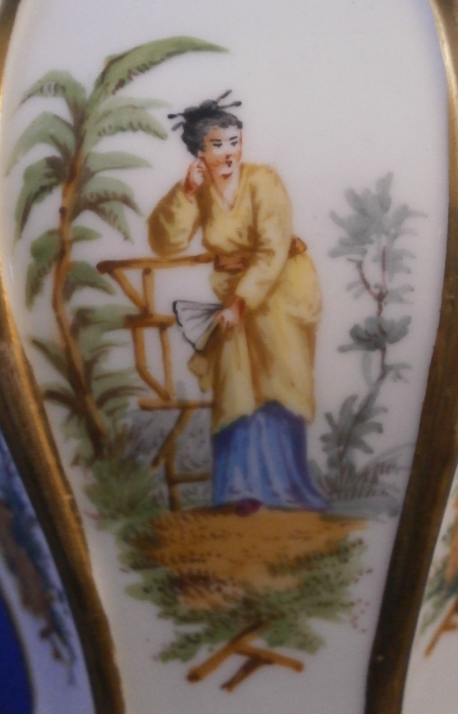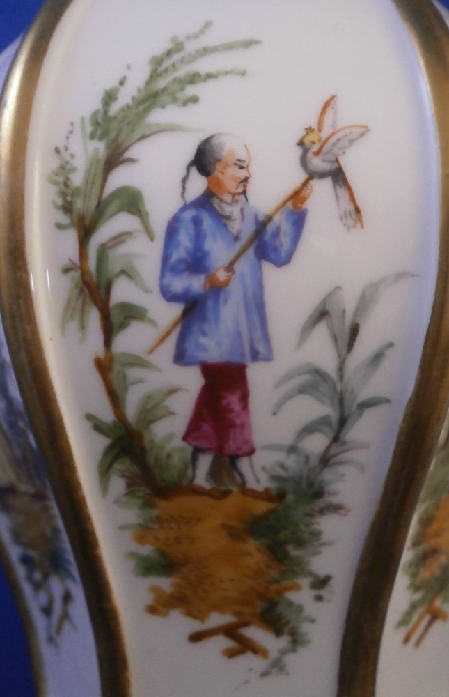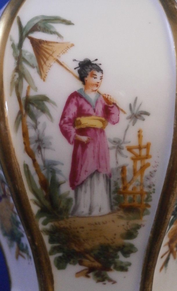 This is an interesting tea caddy / jar that I could never quite figure out. It was likely made in Germany in the later 19th century. The piece has a superb hexagonal shape to the main body with each side being hand painted with a different Chinoiserie scene - three ladies and three gentleman doing different things in a landscape surrounding. The edges around the scenes are highlighted with a thick gold band. The lid matches the piece in terms of shape and looks superb. It's a stunning looking piece! The main body and lid are 5.25 inches tall with a max diameter of about 3.25 inches. The main body is in great condition with one spot on top rim having been restored perfectly. The lid has had the finial restored back on and some damage to the edge as well. Perfect job as well and they display superbly together. The piece is marked with an under glaze blue cross type mark as shown. Please email me for more information or photos.