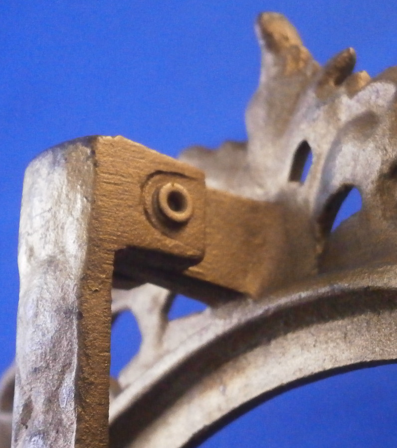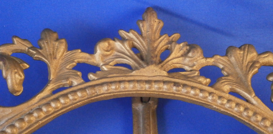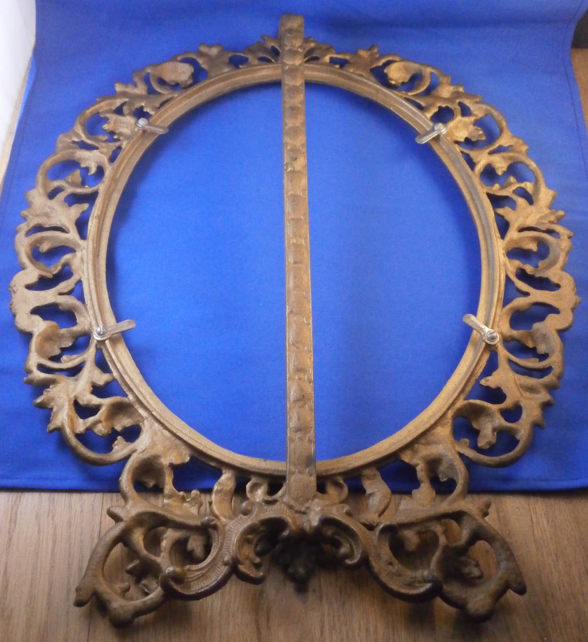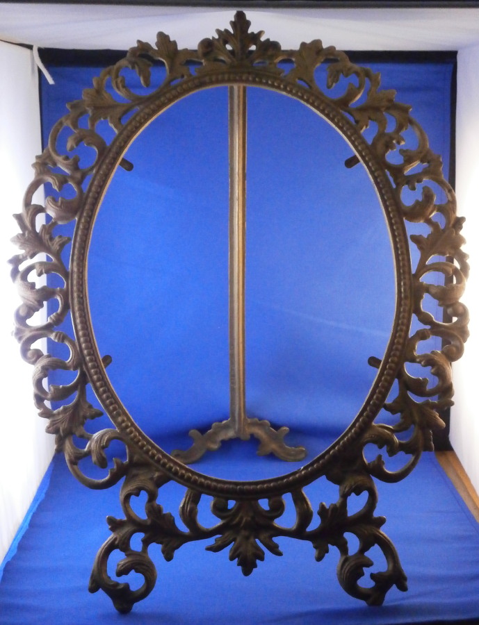 This is a superb gold painted metal frame for a table top probably made around 1900 though that is just a guesstimate. The frame part has some fancy leaf scroll work all around and a stand part that folds out in the back in order to display it on a table or something along those lines. The frame is in great condition. It is marked as shown with some impressed marks but nothing that helps ID a maker or help much in terms of age. The entire frame measures 18 inches tall and 14 inches wide. The part where the painting or porcelain plaque would be is 9.5 inches wide and 12.75 inches tall. The opening that shows in the front is slightly smaller about 12 inches tall by 9 inches wide. Please email me for more information or photos.