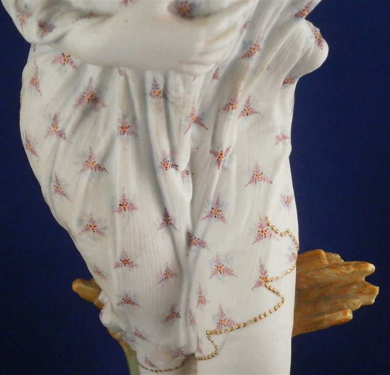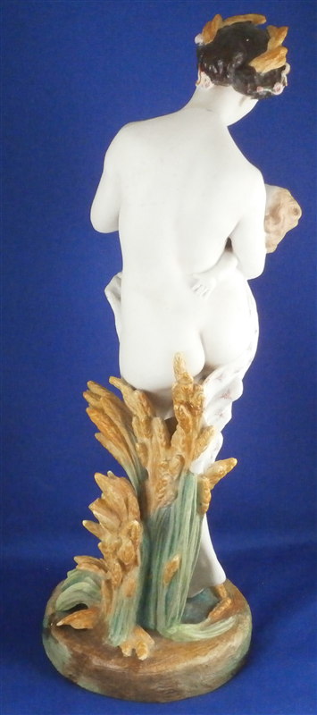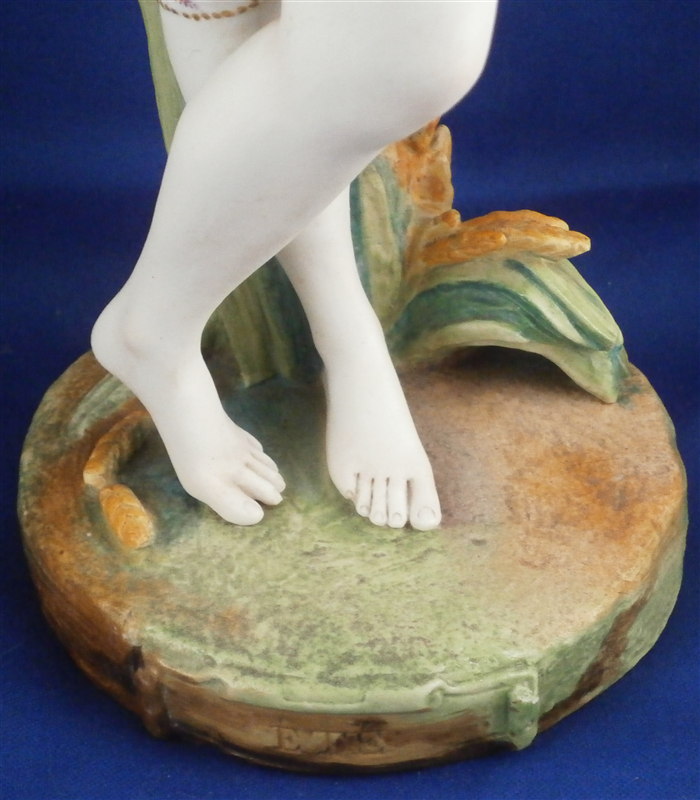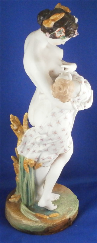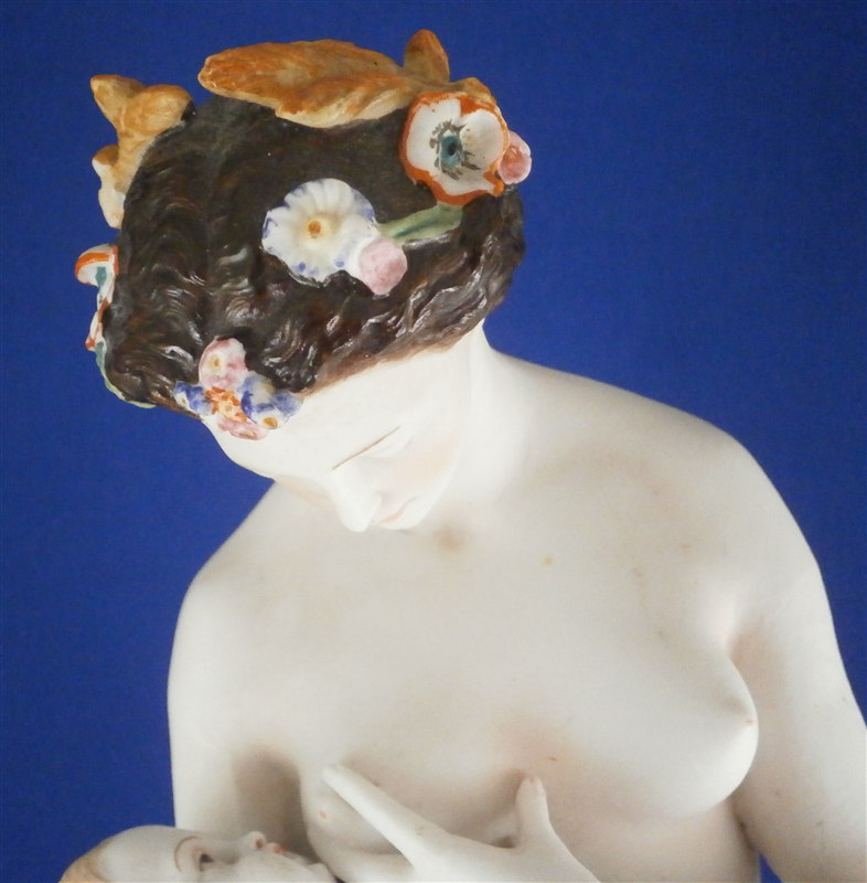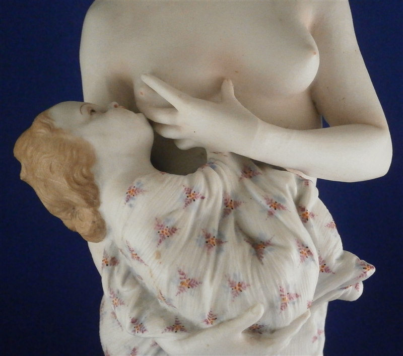 This is a superb figurine made by Jean Gille in about 1850. Another great example of his work. It is of a mother breast feeding her young child in this case meant to symbolize summer. She is wearing some flowers and wheat in her hair, is partially covered in a cloth with a floral design to it and is standing on a nice green base with a wheat sheeth behind her. The front of the base has the inscription ETE meaning Summer in French. The figure is very well modeled and painted superbly. The piece is made of painted biscuit. It is 13.5 inches tall and the diameter of the base is 4.5 inches. In great condition with two chips to the ends of the wheat and a reglued section of the wheat sheeth as shown. All in the back so no issue when on display. I just discovered another chip to a piece of wheat in her hair but it does not take away from her as it blends in with the rest of the decoration. The piece is marked with the JG mark on a blue raised piece of porcelain as well as an incised A as shown. Please email me for more information or other pictures.