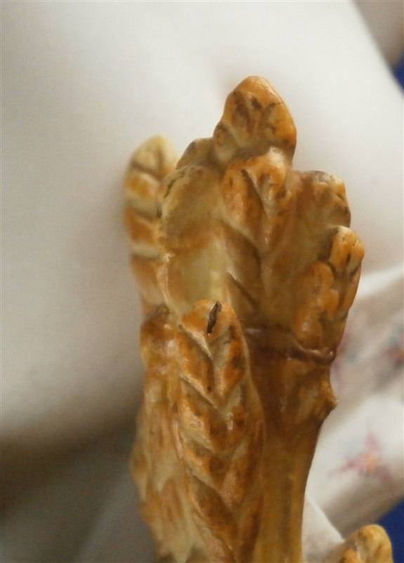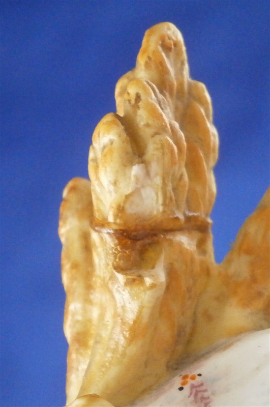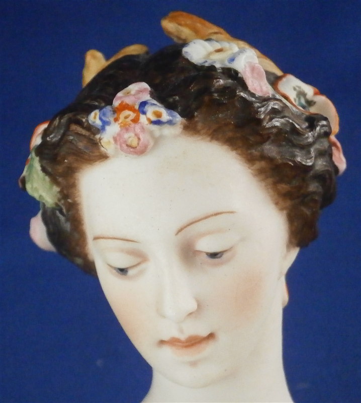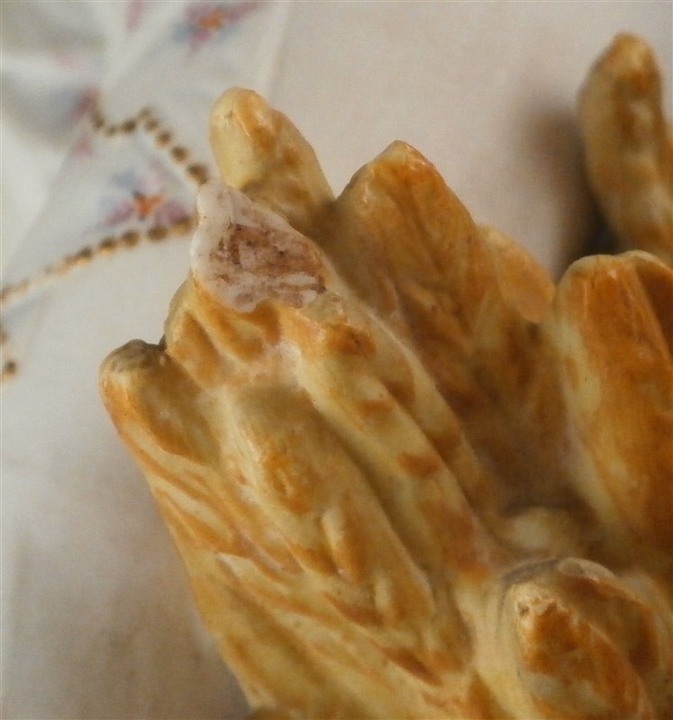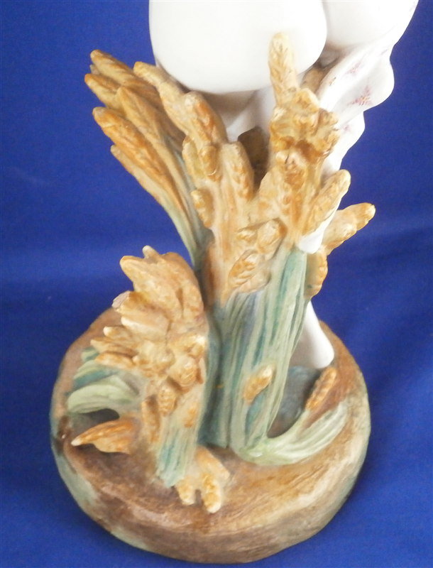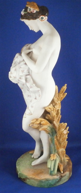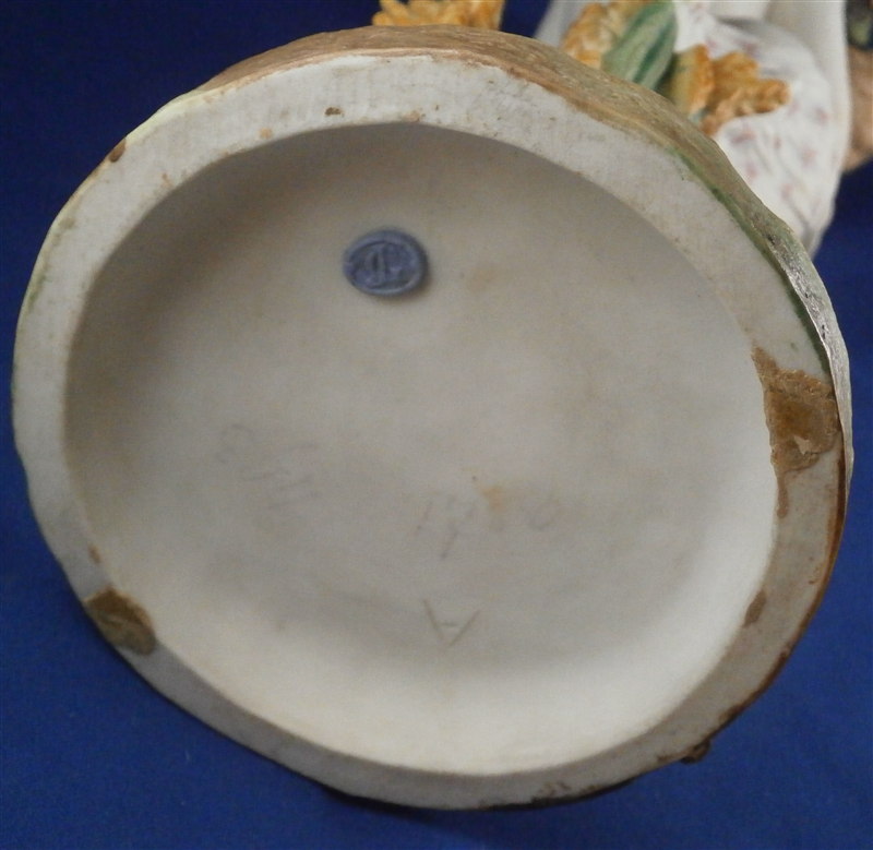 This is a superb figurine made by Jean Gille in about 1850. Another great example of his work. It is of a mother breast feeding her young child in this case meant to symbolize summer. She is wearing some flowers and wheat in her hair, is partially covered in a cloth with a floral design to it and is standing on a nice green base with a wheat sheeth behind her. The front of the base has the inscription ETE meaning Summer in French. The figure is very well modeled and painted superbly. The piece is made of painted biscuit. It is 13.5 inches tall and the diameter of the base is 4.5 inches. In great condition with two chips to the ends of the wheat and a reglued section of the wheat sheeth as shown. All in the back so no issue when on display. I just discovered another chip to a piece of wheat in her hair but it does not take away from her as it blends in with the rest of the decoration. The piece is marked with the JG mark on a blue raised piece of porcelain as well as an incised A as shown. Please email me for more information or other pictures.