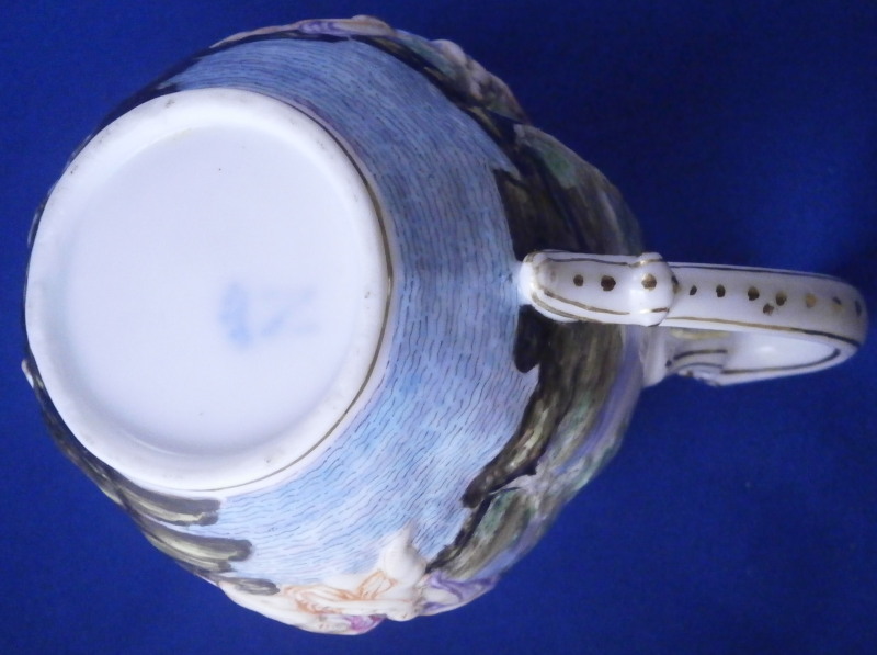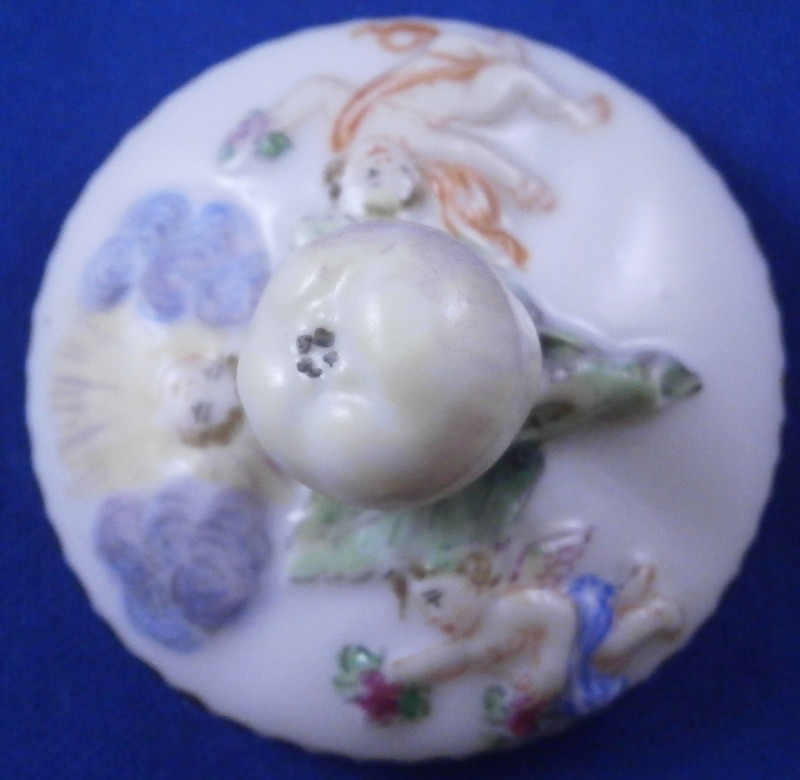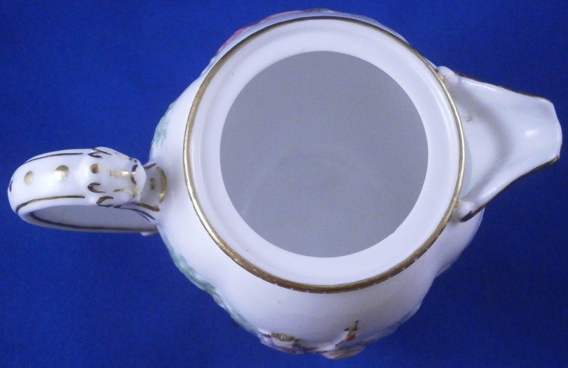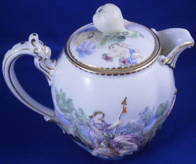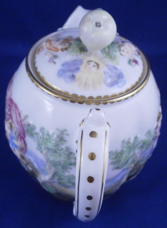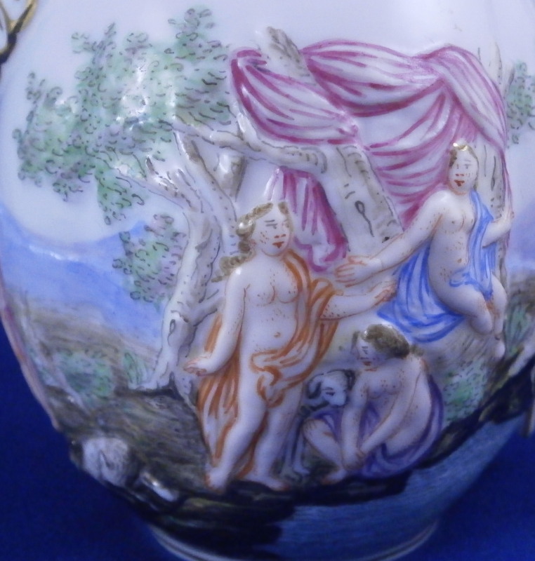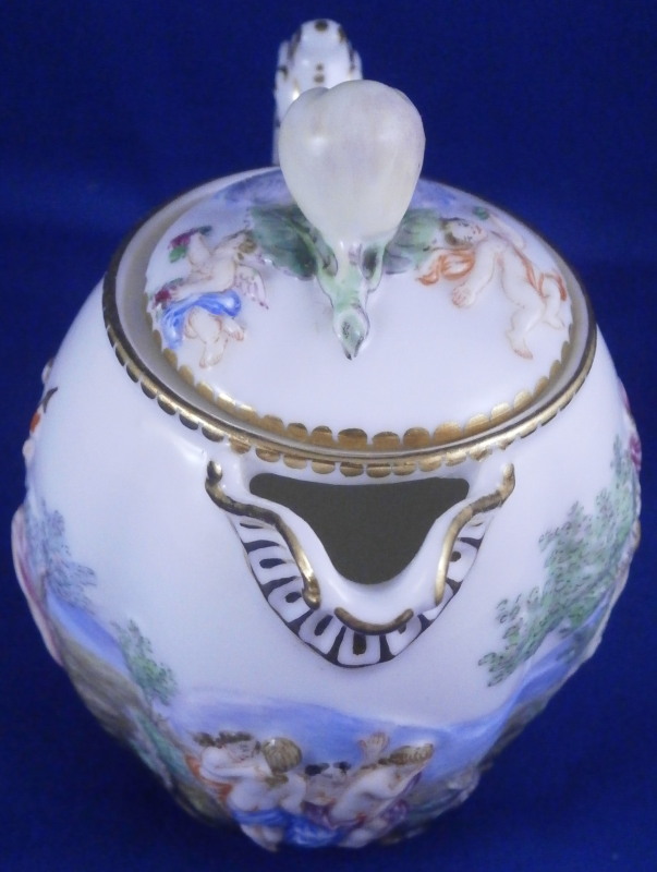 This is a rare lidded creamer made by Doccia / Ginori in the 19th century. One comes across the cups and saucers and occasionally a plate but the main pieces from this set are very hard to find and this creamer shape is much more unusual than the open ones without the lid. The piece is decorated with biblical or mythological scenes in relief all around that are hand painted very nicely, has a nicely shaped handle and spout highlighted with gilding and the lid has three little cherub scenes to it and a fruit finial. Gold trim to the edges as well. Thecreamer and lid are in perfect condition. The piece is marked with the crown over N mark copied so often but in this case definitely original as the quality is just superb and the underside typical of Richard Ginori. The creamer and lid are 4 inches tall, 4.25 inches from handle to spout and about 3 inches in diameter. Please email me for more information or other pictures.