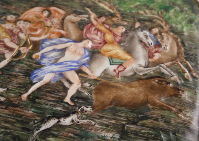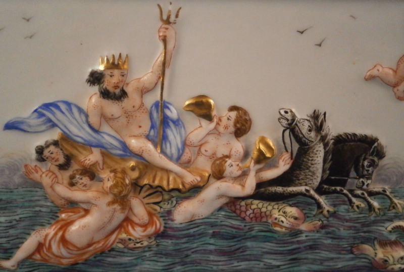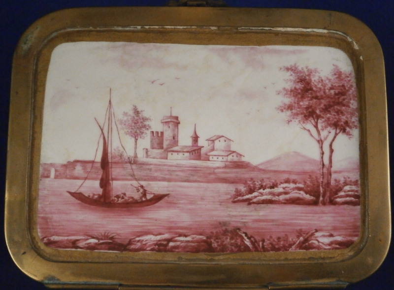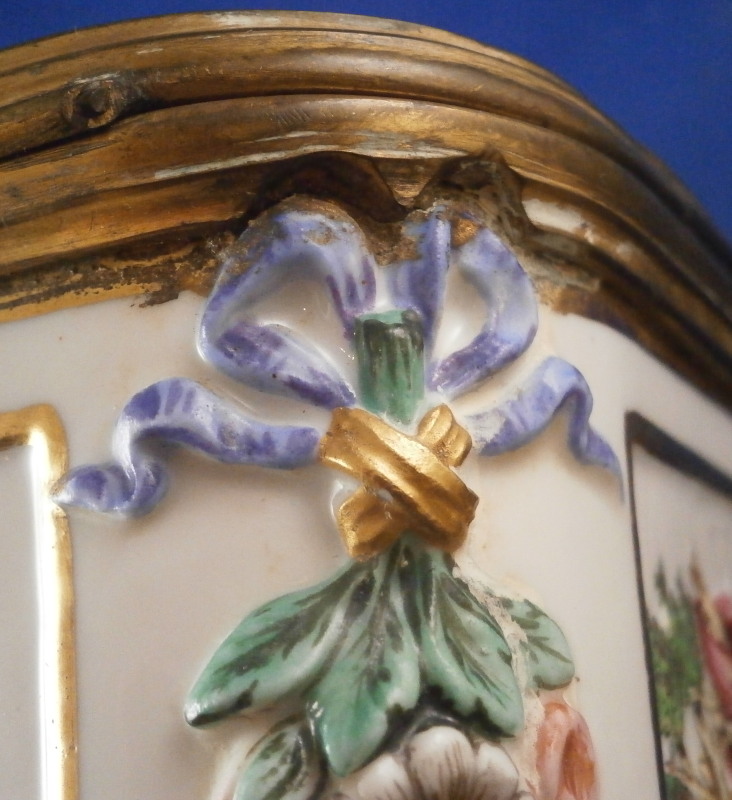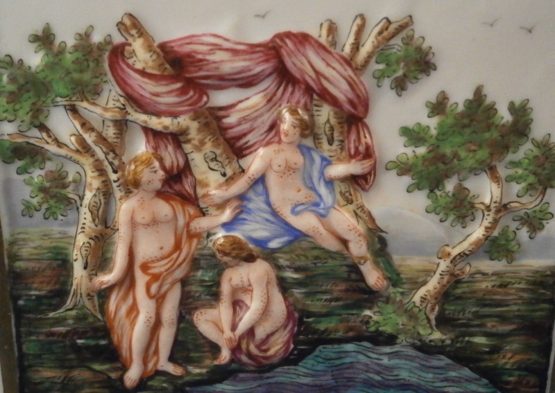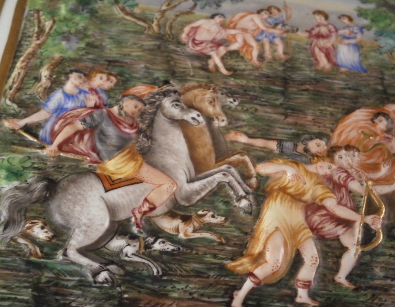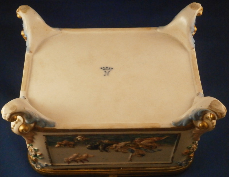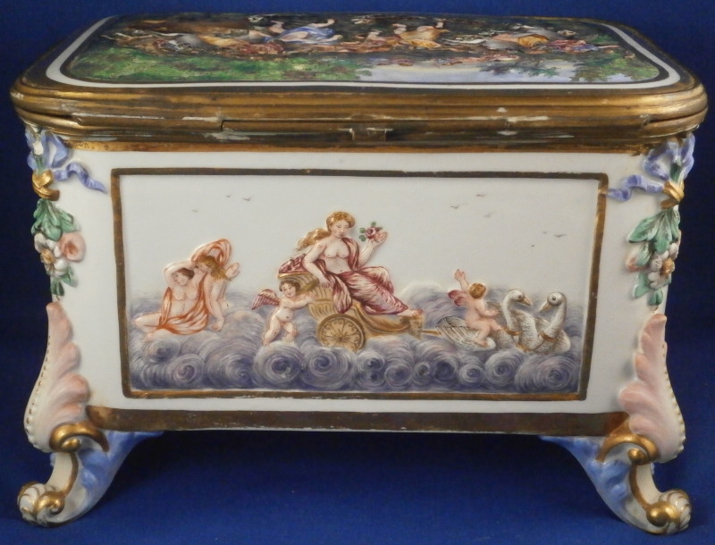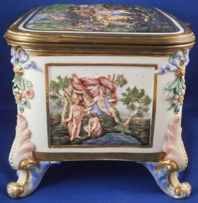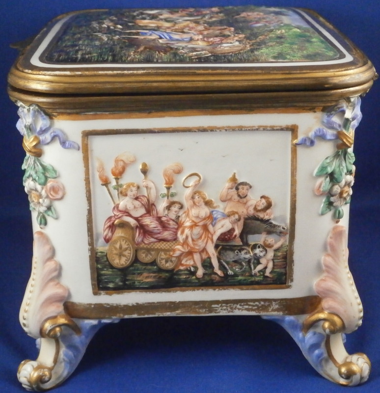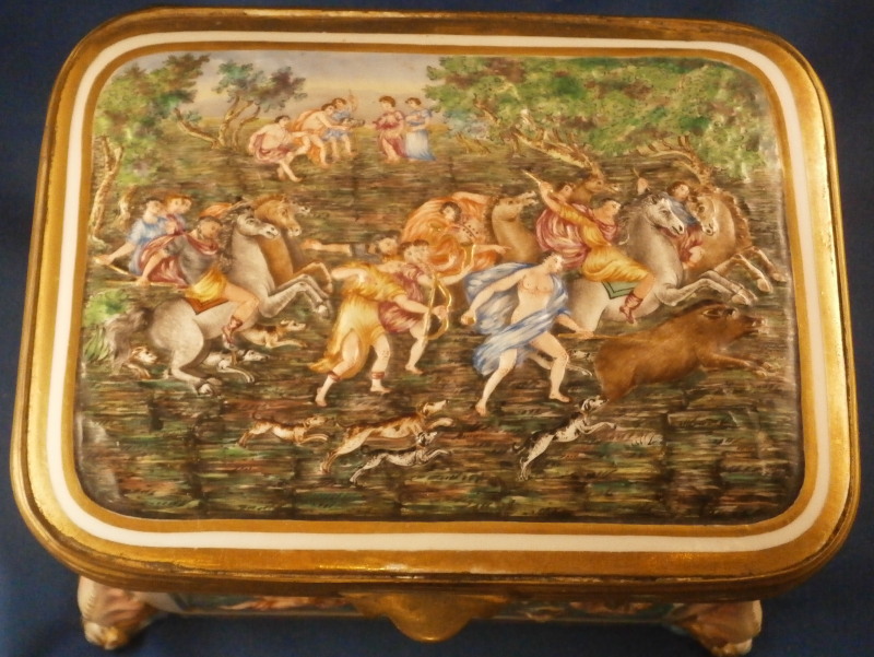 This is a really nice large dresser or jewelry box made by Doccia / Ginori in the mid 19th century. One rarely sees these especially in this size so I was thrilled to have found it! All four sides as well as the top are decorated with mythological scenes in relief with a bit of a gold frame around them. The scenes are hand painted with lots of detail. My favorite scene has to be the front one that has neptune in his seashell chariott being pulled by two hippocampus horses - not something you find often. The scene on top of the lid is the largest and is of a hunt with people on hores and on foot chasing a wild boar with lots of dogs around as well. The box sits on four fancy feet which are typical in design and color for this maker. A floral design is above that being held up by blue bows. One of the unusual parts of this box is that it also has a superb scene in puce to the inside lid. Most of these boxes are just white on the inside. The mounts are brass or bronze that had to be cut out a bit to fit around the bows of the corners. .The box is in great condition with some wear to the gilding and I think the mounts were gilded at some point and that is mostly gone now. It displays perfectly and is ready to be used again :) The piece is marked with the blue crown over N mark copied so often by other makers from this original. The box is 5.125 inches tall, 7.5 inches wide and 5.625 inches deep. A nice size and quite heavy. Please email me for more information or other pictures.