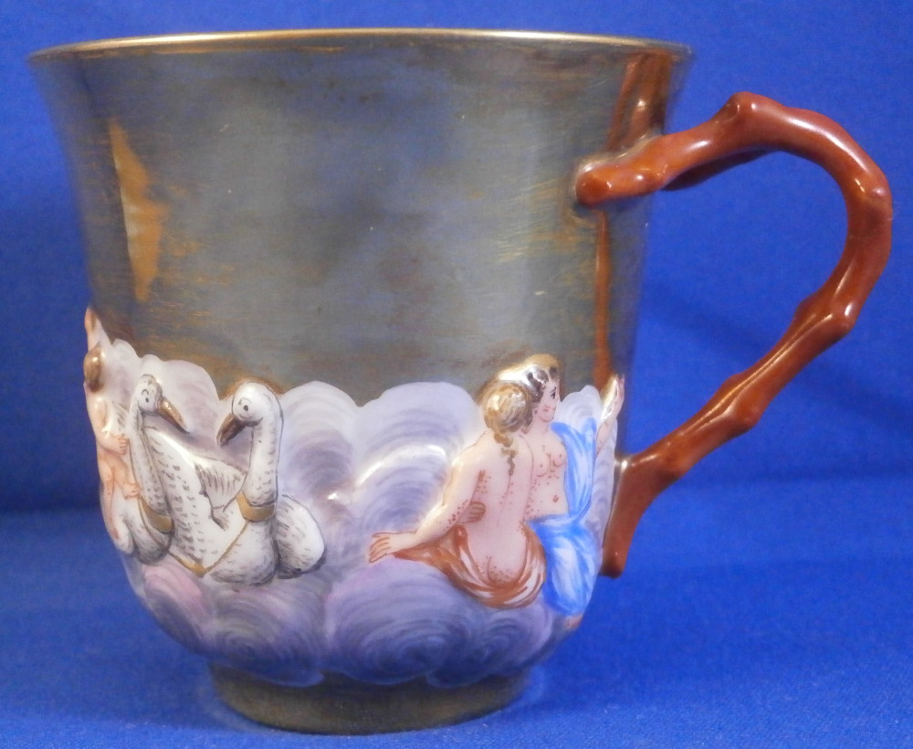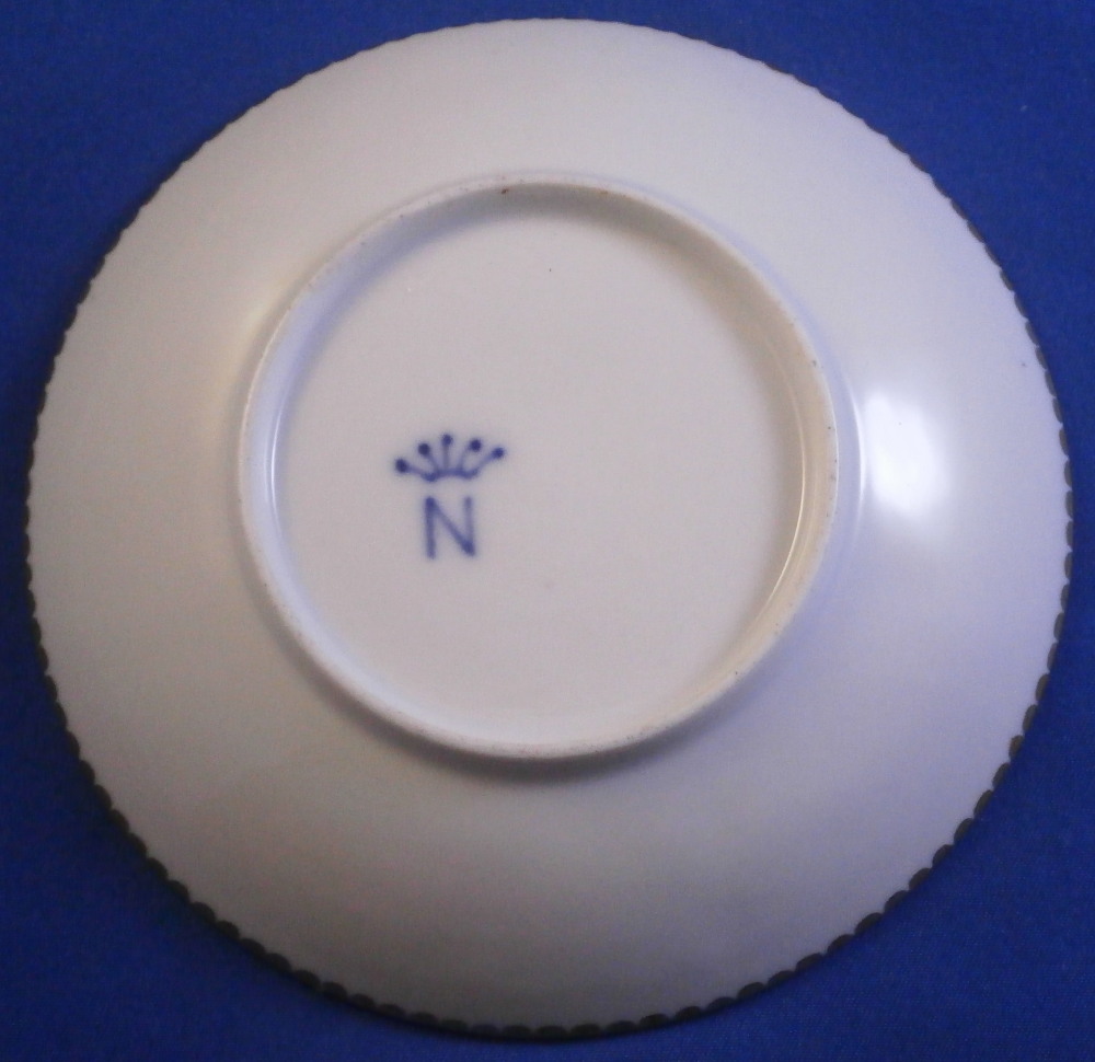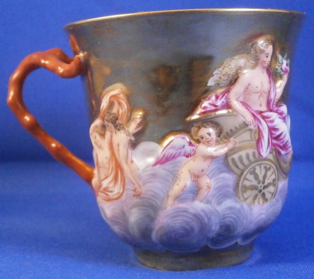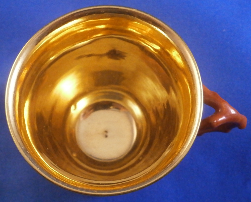This is a great demitasse sized cup and sacuer set made by Doccia / Richard Ginori in the second half of the 19th century. One rarely sees these fully gilded sets! The cup has the typical raised relief decoration of mythical / biblical theme on it that is hand painted as well as the typical red corral handle. The saucer has the floral garlands held up by scroll designs typical for this mark but what is unusual is that the areas that would normally be white are in this case completely gilded which looks quite elegant. The set is in superb condition with just a very minor touch of use marks to the gilding which is to be expected. The cup and saucer are both marked underneath with an under glaze blue N under a crown as shown. The cup is 2.25 inches tall and about 2.25 inches in diameter. The saucer is 0.75 inches tall and 4.5 inches in diameter. Please email me for more information or other pictures.