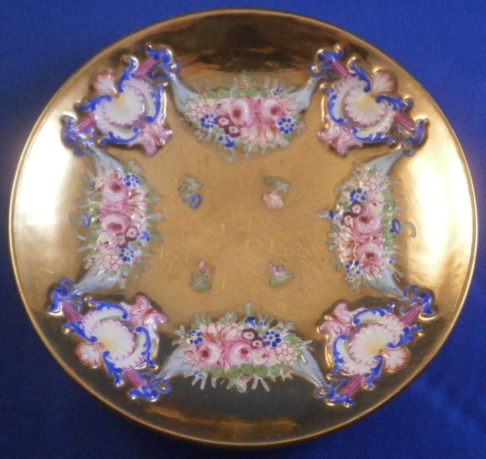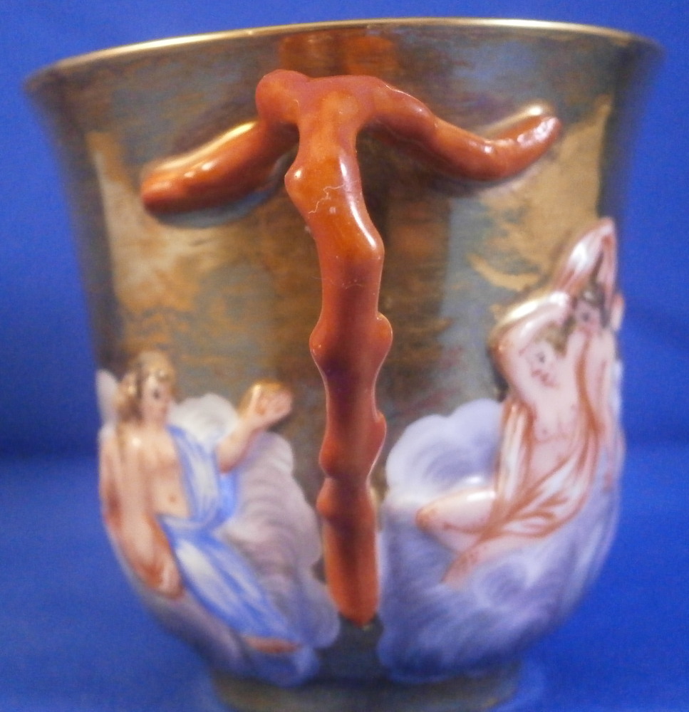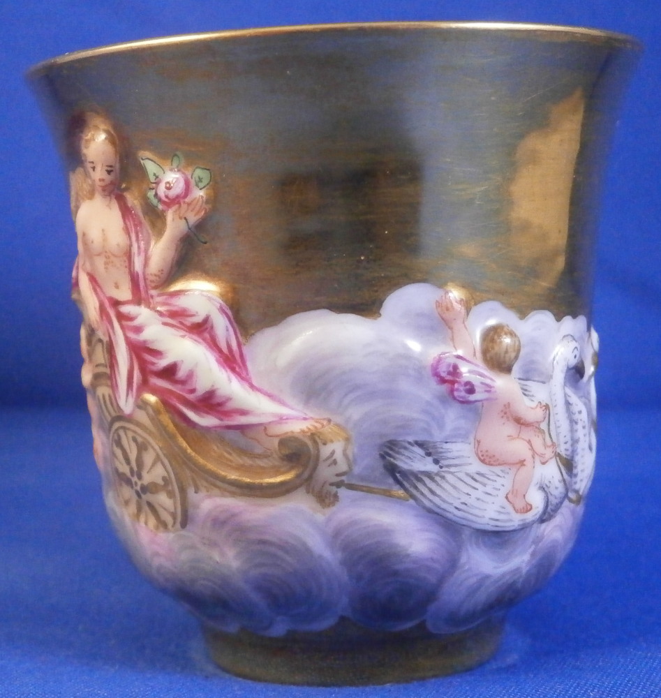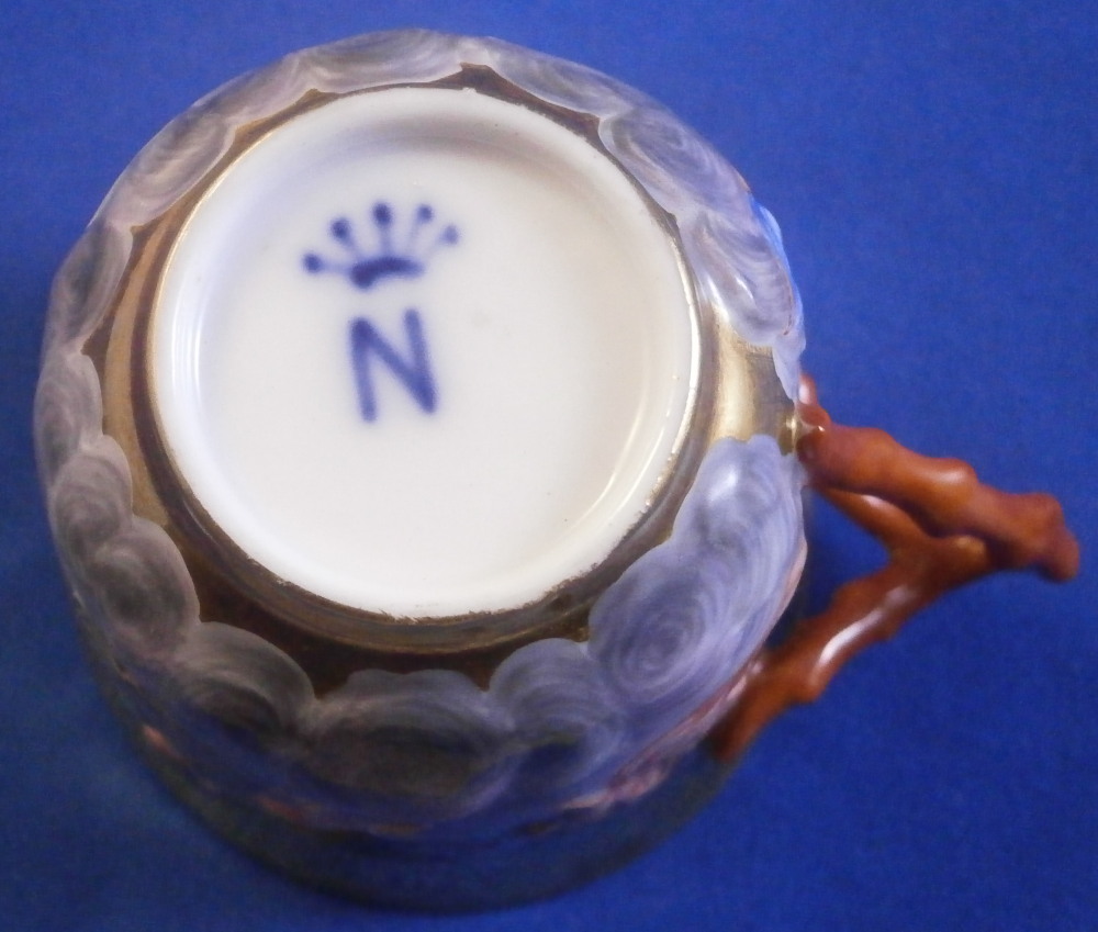 This is a great demitasse sized cup and sacuer set made by Doccia / Richard Ginori in the second half of the 19th century. One rarely sees these fully gilded sets! The cup has the typical raised relief decoration of mythical / biblical theme on it that is hand painted as well as the typical red corral handle. The saucer has the floral garlands held up by scroll designs typical for this mark but what is unusual is that the areas that would normally be white are in this case completely gilded which looks quite elegant. The set is in superb condition with just a very minor touch of use marks to the gilding which is to be expected. The cup and saucer are both marked underneath with an under glaze blue N under a crown as shown. The cup is 2.25 inches tall and about 2.25 inches in diameter. The saucer is 0.75 inches tall and 4.5 inches in diameter. Please email me for more information or other pictures.