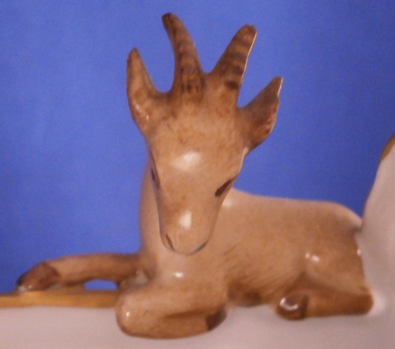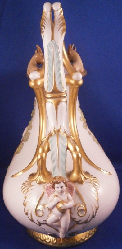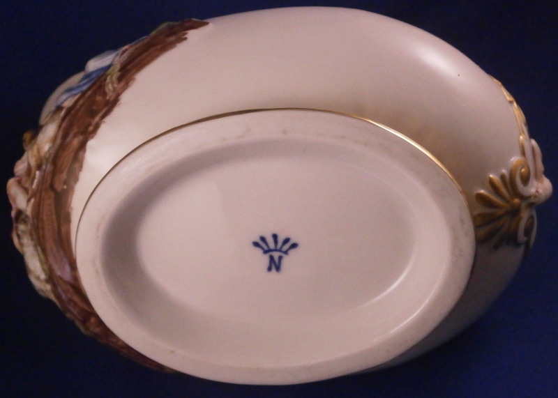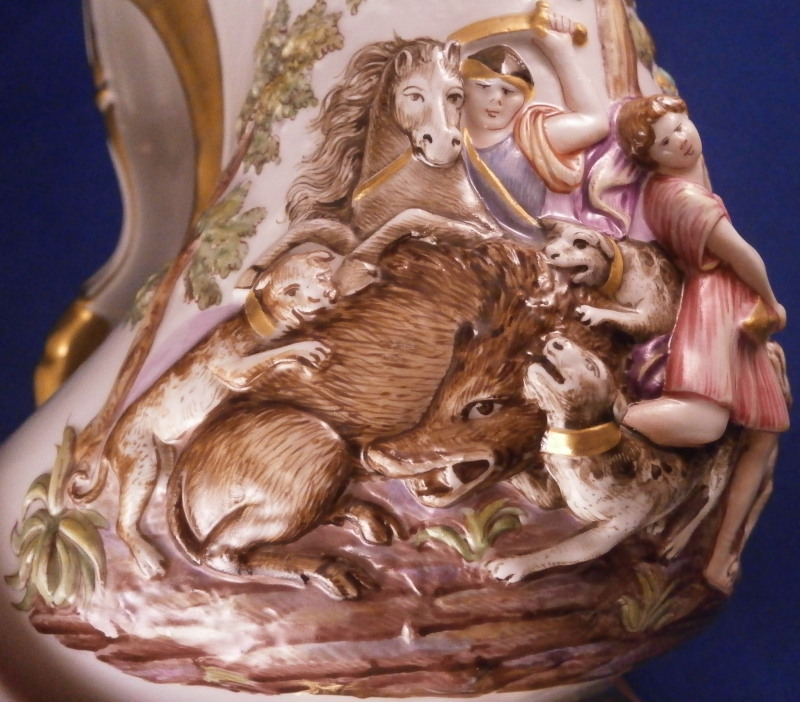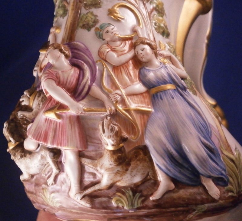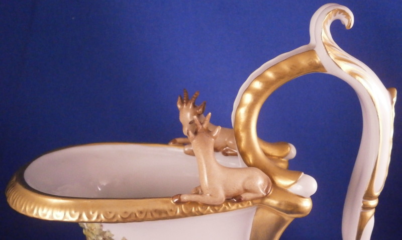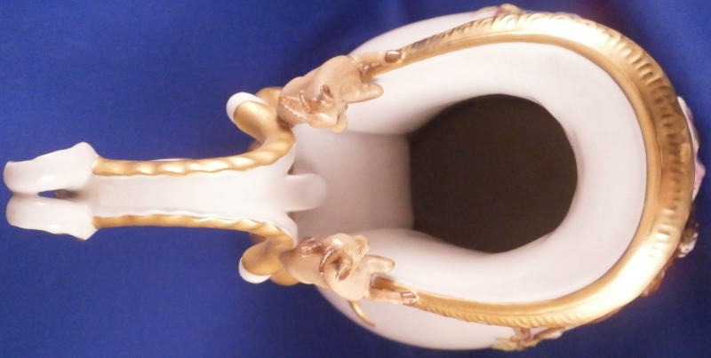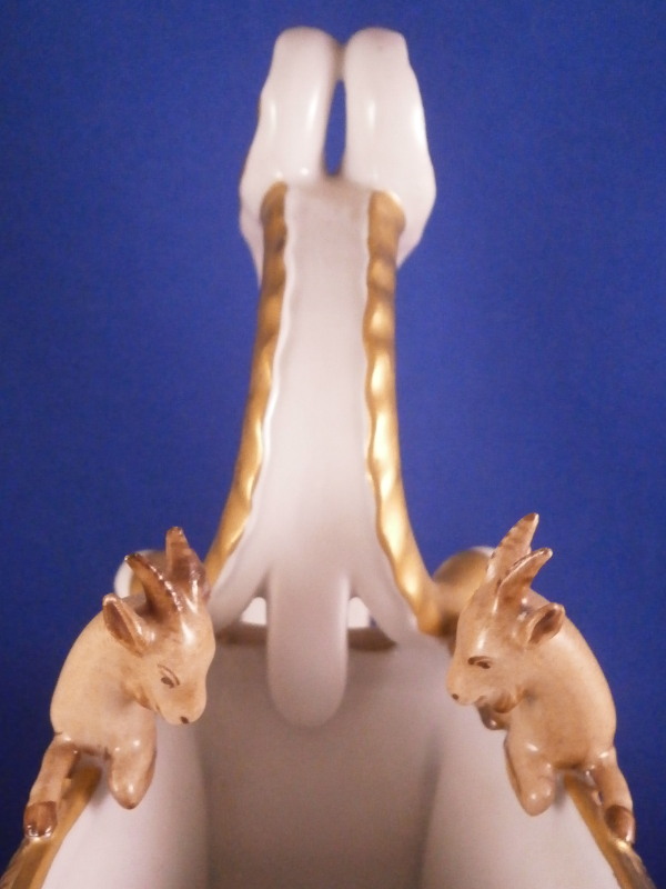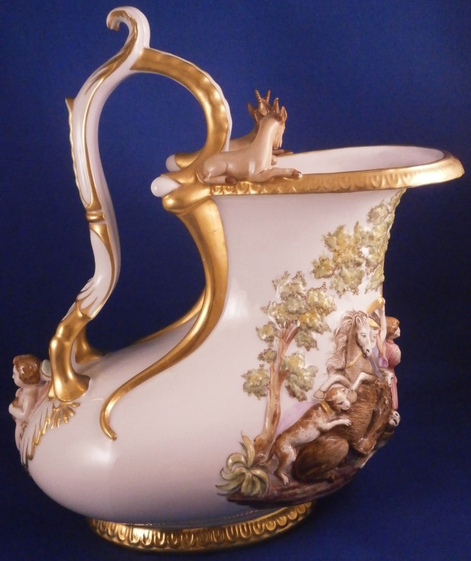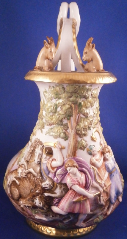 This is a rare pitcher made by Doccia / Ginori in the late 19th century. Not a shape one comes across very often at all by them but this shape was made by different makers including KPM Berlin. Not sure who made it originally. The nicely shaped jug has two goats sitting on the top rim near the handle which has a nice design to it with a cherub at the bottom terminal but my favorite is the relif scene to the front all hand painted to look very stunning. Lots of gold trim to the piece and some relief designs to the rims. The pitcher is in perfect condition. It is marked with the crown over N mark copied so often but in this case definitely original as the quality is just superb and the underside typical of Richard Ginori. The pitcher is about 9 inches tall, 7.5 inches from wide and about 4.5 inches deep. Please email me for more information or other pictures.