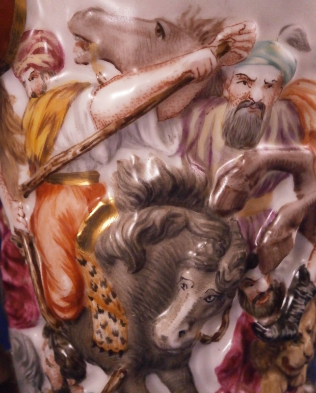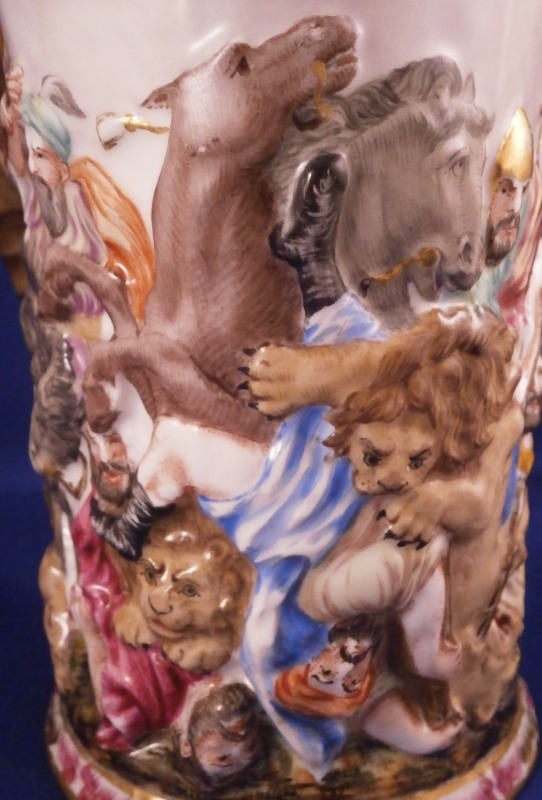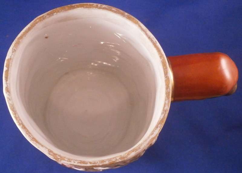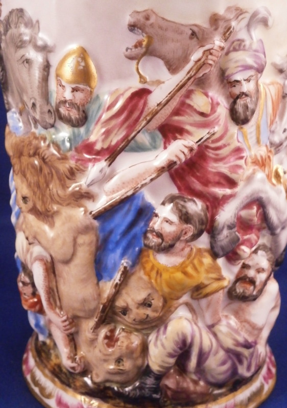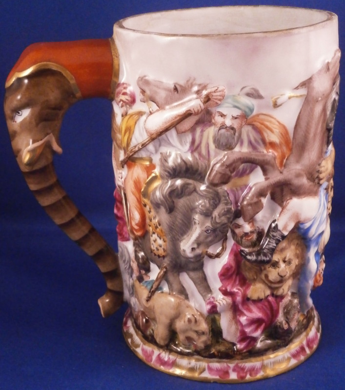 This is a superb scenic stein / tankard made by Doccia / Richard Ginori in the mid to late 19th century. An amazing piece that has a superb battle relief scene all around the main body all hand painted to perfection and very detailed with a puce and gold trim to the bottom edge. Top edge has a gold trim to it. This piece comes with its original lid but oddly enough it does not have the bronze hardware that most often comes with these pieces and connect the lid and main body. Not sure why but I like it this way. Easier to drink from! The figural handle is in the shape of an elephant head with the trunk forming the handle which is just plain fun! The piece is marked with the under glaze blue letter N under a crown mark as shown. The mug alone is about 5.75 and it has a bottom diameter of 3.875 inches. The lid adds about another 2.375 inches in height. It is decorated in puce and gold with a nice design and has a fantastic lion finial to the top. The tankard and lid are in great condition with a tiny bit of wear and a shallow chip to the udnerside edge which is only barely visible from the side. It displays perfectly! Please email me for more information or photos.