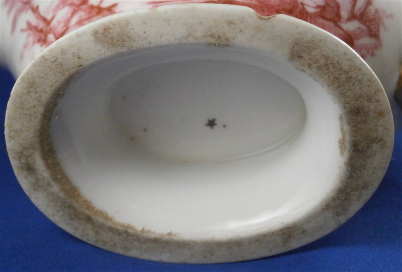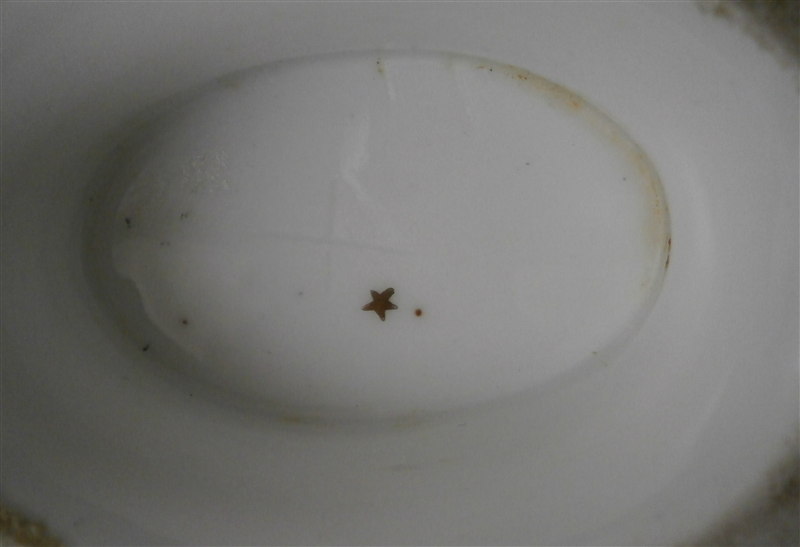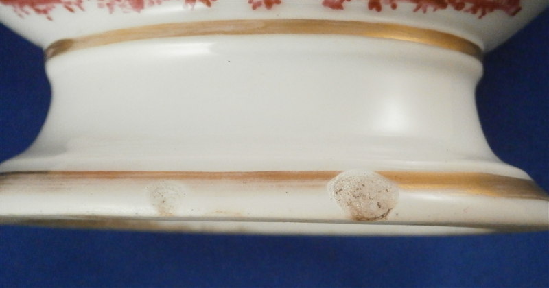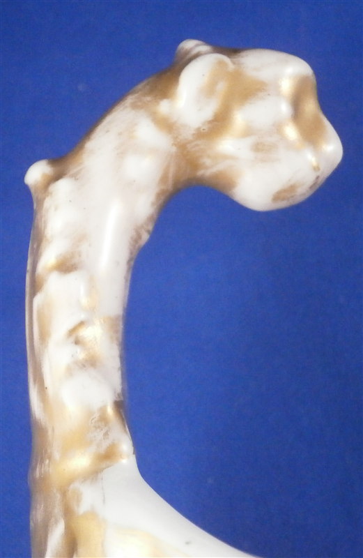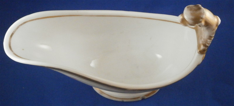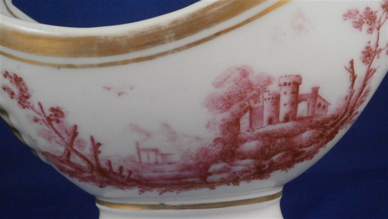 This is a rare sauce boat or sauce dish made by Doccia in the first half of the 19th century. It is hand painted with two great puce landscape scenes to the sides and a figural lion head handle highlighted with gilding. Gold trim to the edges. An unusual piece I ahve not come across from them in an attractive shape. The dish is in good condition with wear to the gilding and two chips to the foot edge on one side as shown. The piece is 5.75 inch tall, 7.5 inches long and 3.375 inches wide. The base is marked underneath with a gold star as well as an incised cross and two lines. Please email me for more information or other pictures.