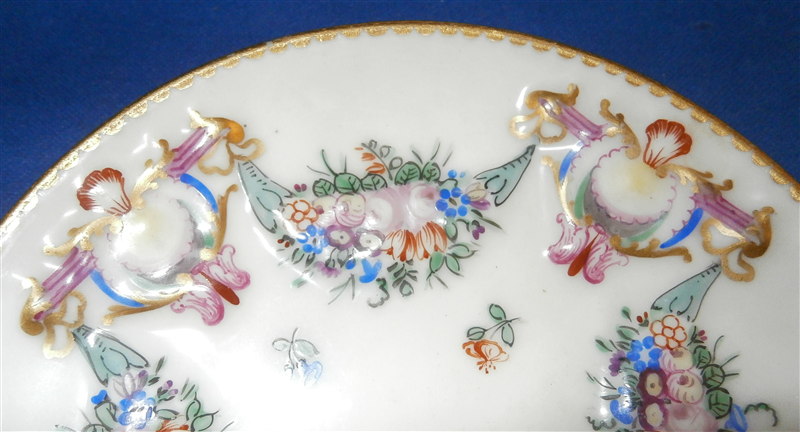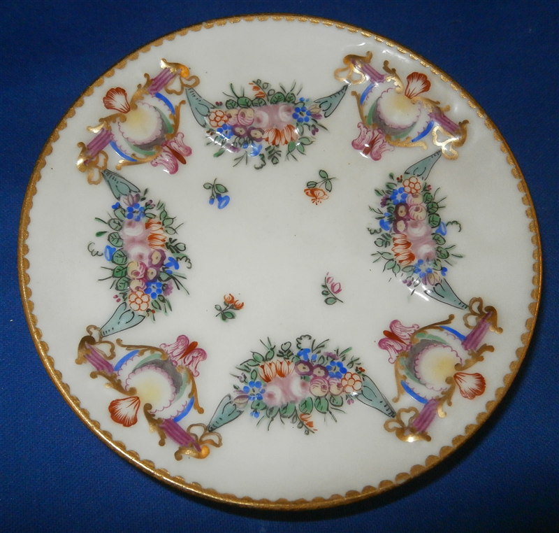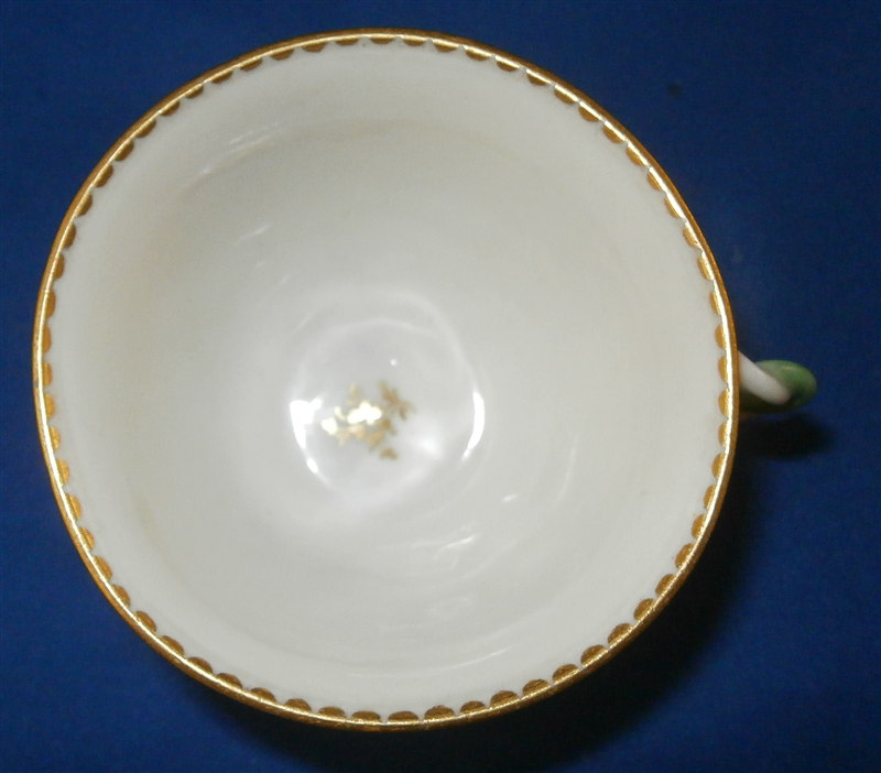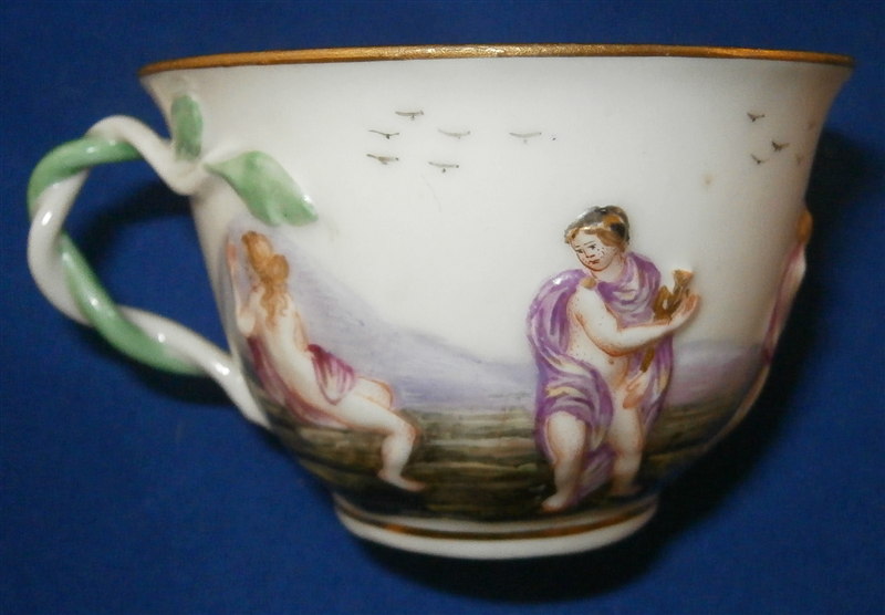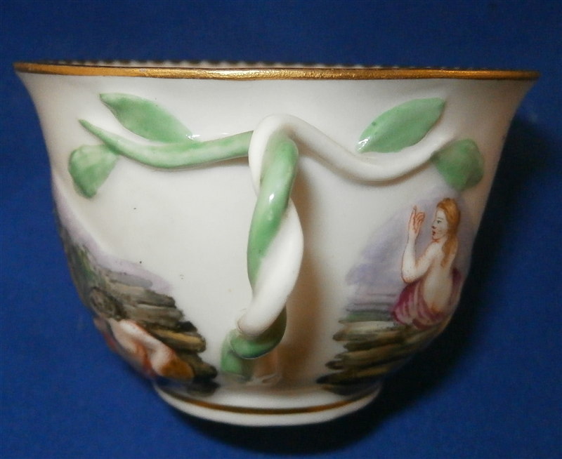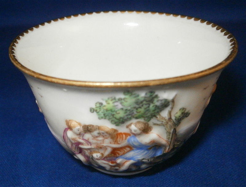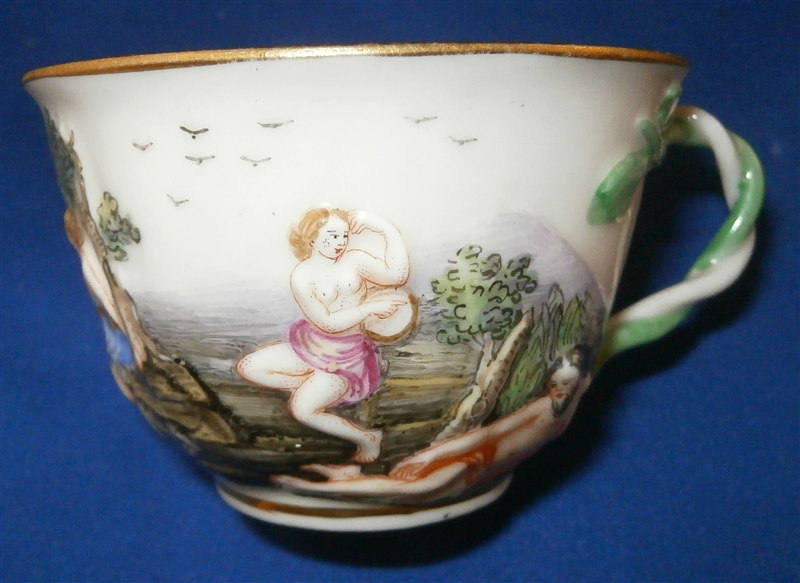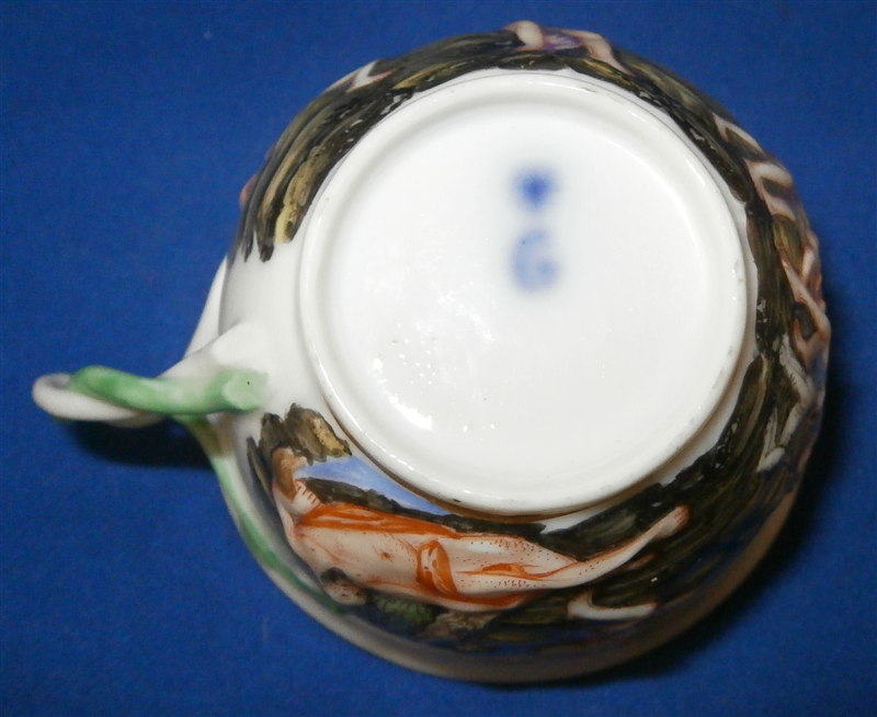 This is a demitasse cup and saucer made by Doccia / Ginori in the 19th century. The cup is decorated with biblical or mythological scenes in relief all around that are hand painted very nicely. It has a twisted branch handle with leaves at the ends and the saucer is decorated with floral garlands connected by a nice shell design. Nice gold trim to the rims. The set is in perfect condition. The saucer is marked with the common crown over N mark copied so often by other makers from this original (and often msitakenly called Capodimonte )as well as two incised lines. The interesting mark and one I ahve not seen before is underneath the cup - A capital G with a star above it in udner glaze blue. The cup is 1.75 inches tall and about 2.625 inches in diameter. The saucer is 0.75 inches tall and 4.5 inches in diameter. Please email me for more information or other pictures.