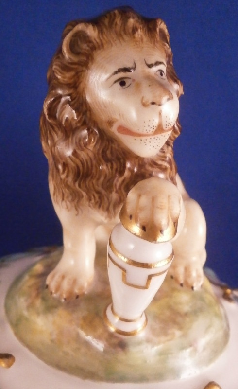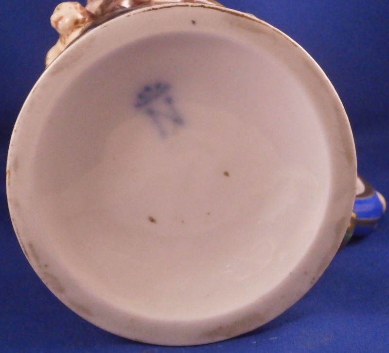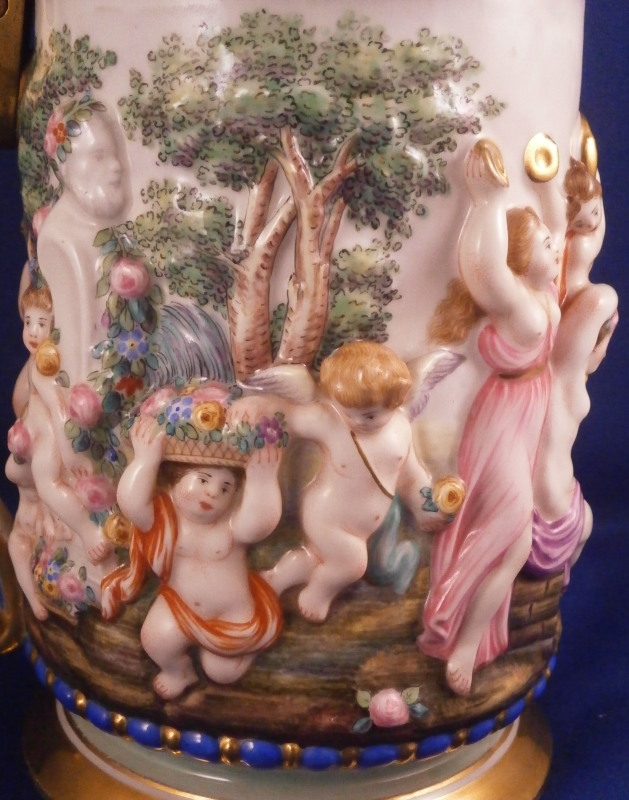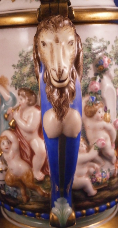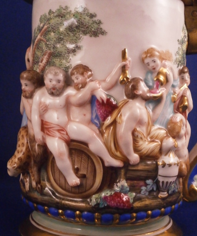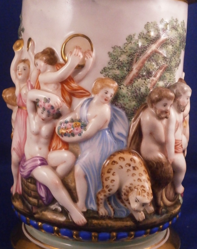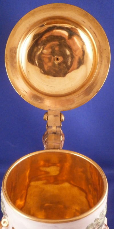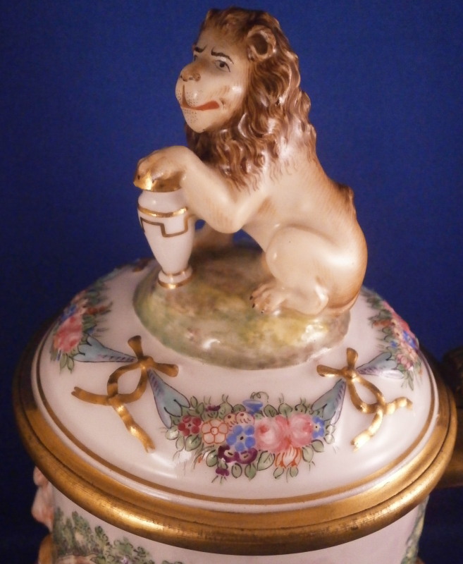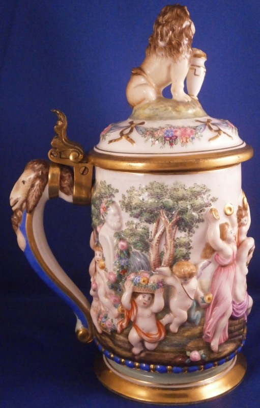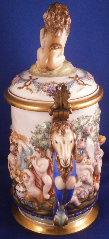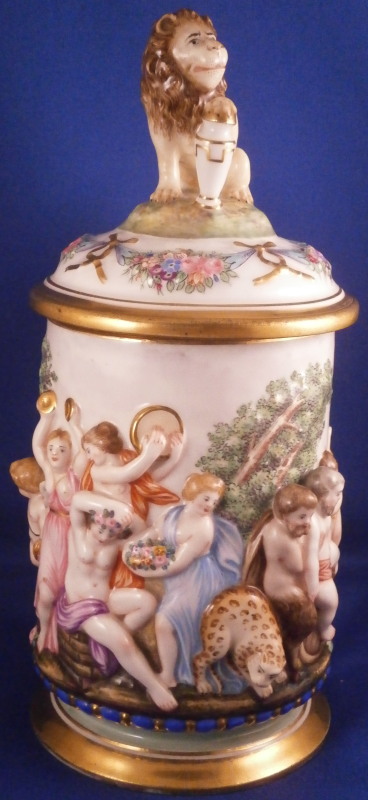 This is a superb scenic lidded stein / tankard made by Doccia / Richard Ginori in the mid to late 19th century. An amazing piece that has their signature relief biblical / mythological scenes all around the central part of the body all hand painted to perfection and very detailed with a colorful trim to the bottom including a blue and gold "pearl" trim along the bottom. Top edge has a gold line to it coming out of the entirely gilded interior and the bottom edge is gilded as well. The lid has their typical floral garland and bows design to the rim with a large lion with its paw on a vase finial. The handle is amazing but a bit strange - a camel's haed with nude breasts below it. The metal fitting are bronze or brass. Precision work on the mounts since when the lid is open the thumb rest sits right on top of the camel's head. A proper container for your evening beer! The piece is marked with the under glaze blue letter N under a crown mark as shown.The entire stein including the lid is about 9.25 and it has a bottom diameter of 4 inches. The tankard is in perfect condition with just some gold wear on the edge of the bottom. A superb piece that is hard to find! Comes with a bit of provenance as well as shown. Please email me for more information or photos.