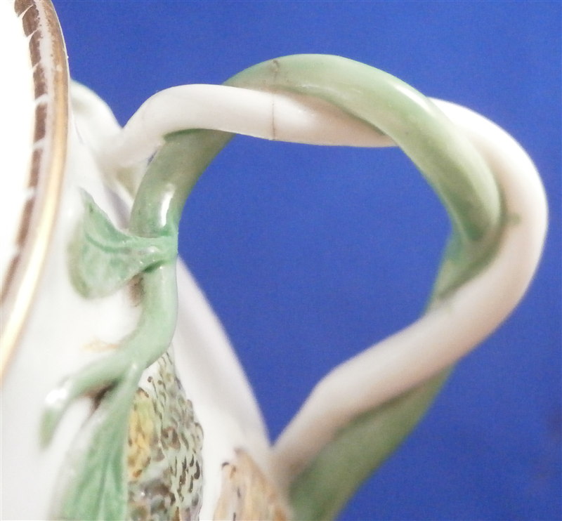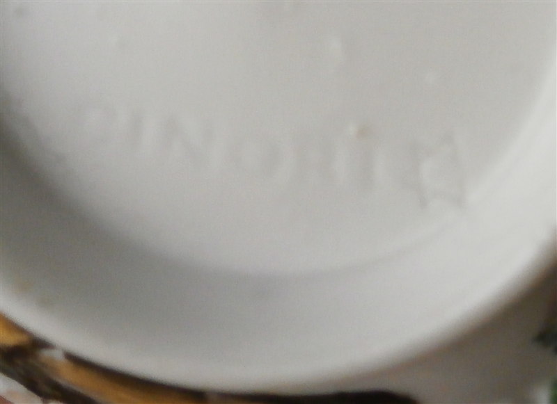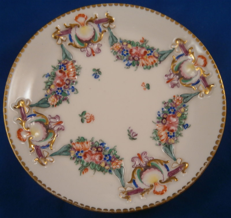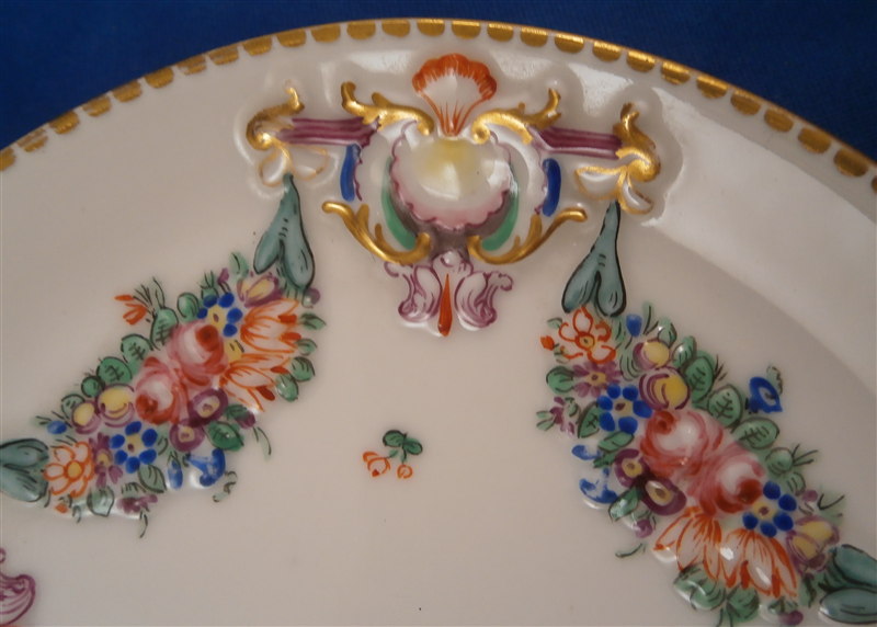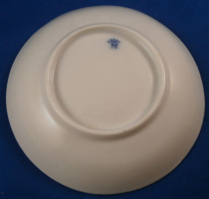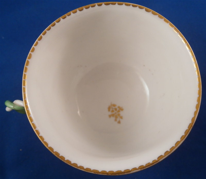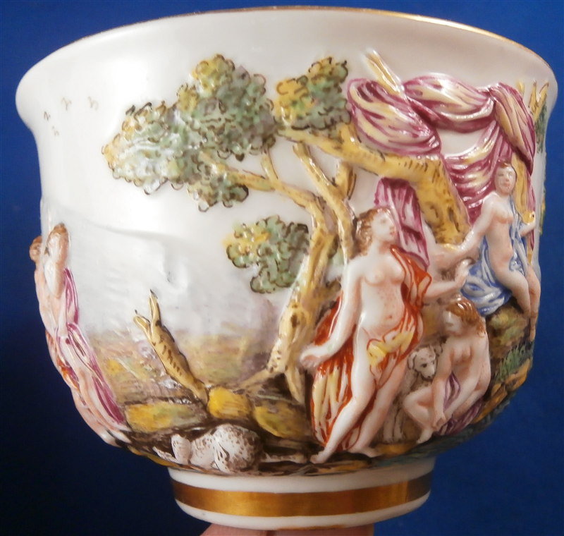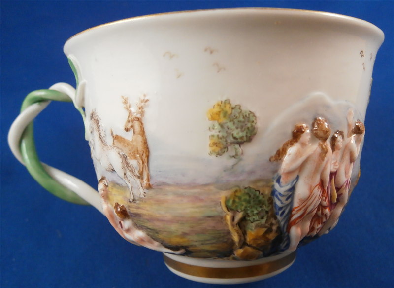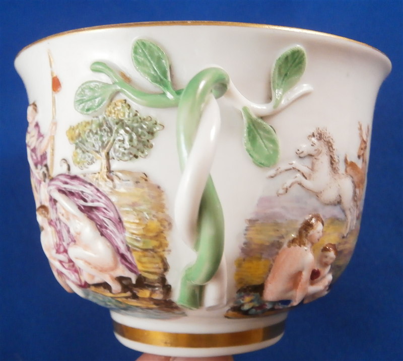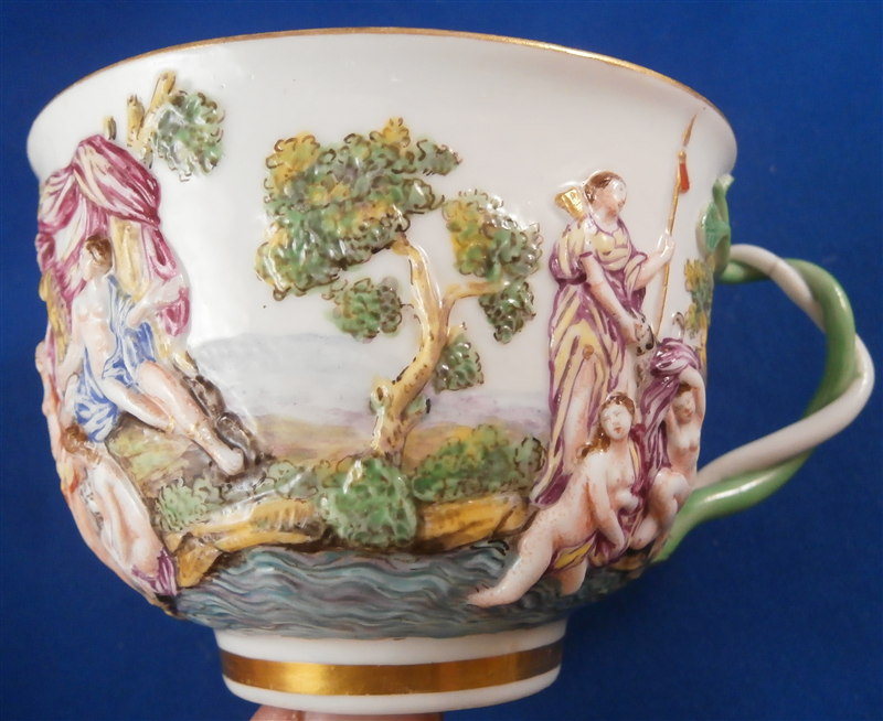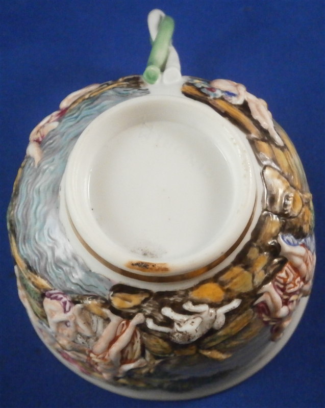 This is a cup and saucer made by Doccia / Ginori in the 19th century. The cup is decorated with biblical or mythological scenes in relief all around that are handpainted very nicely. It has a twisted branch handle with leaves at the ends and the saucer is decorated with floral garlands connected by a nice shell design. Nice gold trim to the rims. The set is in great condition with cracks in the top part of the handle as shown. It does not affect the piece at all. A bit of gold wear to the edge. The saucer is marked with the common crown over N mark copied so often by other makers from this original but the cup has an unusual mark of impressed GINORI with a star behind it. I don't think I have ever seen this combo before. Probably dates the cup to the early 1860's when the star mark was phased out and the Ginori mark came into use. The cup is 2.5 inches tall and about 3.375 inches in diameter. The saucer is 1 inch tall and 5.5 inches in diameter. Please email me for more information or other pictures.