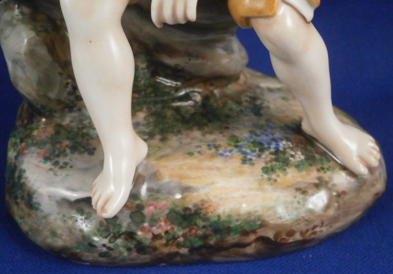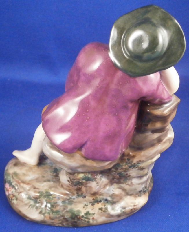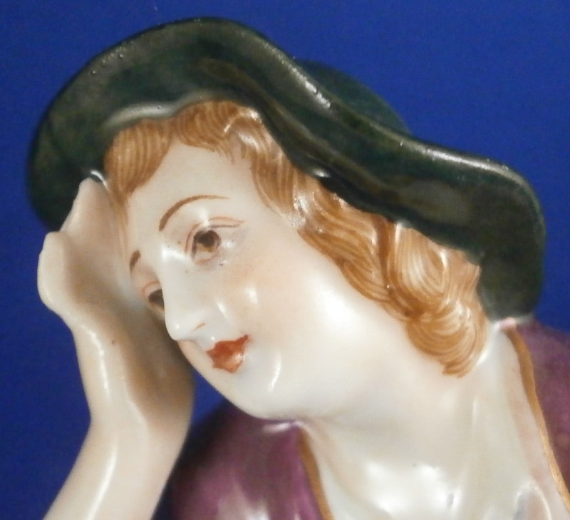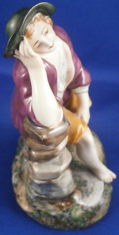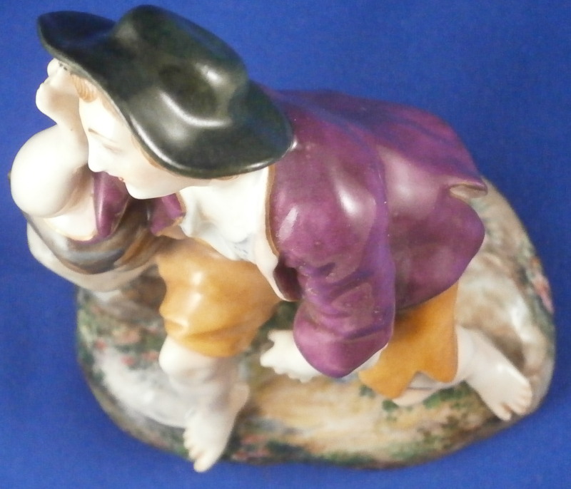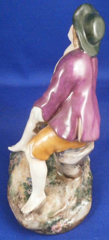 This is a figurine of a gentleman Ginori / Doccia in the late 19th century. The young man is deep in thought thinking about his lost love or something. He is nicely dressed sitting on some rocks that are on a base painted with small flowers and greenery. Really a nice figure that is hand painted to perfection. The piece is in perfect condition. It is marked with the crown over N mark in under glaze blue underneath as shown. There is an area next to the mark that was ground away a bit - likely stated Made in Italy and they tried to make it seem older than it is. A very nice figurine but not 18th century sadly. The figurine is 4.75 inches tall, 3.375 inches wide and 2.25 inches deep. Please email me for more information or other pictures.