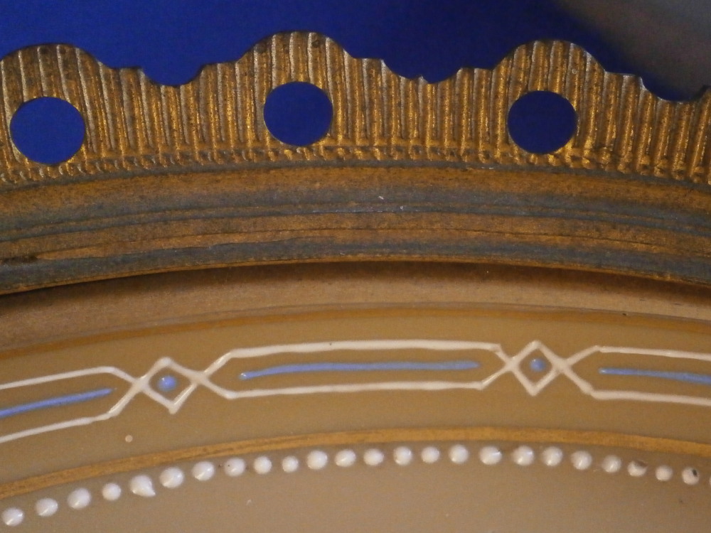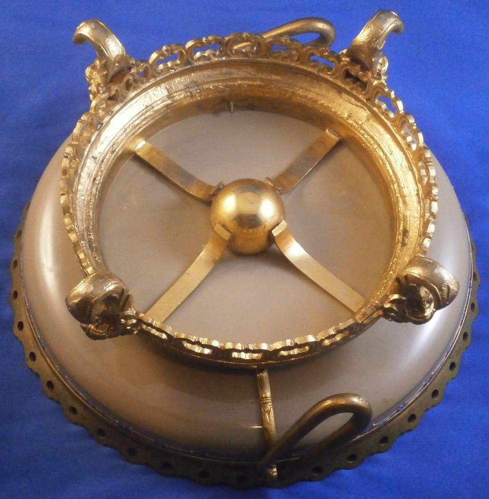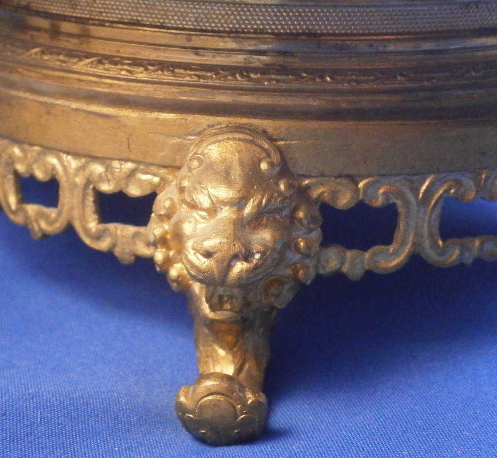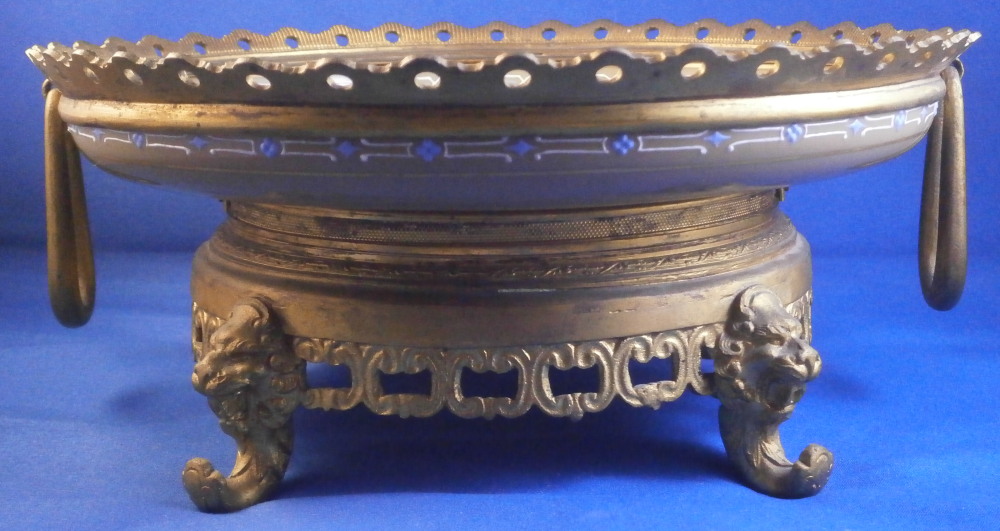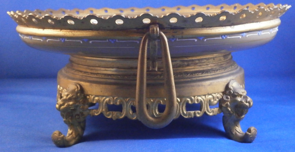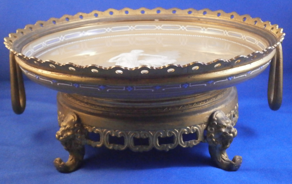 This is an interesting pedestal dish / tazza made of glass and brass or bronze. I am not a glass guy but this was a really neat piece of top quality so I could not say no. From what I can figure out this sort of brown glass was made by a Czech / Bohemian company called Harrach ( Harrachov )in the late 19th century. The dsign possibly done by Alfons Maria Mucha . The dish itself is made of that brown glass and has a flat shape to it with a steep outer edge. It is decorated with what I would call Limoges enamel in the porcelain world but not sure what it would be called in the glass world. A nice blue, white and gold trim to the inner edge as well as the outside edge but what really caught my eye was a superb scene in the center of a lady / priestess at an offering table. The quality anddetail of that scene is absolutely top notch. The scene has a blue and white fancy design under it. From what I could figure out is that around 1876, Harrach decorated a limited number of glass pieces in a Renaissance Revival framework, with carefully painted small depictions intended to emulate cameos of that time period. It is a type of white enamel or paste applied in thin layers, similar to pate-sur-pate on porcelain. The cameos were typically of putti but the scene here is much nicer. What only adds to this piece is the bronze or brass base with lion feet and lots of detail to the metal plus a handle to each side. Each of the feet is marked with an impressed EH as shown. A truly stunning piece of amazing quality! The piece is in superb condition with some oxidation to the metal which is a given over this time period. The entire piece is about 3.625 inches tall with a diameter of 8.375 inches. Please email me for more information or photos.