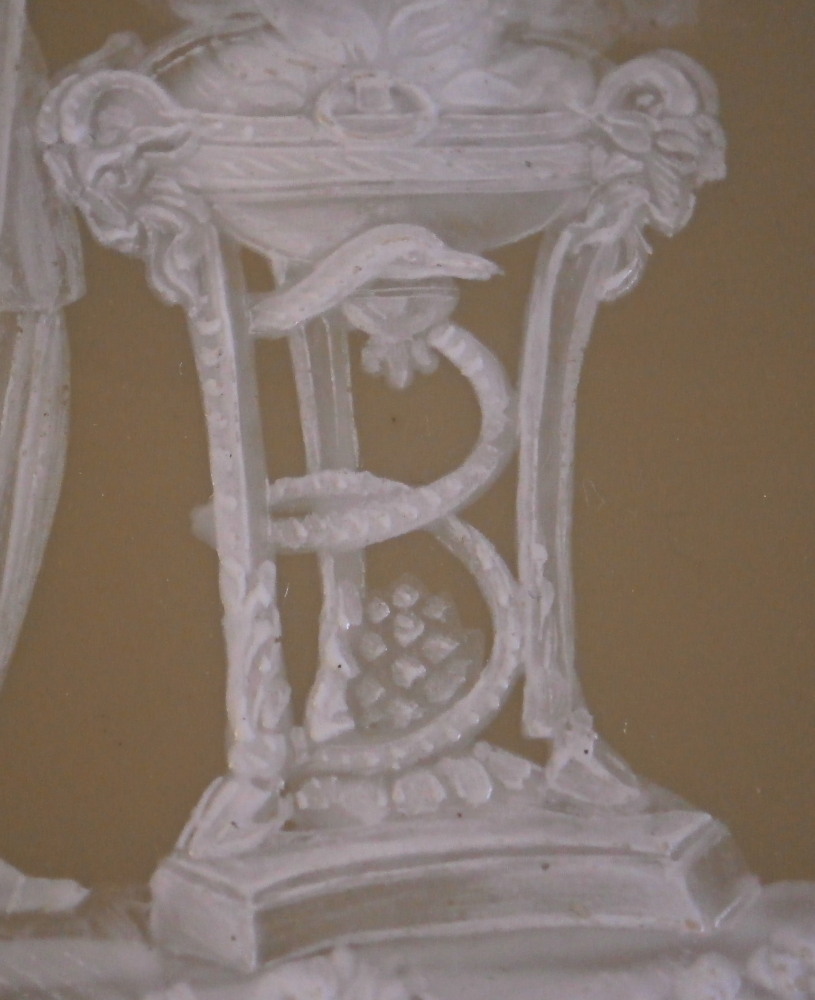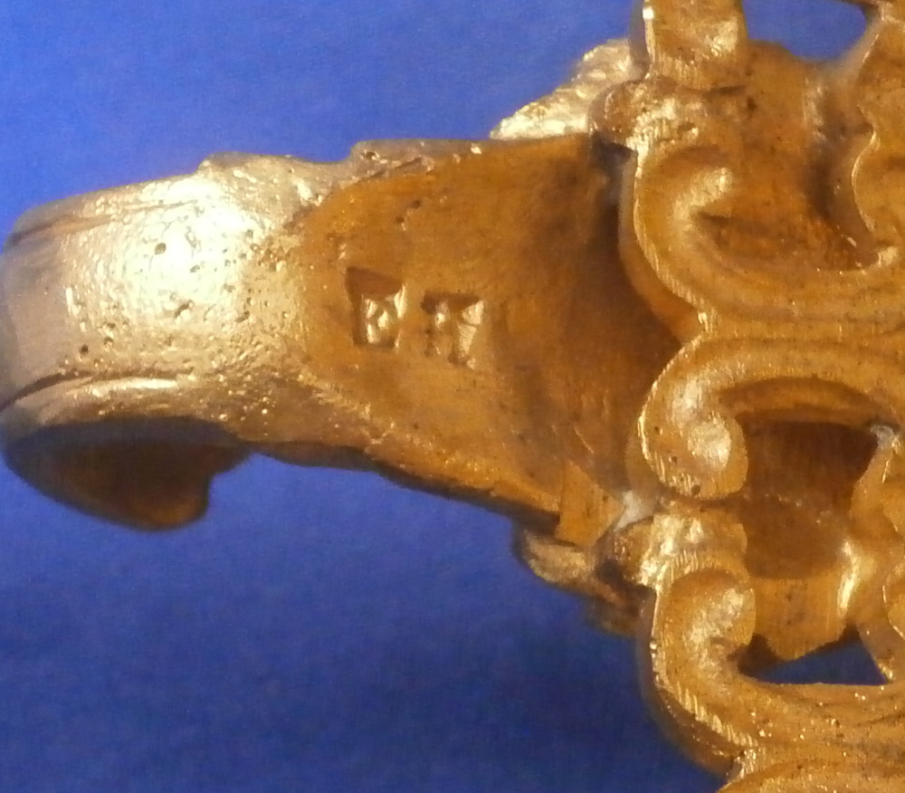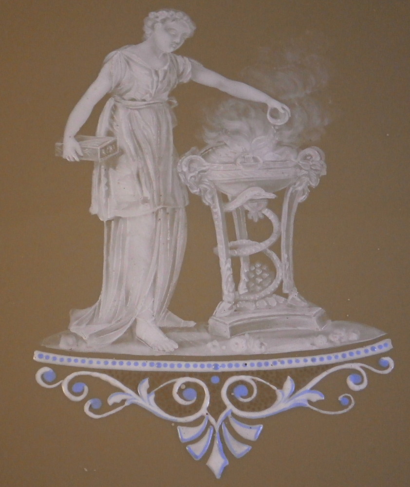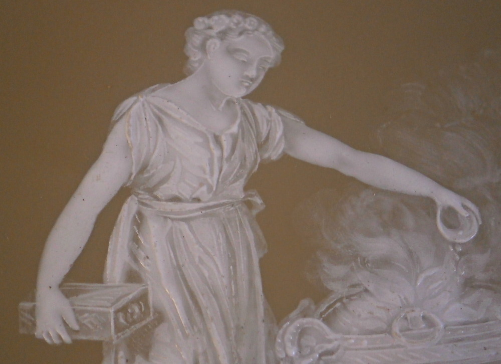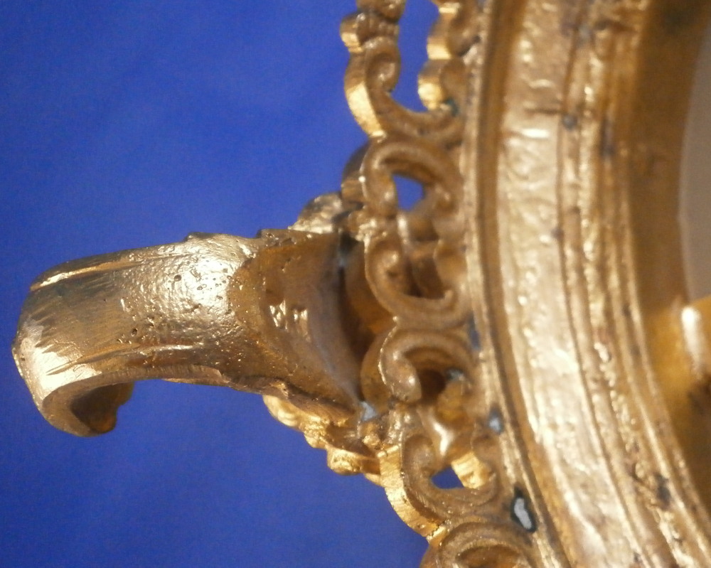 This is an interesting pedestal dish / tazza made of glass and brass or bronze. I am not a glass guy but this was a really neat piece of top quality so I could not say no. From what I can figure out this sort of brown glass was made by a Czech / Bohemian company called Harrach ( Harrachov )in the late 19th century. The dsign possibly done by Alfons Maria Mucha . The dish itself is made of that brown glass and has a flat shape to it with a steep outer edge. It is decorated with what I would call Limoges enamel in the porcelain world but not sure what it would be called in the glass world. A nice blue, white and gold trim to the inner edge as well as the outside edge but what really caught my eye was a superb scene in the center of a lady / priestess at an offering table. The quality anddetail of that scene is absolutely top notch. The scene has a blue and white fancy design under it. From what I could figure out is that around 1876, Harrach decorated a limited number of glass pieces in a Renaissance Revival framework, with carefully painted small depictions intended to emulate cameos of that time period. It is a type of white enamel or paste applied in thin layers, similar to pate-sur-pate on porcelain. The cameos were typically of putti but the scene here is much nicer. What only adds to this piece is the bronze or brass base with lion feet and lots of detail to the metal plus a handle to each side. Each of the feet is marked with an impressed EH as shown. A truly stunning piece of amazing quality! The piece is in superb condition with some oxidation to the metal which is a given over this time period. The entire piece is about 3.625 inches tall with a diameter of 8.375 inches. Please email me for more information or photos.
