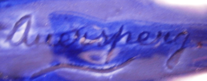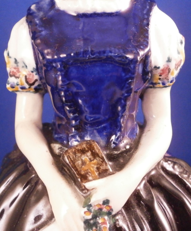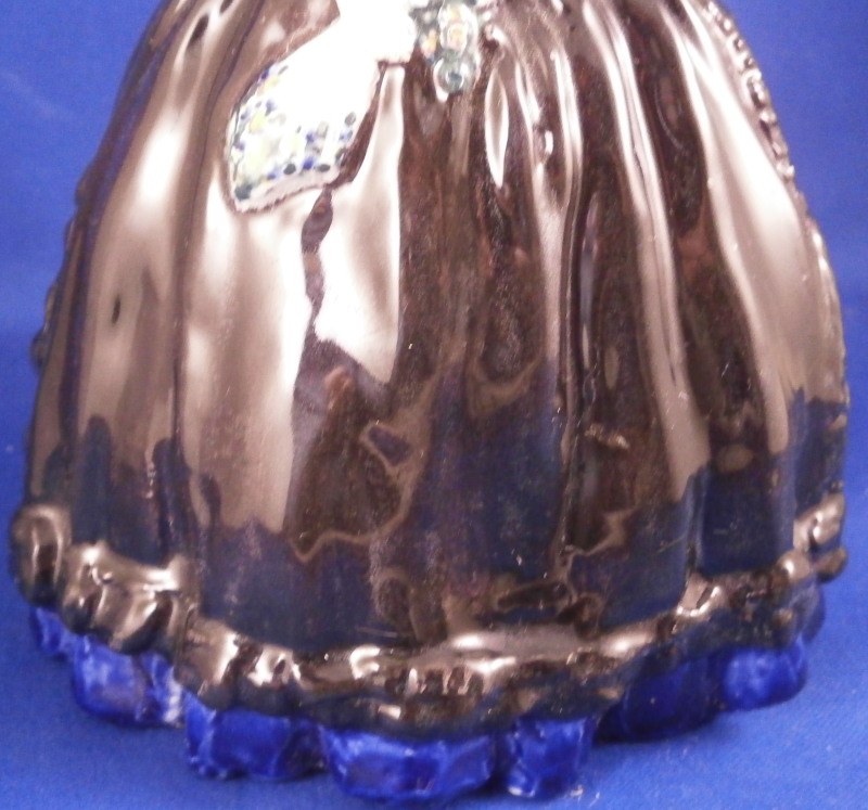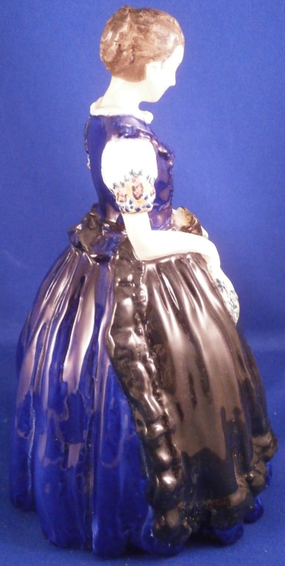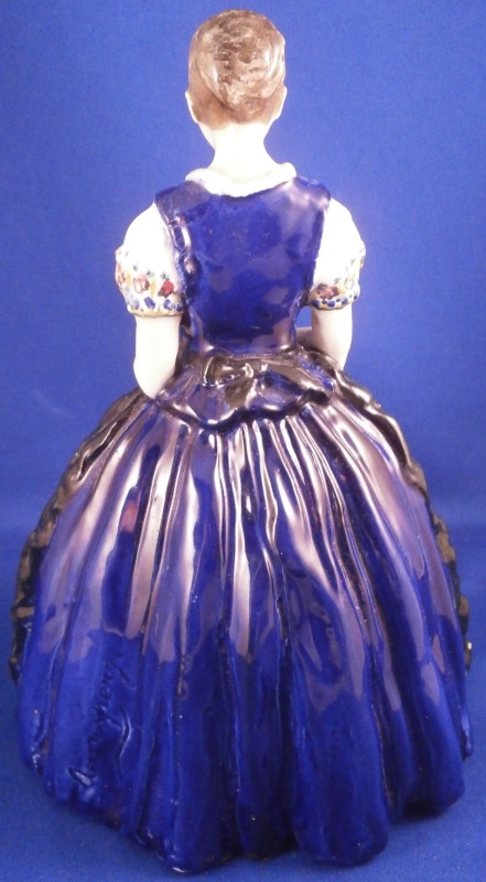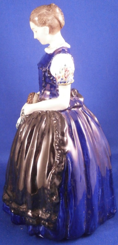 This is a cermic figurine made by Friedrich Goldscheider around 1915. A nice and early piece still made in Austria before the company moved and split up. The figurine is of a nicely modeled lady in a wide blue skirt with a black apron. She is wearing a blue blouse with white sleeves that have flowers along the sleeve edges. Her hands are in front holding a bible and a floral handkerchief. Nicely handpainted. She is marked on the bottom inside with the early Eagle stamp with Vienna under it as well as the letters F. and G. plus the model number 4613 / 2/ 05 and the Roman numeral V, Another letter F on the other side and an X. The artist signature to the back of her dress - Auersperg I believe it states. The figure is a 7.375 inches tall, 4.75 inches wide and 4.375 inches deep. She is in great condition with some very old glue residue to the underside - someone likely had glued some felt to the udnerside in order to keep it from scratching the wood shelf where she was displayed. One spot of flaking to the glaze on the side of her apron. She displays beautifully and looks great! Please email me for more information or photos.
