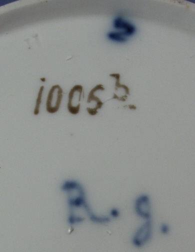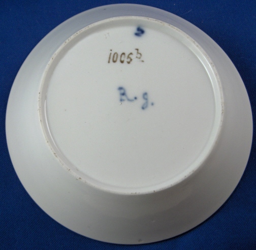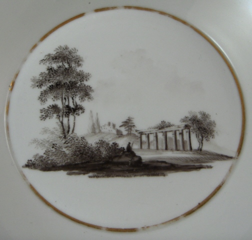 This is a saucer made by Gotha around 1790. This saucer is another superb example of Gotha's work - it is in the classicism style and has a handpainted ruin scene in schwarzlot (black) on the inside of the saucer. Nice gold trim around the scene and on the rim. The piece is in good condition with a little wear to the gold trim. The saucer is marked underneath with the underglaze blue R.g. mark, a blue number 2 and impressed 11 or something along those lines and 1005b in black which might be a former collection or museum ID. The saucer is 5 inches in diameter and 1.125 inches tall. Please email me for more information or photos.
