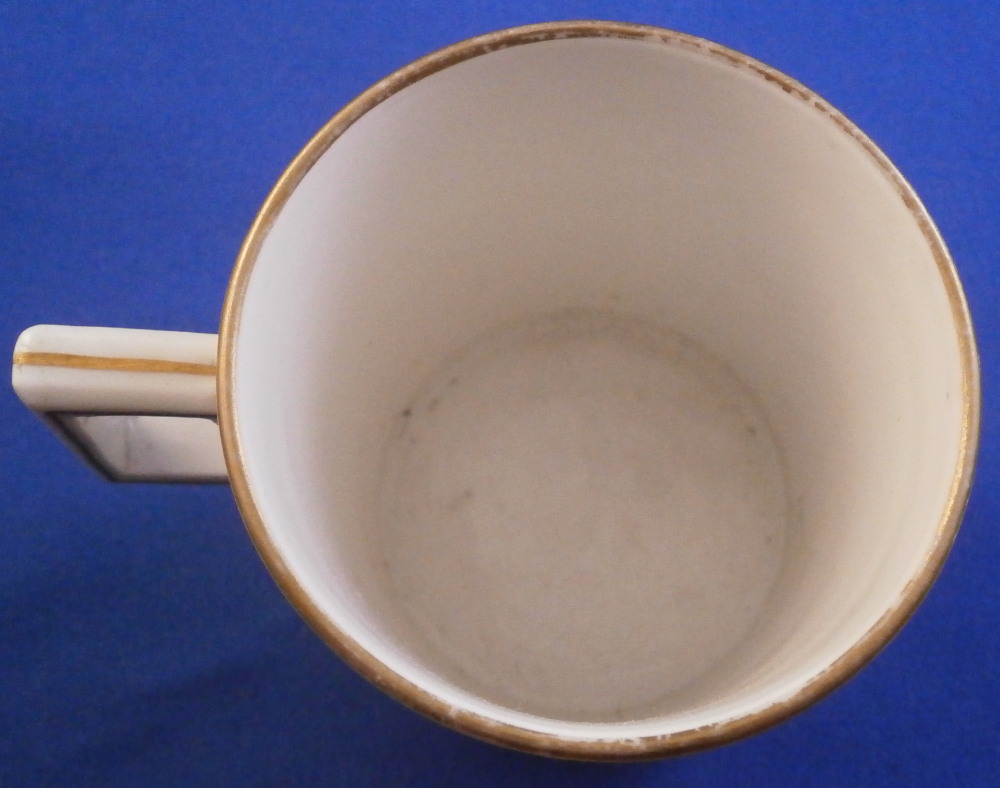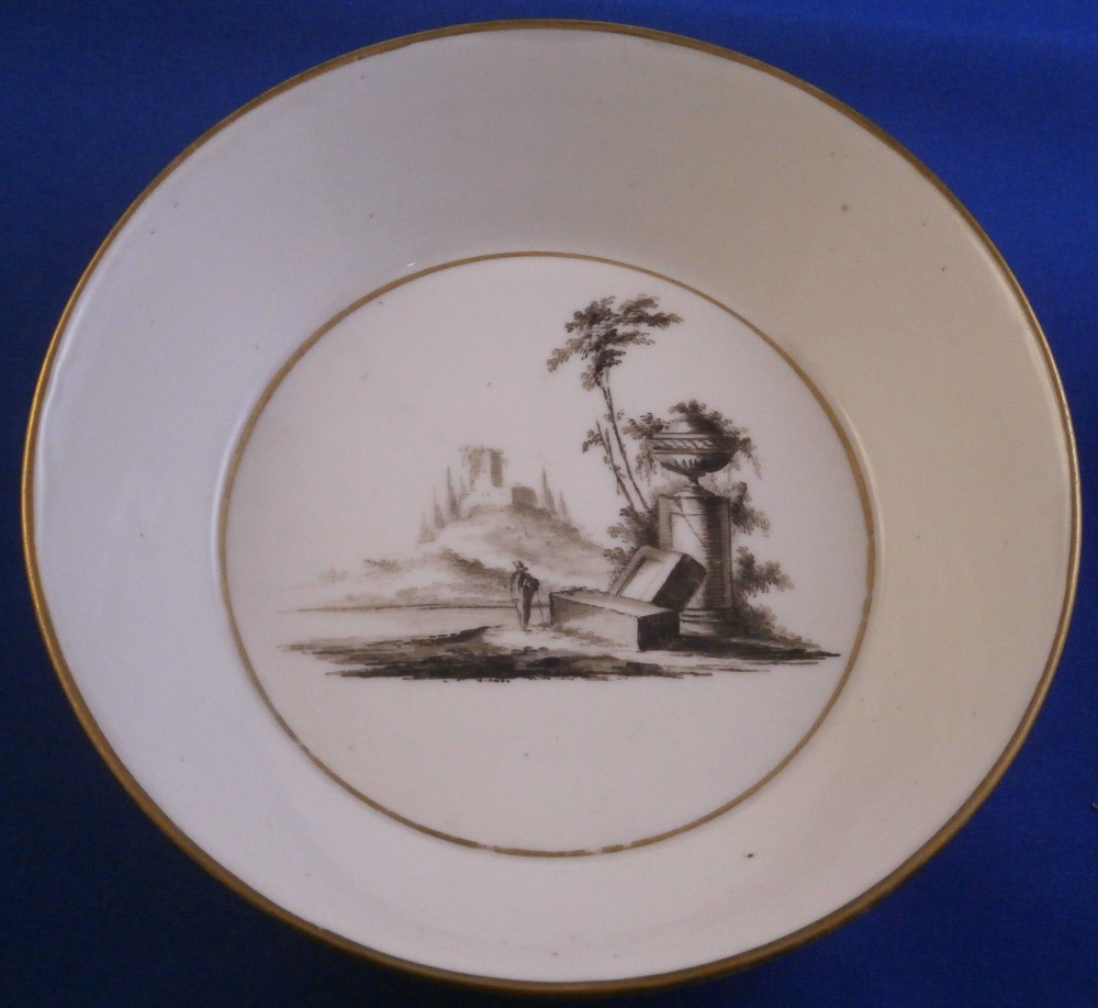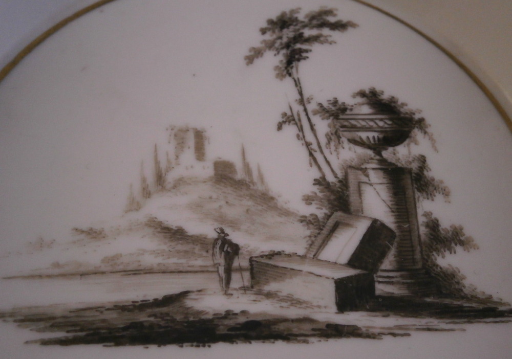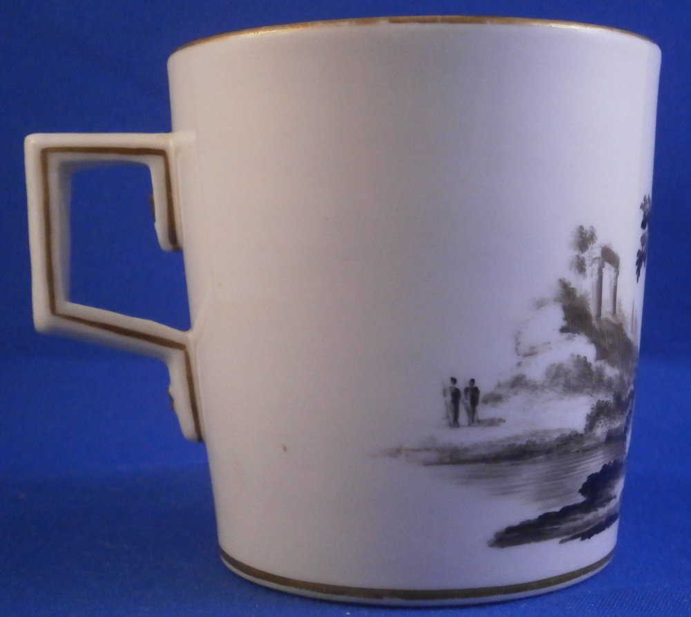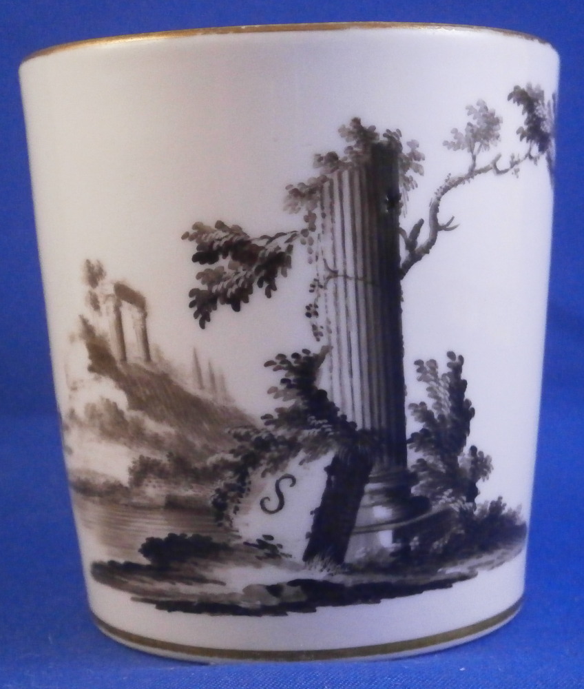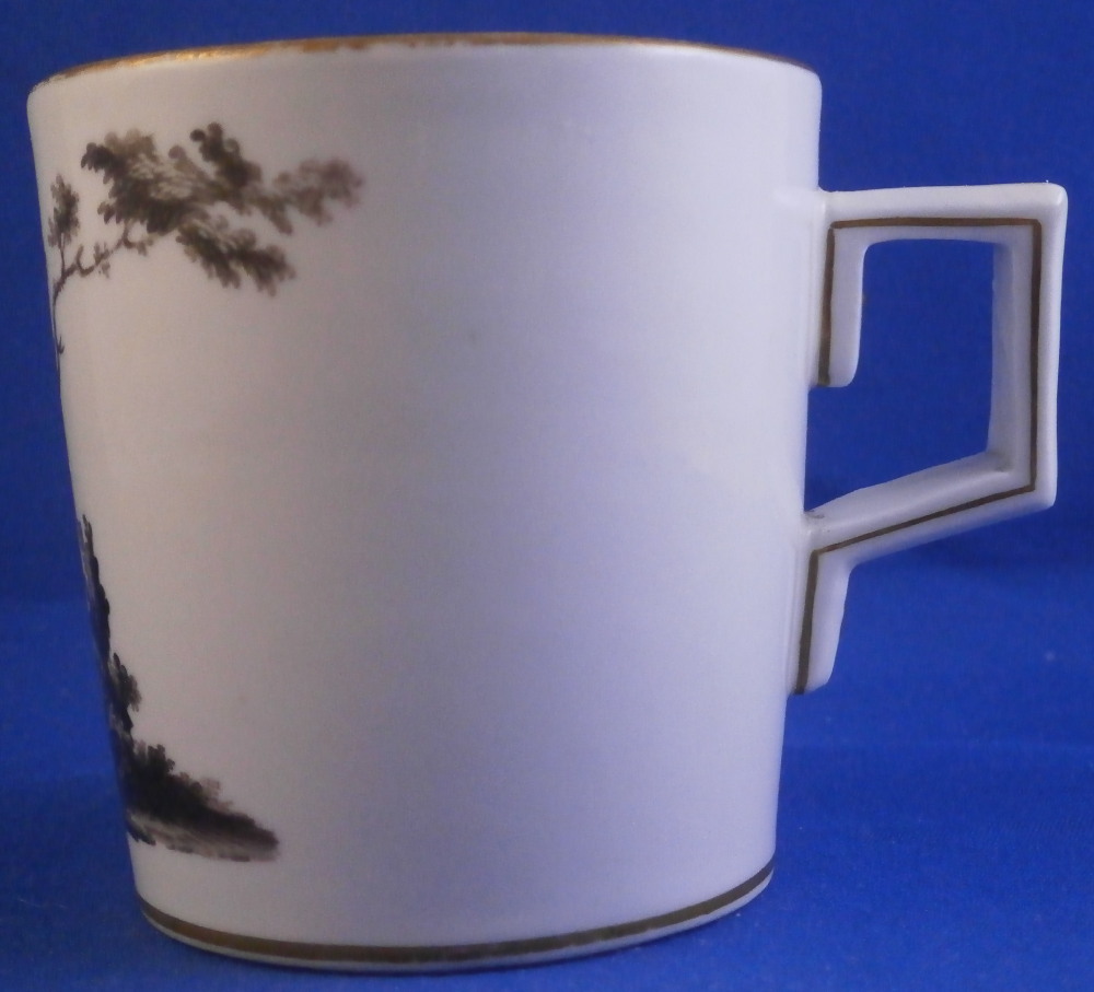 This is a cup and saucer made by Gotha in the 18th century. It is marked with just their R so from the earliest period of between 1757 and 1782. Gotha is probably the best of the Thuringia makers in terms of quality of the paste and painting. They existed from 1757 until 1937 in one form or another. This cup and saucer are each hand painted with a scene in shades of black typical for this maker. One on the front of the cup and the center of the saucer. A bit of gold trim to the edges and handle. Typical handle shape with the "screws" to attach the handle - a nice feature on cups from this area which I really like. Off course they are jsut made to look like the ehads of scrws and are part of the porcelain. The set is in gresat condition with just some very minor wear but the set displays perfectly! Both pieces are marked underneath with the underglaze blue R. mark as shown. The cup is 2.625 inches tall and 2.5 inches in diameter. The saucer is 1.25 inches tall and 5.25 inches in diameter. Please email me for more information or photos.