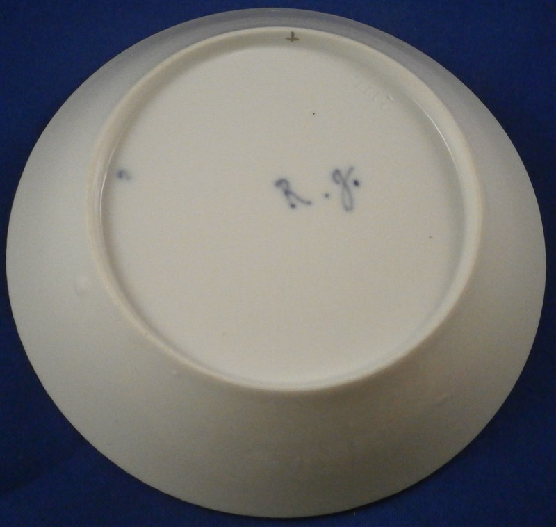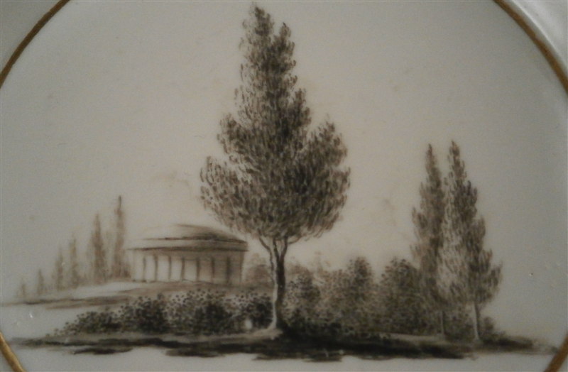 This is a saucer made by Gotha around 1790. Another superb example of Gotha's work - it is in the classicism style and has a hand painted scene in schwarzlot ( black ) in the center including a round building as well as lots of trees. Nice gold trim around the well of the saucer and on the edge. The piece is in great condition with a little wear to the gold trim. The saucer is marked underneath with the underglaze blue R.g. mark, a blue number 2 andan impressed 2 RFL or something along those lines and a T in black which might be a painter's mark. The saucer is 5 inches in diameter and 1.125 inches tall. Please email me for more information or photos.
