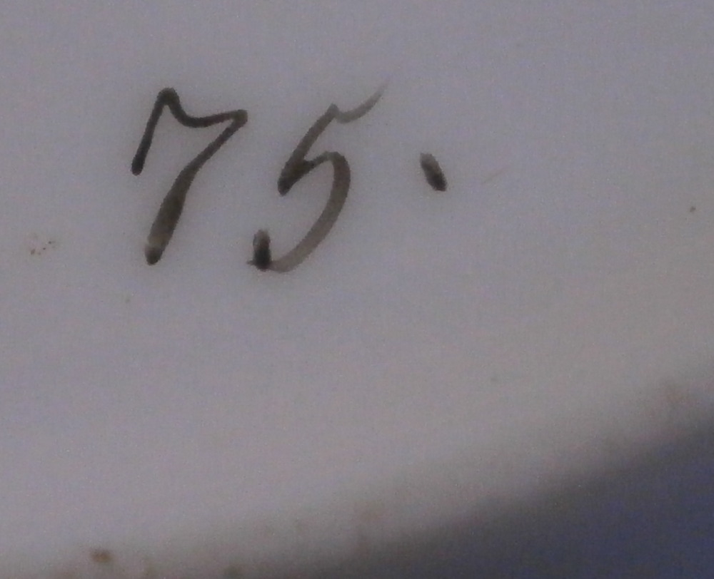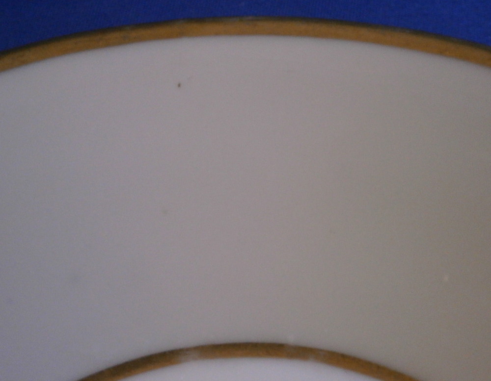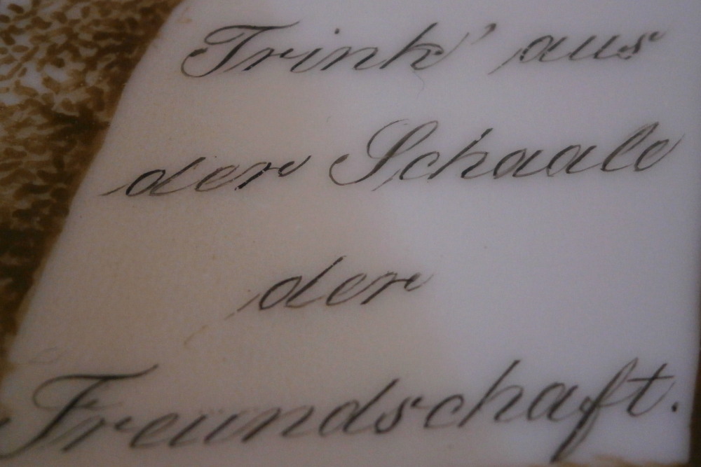 This is a saucer made by Gotha around 1815. It is another superb example of Gotha's work - it is in the classicism style and has a hand painted ruin landscape scene in sepia (brown tones) on the inside of the saucer. It includes a ruin in the background, some bushes and a large stone with the inscription: Trink aus der Schaale der Freundschaft which translates to: Drink from this bowl of friendship. Simple gold trim around the well edge and rim edge. A nice piece with a mark one does not see often. The piece is in great condition with the most minimal of wear. The dish is marked underneath with the over glaze black script G. mark as well as the number 75. as shown. The piece is 5 inches in diameter and 1.125 inches tall. Please email me for more information or photos.
