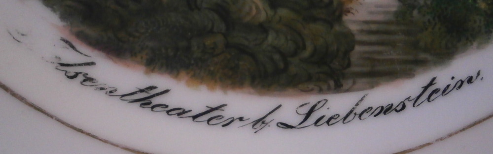 This is a great scenic plate made by Gotha in the mid 19th century. Gotha is probably the best of the Thuringia makers in terms of quality of the paste and painting. They existed from 1757 until 1937 in one form or another. This plate is hand painted with a nice quality large scene filling the entire well of the plate and a nice gold trim. The name under this scene is Felsentheater b. (bei) Liebenstein it shows the theater cut into rocks with some nice trees and greenery. Really nice looking scene! Thin gold trim around the edge of the well with a thin and a wide gold band around the edge of the plate. The plate is in good condition with some minor wear to the gilding and some stacking wear to the title and one spot in the trees on the right. It displays very nicely! It is marked underneath with the impressed mark of a hen on a hill in an oval and an impressed 3 as shown. The plate is 8 inches in diameter and 1 inch tall. Please email me for more information or photos.