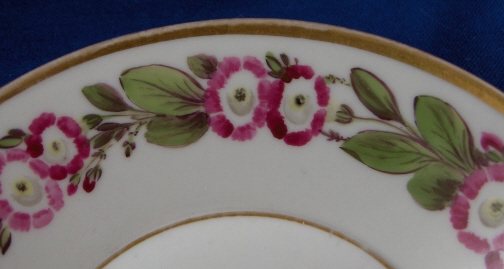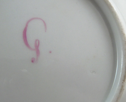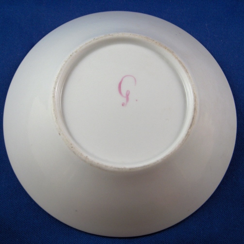 This is a saucer made by Gotha around 1820. Gotha is probably the best of the Thuringia makers in terms of quality of the paste and painting. They existed from 1757 until 1937 in one form or another. This saucer is handpainted with a nice floral design on the rim as well as a gold trim to the edge and around the well. Superb quality of painting. The saucer is in great condition with just a little wear to the gold trim. It is marked underneath with the overglaze script G. mark as well as an impressed number 5 or something like that. The saucer is 1.125 inches tall and 5.125 inches in diameter. Please email me for more information or photos.