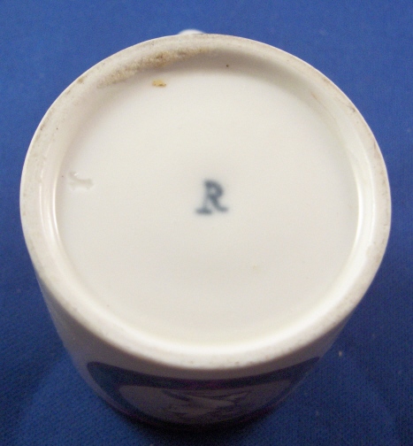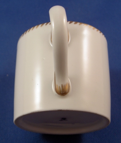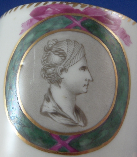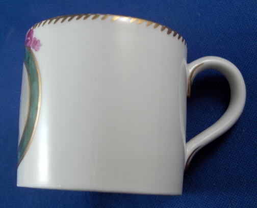 This is a cup made by Gotha around 1775. Gotha is probably the best of the Thuringia makers in terms of quality of the paste and painting. This cup is another superb example of Gotha's work. It is handpainted with a scene in the front of a lady's bust surrounded by a green wreath held up by a puce bow on top. Nice gold trim to the rim and handle. The cup is in great condition with a tiny bit of gold wear to the top rim and a scratch in the grey area behind the lady's bust. It is are marked underneath with the underglaze blue R mark as well as an impressed r. The cup is 1.875 inches tall and 2 inches in diameter. Sadly there is no saucer with it. Please email me for more information or photos.
