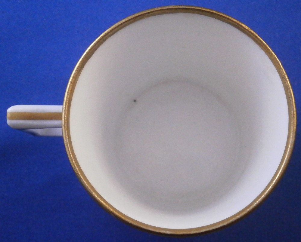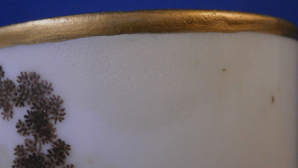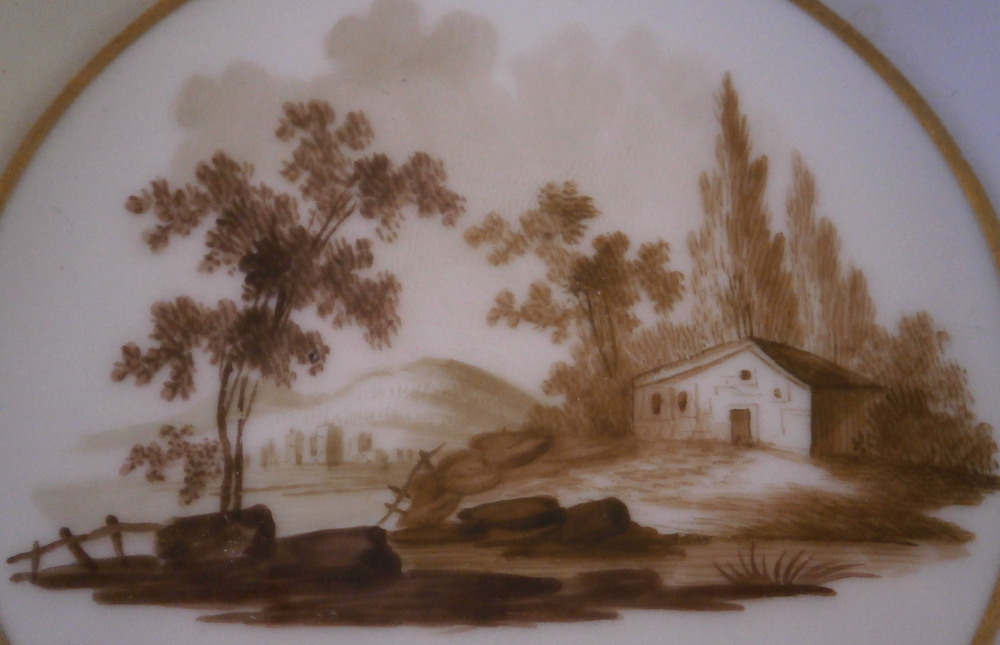 This is a cup and saucer made by Gotha in the 18th century. Gotha is probably the best of the Thuringia makers in terms of quality of the paste and painting. They existed from 1757 until 1937 in one form or another. This cup and saucer are each hand painted with a scene in sepia colors typical for this maker. One on the front of the cup and the center of the saucer. A bit of gold trim to the edges and handle. The set is in good condition with a well restored small chip to the top edge of the cup. The overspray has yellowed a touch and that is the only reason why one can find it. It was well done! So they displays very nicely! A bit of wear to the gilding on the handle and just a touch to the edge of the saucer and a tiny nibble to the foot ring of the saucer from when it was made. Both pieces are marked underneath with the underglaze blue R. g. mark as well as some incised / impressed marks normal to their wares. The cup is 2.375 inches tall and 2.5 inches in diameter. The saucer is 1.125 inches tall and 5 inches in diameter. Please email me for more information or photos.