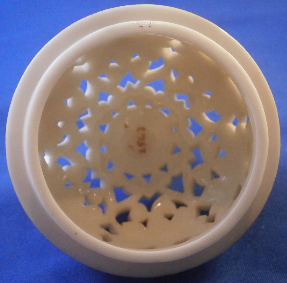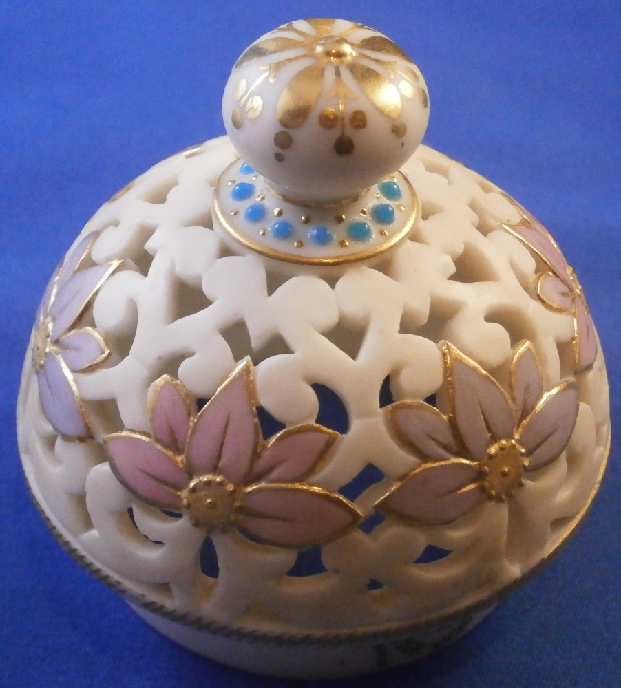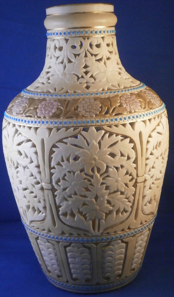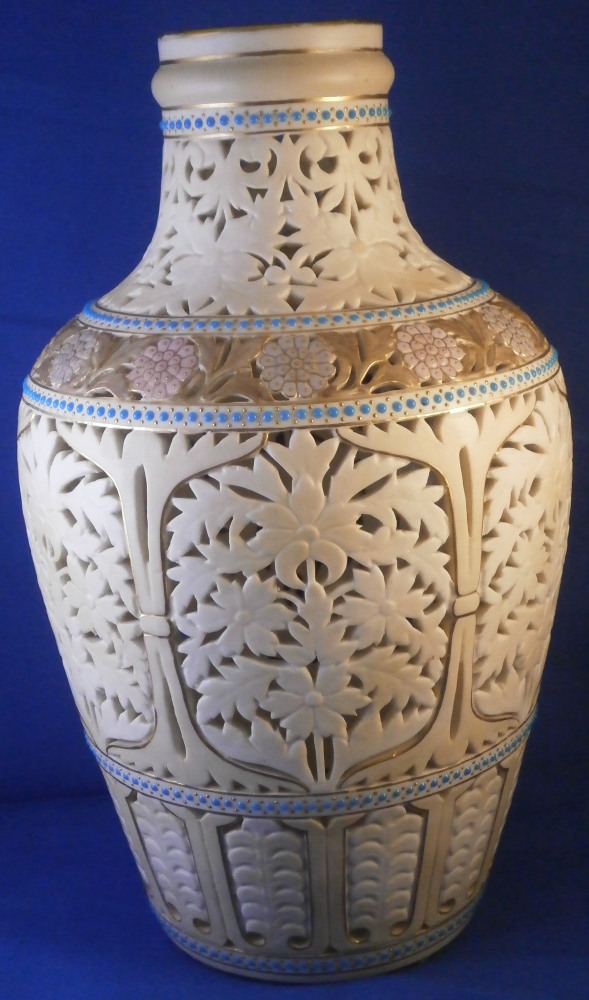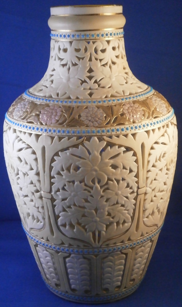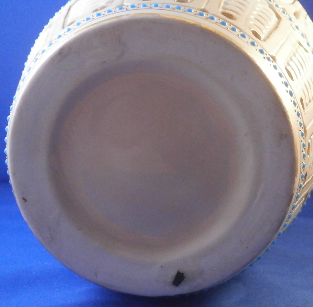 This is a large and really neat reticulated lidded vase made by Grainger Worcester in the late 19th century. Thomas Grainger was originally an apprentice at Royal Worcester before forming his own company around 1801. After his death in 1839, his son George took over. Most of the pierced vases, like this one, were mostly made by Alfred Barry. He was their George Owen :) Royal Worcester acquired the Grainger firm in 1889 before this piece was made but ran the two factories in parallel for a while until completely absorbing it. This vase here is from this parallel period. .One sees their reticulated pieces fairly often but one of this size with the added "jewel" decoration and its original lid is certainly something special. I really like this piece! There are four different reticulated designs and separating each design is a line of blue "jewels" with little gold dots. The top design is a ring of flowers left unpainted, Next is a thin ring of painted flowers with its pink blossoms and brown leaves all with gold highlights. Then a section of floral panels separated by columns and the last section is a fern leaf style design. Simple gold trim to the top and bottom edge. The porcelain has an ivory color to it with some parts that are a bit darker than others. The lid has a pink and purple flowers design to it with the rest being ivory colored. Round finial with a bit of gold trim and the same blue "jewels" design right under the finial. It's an amazing piece and surprisingly in superb condition with just some wear to the gold trim along the top and bottom edge. Nothing that takes away from the piece!. The vase is only marked on the lid ring that fits inside the vase and is thus mostly hidden. Marked with the Grainger and Co Worcester mark as well as some numbers in red on the inside of the lid as shown. The piece is 13.25 inches tall and 6.5 inches in diameter. Please email me for more information or other pictures.
