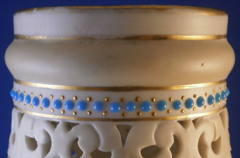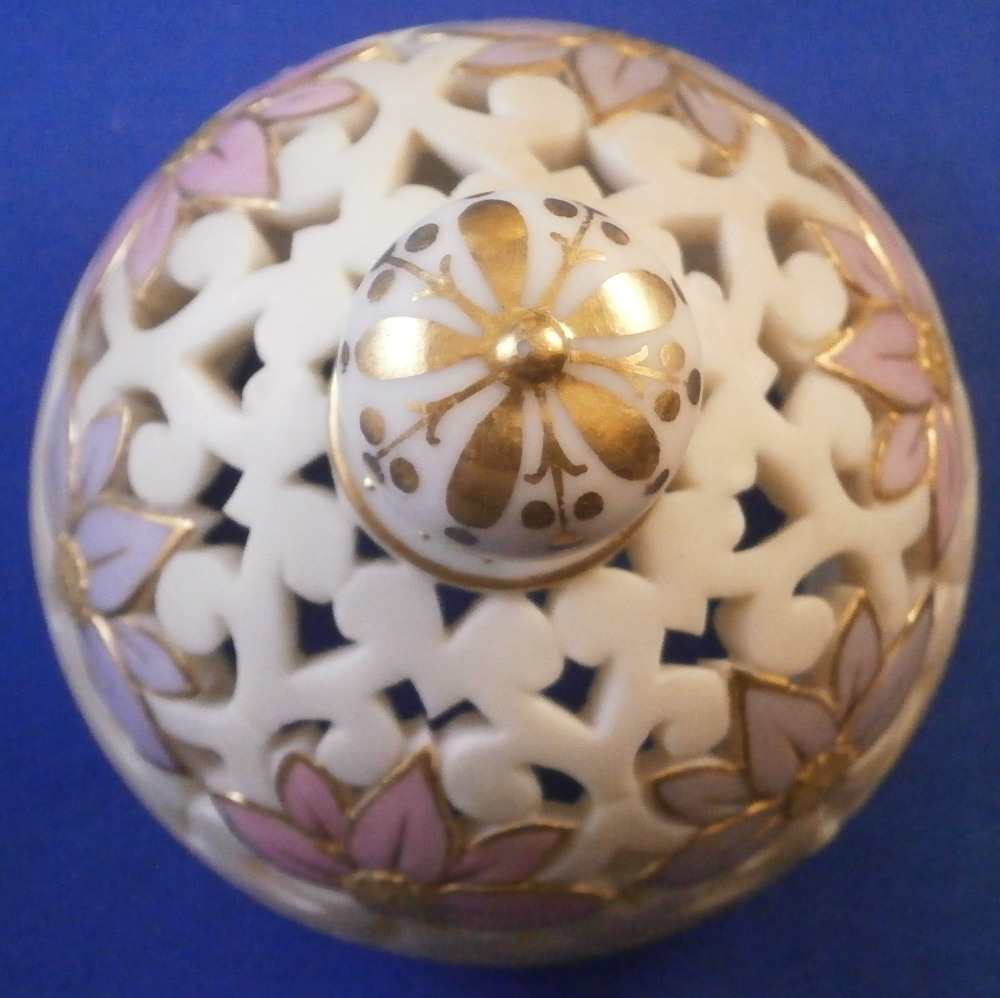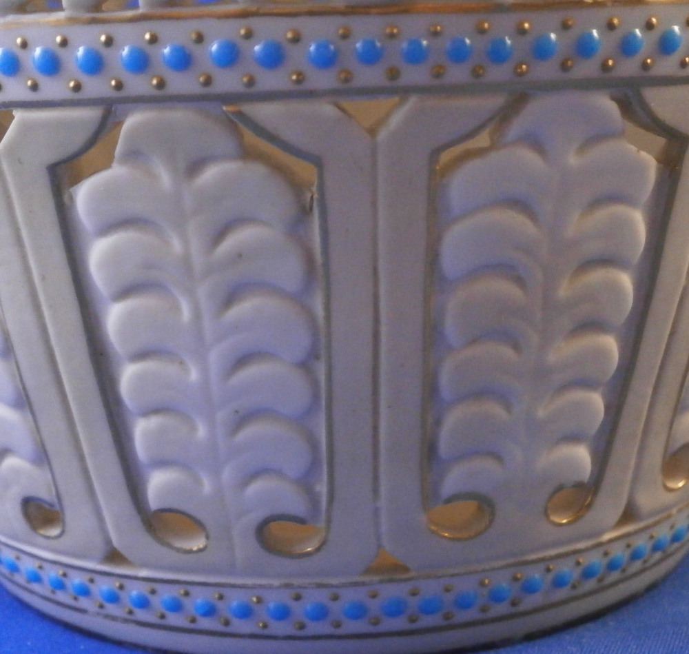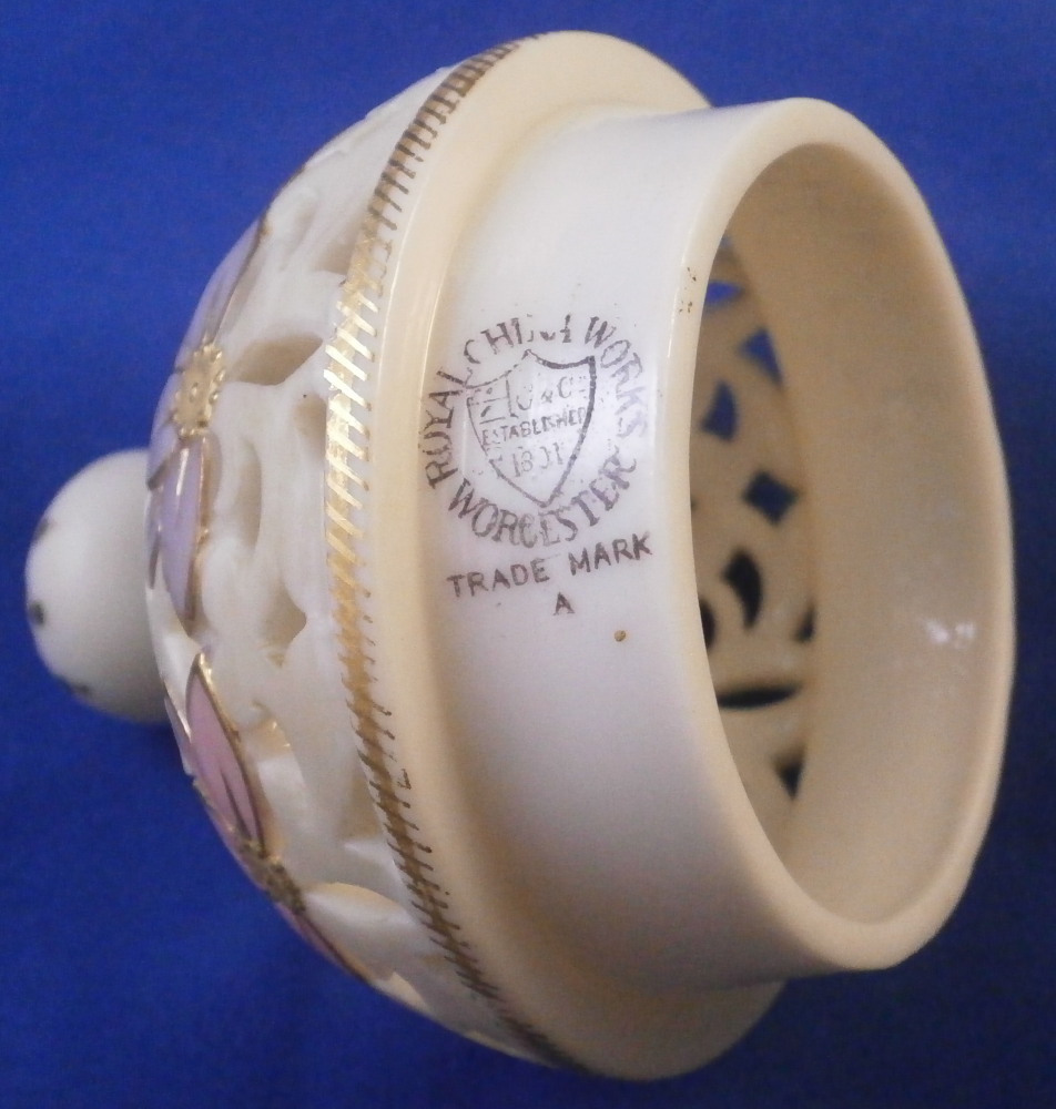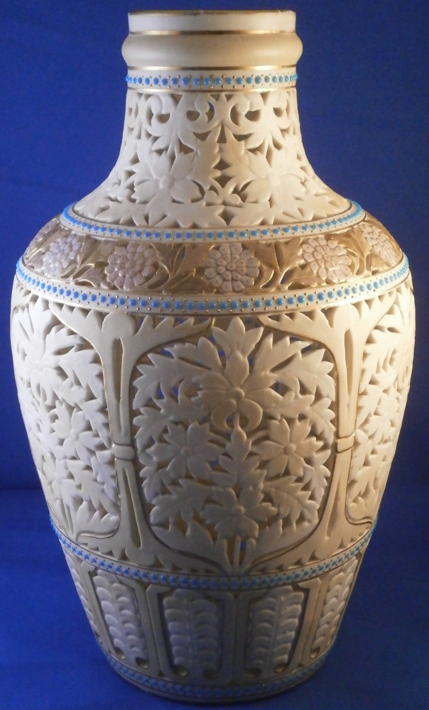 This is a large and really neat reticulated lidded vase made by Grainger Worcester in the late 19th century. Thomas Grainger was originally an apprentice at Royal Worcester before forming his own company around 1801. After his death in 1839, his son George took over. Most of the pierced vases, like this one, were mostly made by Alfred Barry. He was their George Owen :) Royal Worcester acquired the Grainger firm in 1889 before this piece was made but ran the two factories in parallel for a while until completely absorbing it. This vase here is from this parallel period. .One sees their reticulated pieces fairly often but one of this size with the added "jewel" decoration and its original lid is certainly something special. I really like this piece! There are four different reticulated designs and separating each design is a line of blue "jewels" with little gold dots. The top design is a ring of flowers left unpainted, Next is a thin ring of painted flowers with its pink blossoms and brown leaves all with gold highlights. Then a section of floral panels separated by columns and the last section is a fern leaf style design. Simple gold trim to the top and bottom edge. The porcelain has an ivory color to it with some parts that are a bit darker than others. The lid has a pink and purple flowers design to it with the rest being ivory colored. Round finial with a bit of gold trim and the same blue "jewels" design right under the finial. It's an amazing piece and surprisingly in superb condition with just some wear to the gold trim along the top and bottom edge. Nothing that takes away from the piece!. The vase is only marked on the lid ring that fits inside the vase and is thus mostly hidden. Marked with the Grainger and Co Worcester mark as well as some numbers in red on the inside of the lid as shown. The piece is 13.25 inches tall and 6.5 inches in diameter. Please email me for more information or other pictures.