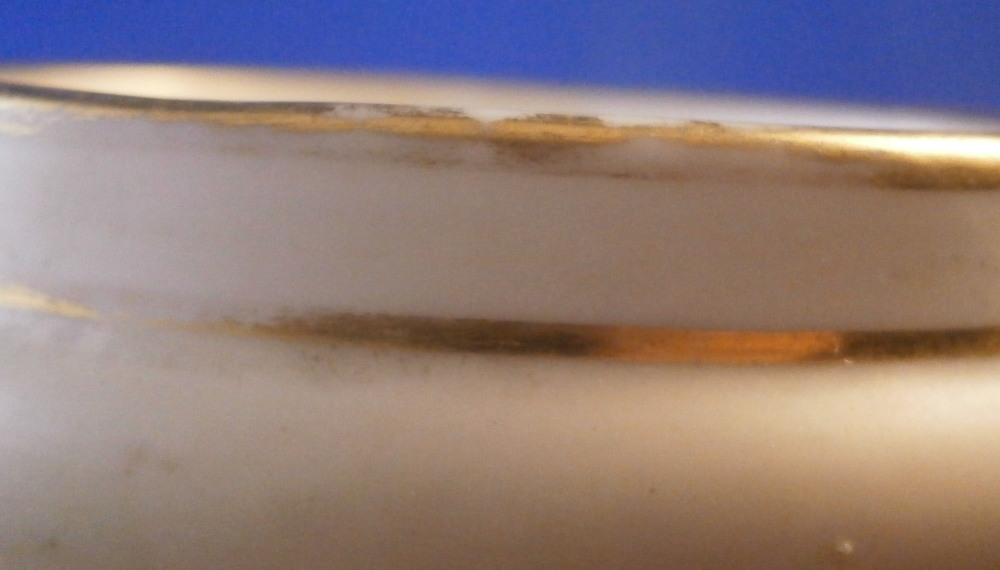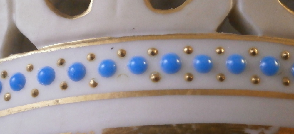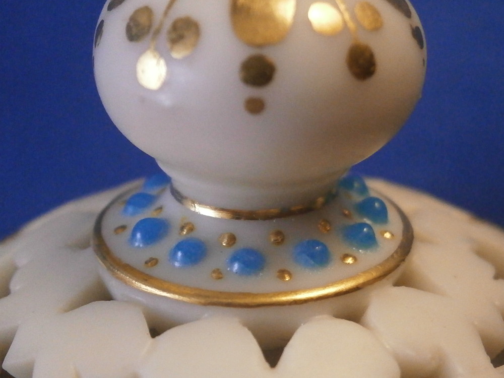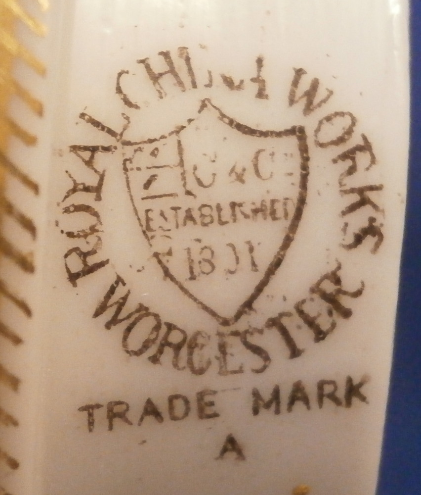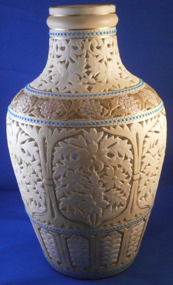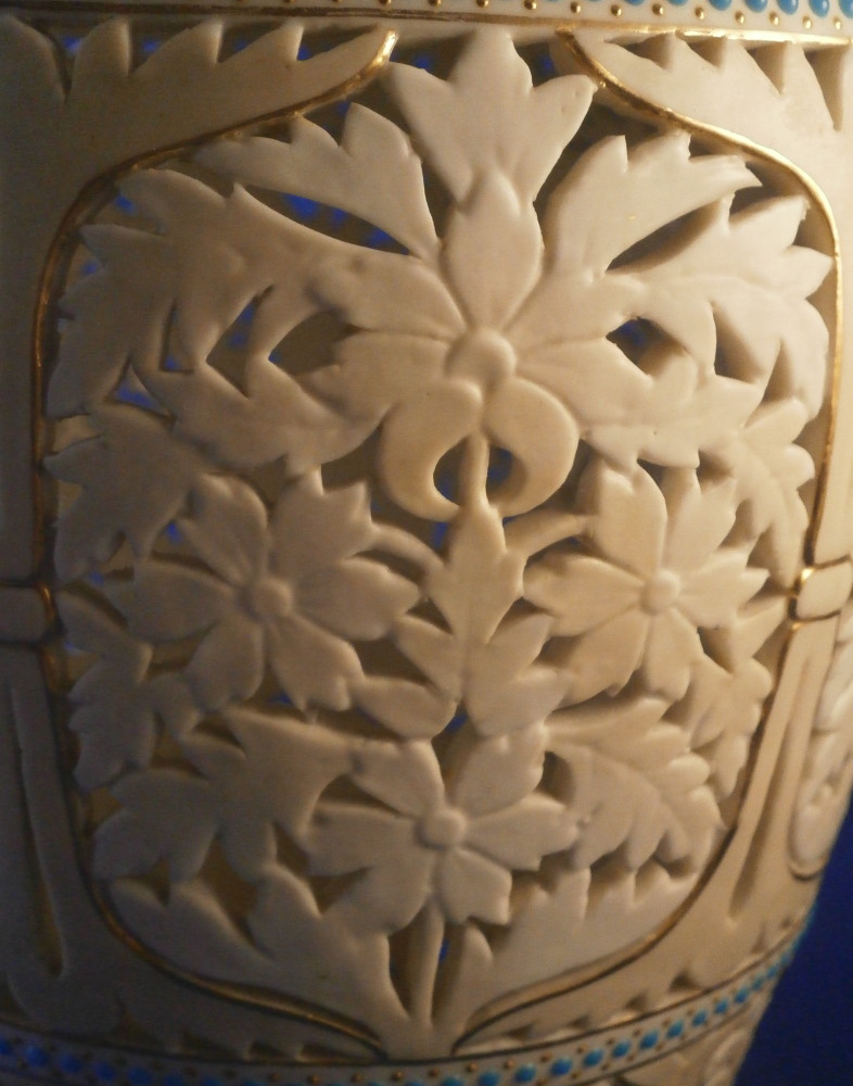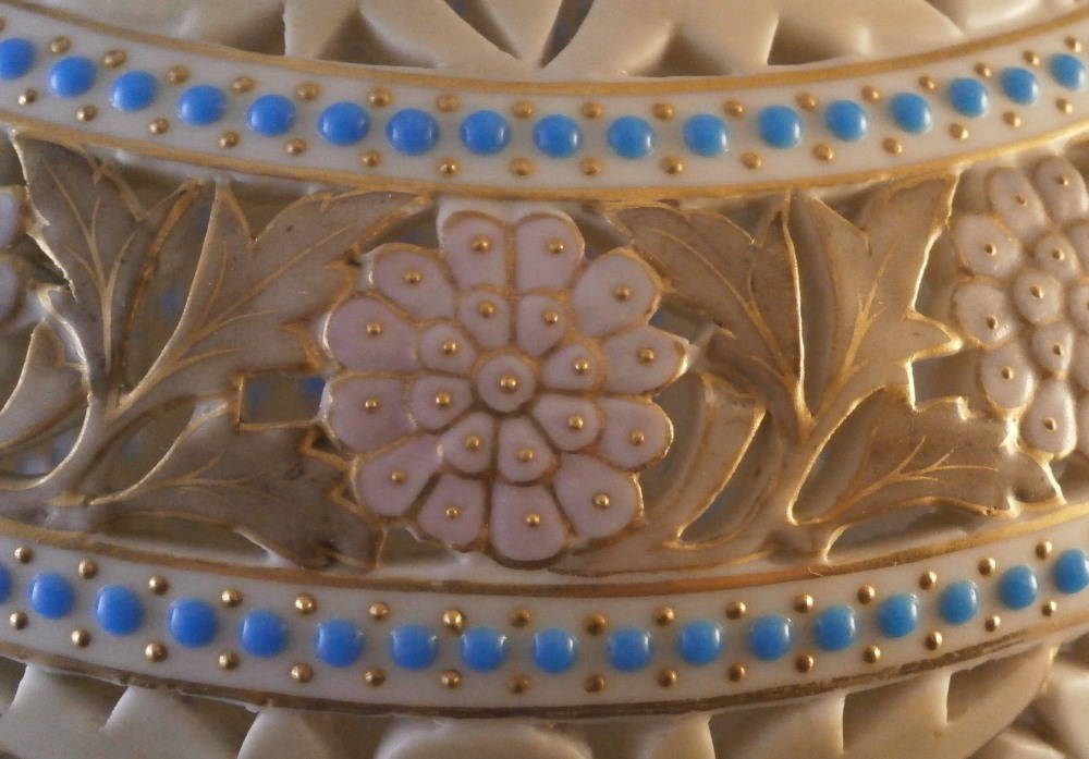 This is a large and really neat reticulated lidded vase made by Grainger Worcester in the late 19th century. Thomas Grainger was originally an apprentice at Royal Worcester before forming his own company around 1801. After his death in 1839, his son George took over. Most of the pierced vases, like this one, were mostly made by Alfred Barry. He was their George Owen :) Royal Worcester acquired the Grainger firm in 1889 before this piece was made but ran the two factories in parallel for a while until completely absorbing it. This vase here is from this parallel period. .One sees their reticulated pieces fairly often but one of this size with the added "jewel" decoration and its original lid is certainly something special. I really like this piece! There are four different reticulated designs and separating each design is a line of blue "jewels" with little gold dots. The top design is a ring of flowers left unpainted, Next is a thin ring of painted flowers with its pink blossoms and brown leaves all with gold highlights. Then a section of floral panels separated by columns and the last section is a fern leaf style design. Simple gold trim to the top and bottom edge. The porcelain has an ivory color to it with some parts that are a bit darker than others. The lid has a pink and purple flowers design to it with the rest being ivory colored. Round finial with a bit of gold trim and the same blue "jewels" design right under the finial. It's an amazing piece and surprisingly in superb condition with just some wear to the gold trim along the top and bottom edge. Nothing that takes away from the piece!. The vase is only marked on the lid ring that fits inside the vase and is thus mostly hidden. Marked with the Grainger and Co Worcester mark as well as some numbers in red on the inside of the lid as shown. The piece is 13.25 inches tall and 6.5 inches in diameter. Please email me for more information or other pictures.